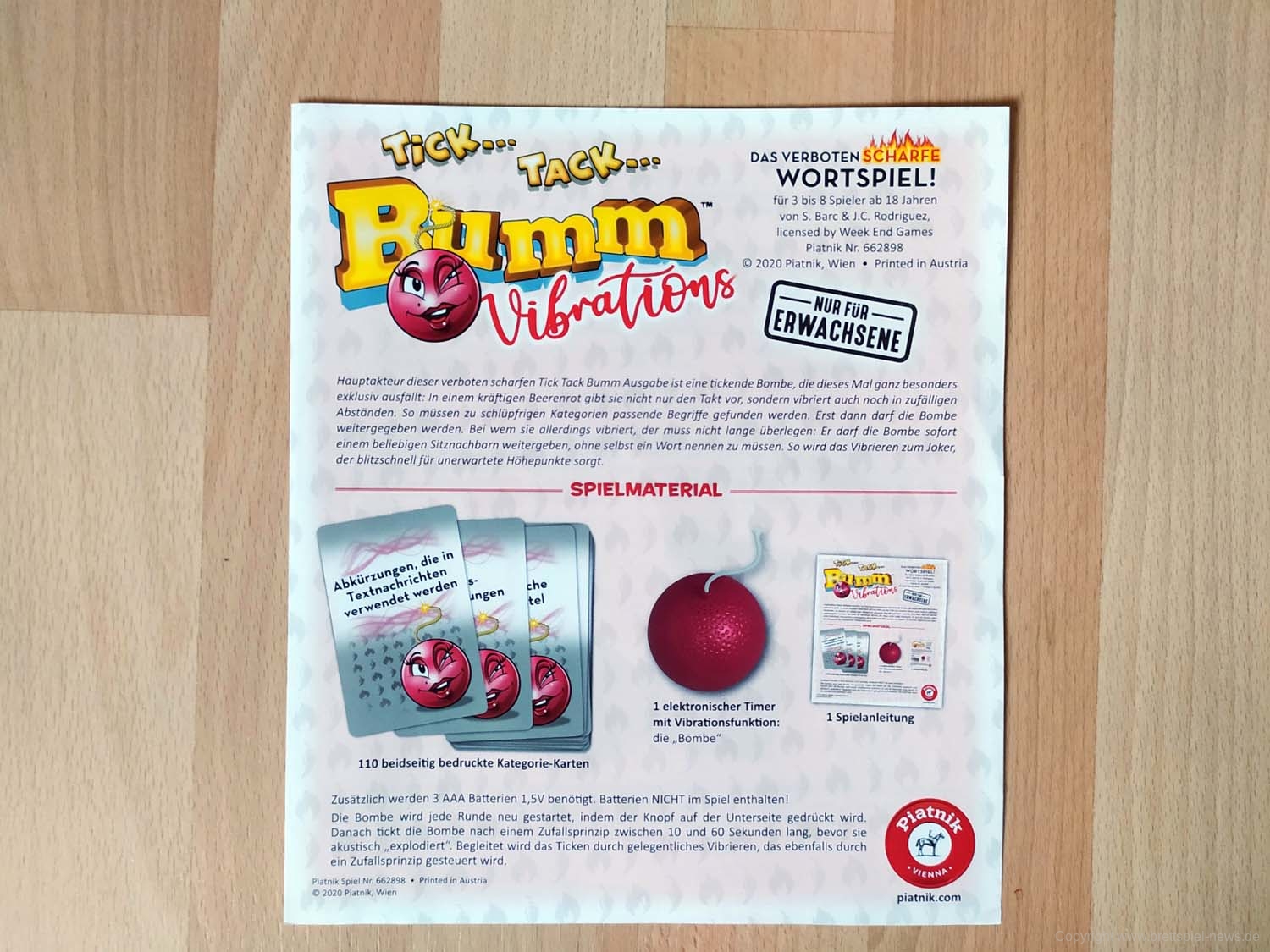 Endlich ist sie da: die Erwachsenen-Version des seit mehr als 25 Jahren beliebten und (über 8 Mio. verkauft!) erfolgreichen Partyspiels „Tick Tack Bumm" von Piatnik. In „Tick Tack Bumm Vibrations" geht es nicht nur aufgrund der gesuchten Wörter zu schlüpfrigen Kategorien heiß her.