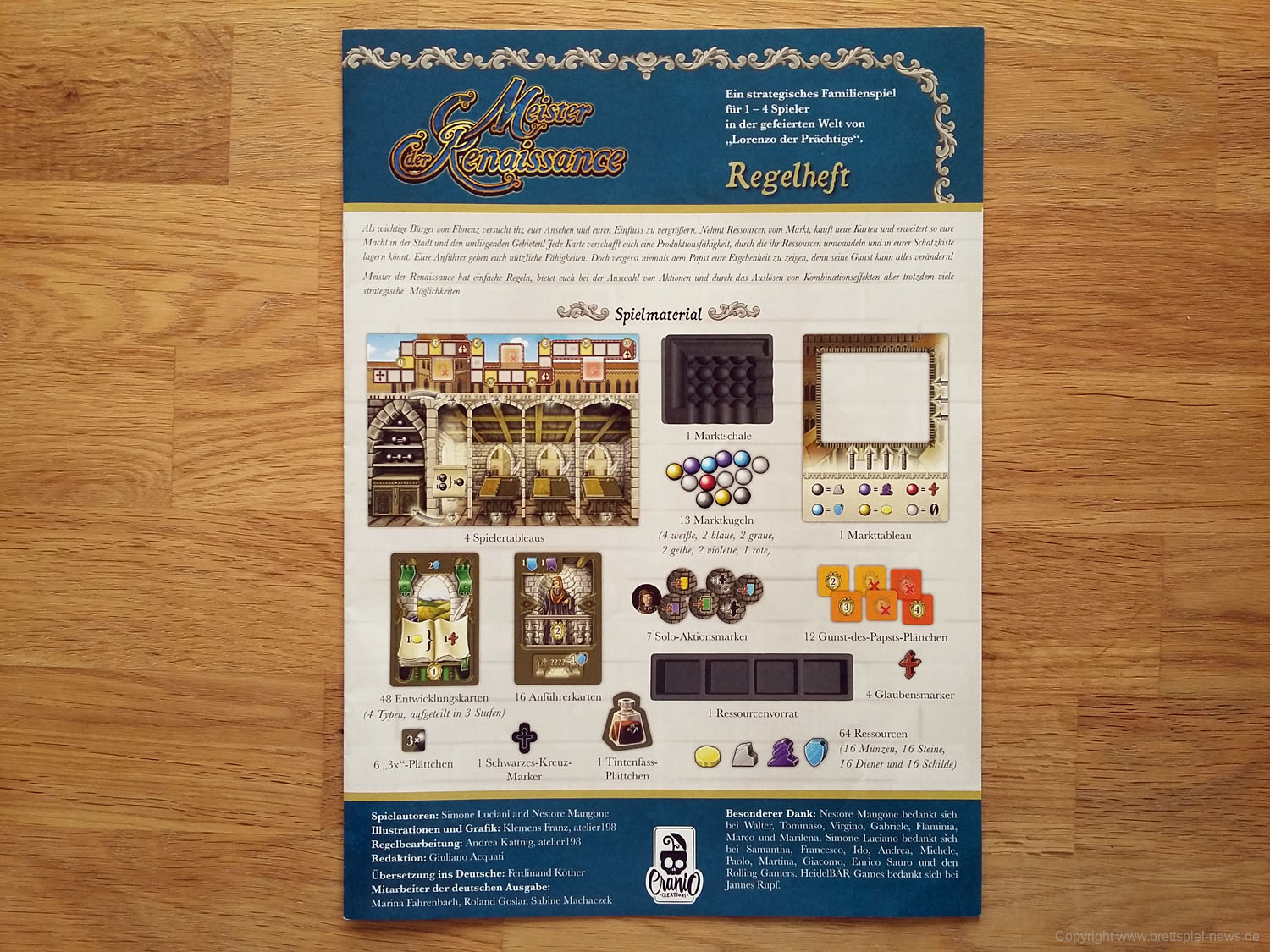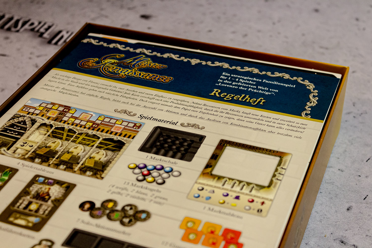 Wir haben uns ein Exemplar von MEISTER DER RENAISSANCE gekauft und zeigen nun Bilder vom Spielmaterial. Ein Test zum Spiel wird folgen! In Deutschland übernimmt der HEIDELBERGER SPIELVERLAG den Vertrieb von MEISTER DER RENAISSANCE. Es handelt sich hierbei um ein Kartenspiel, dass auf Brettspiel LORENZO DER PRÄCHTIGE basiert. Das neue Spiel richtet sich an 1-4 Spieler ab 14 Jahren.