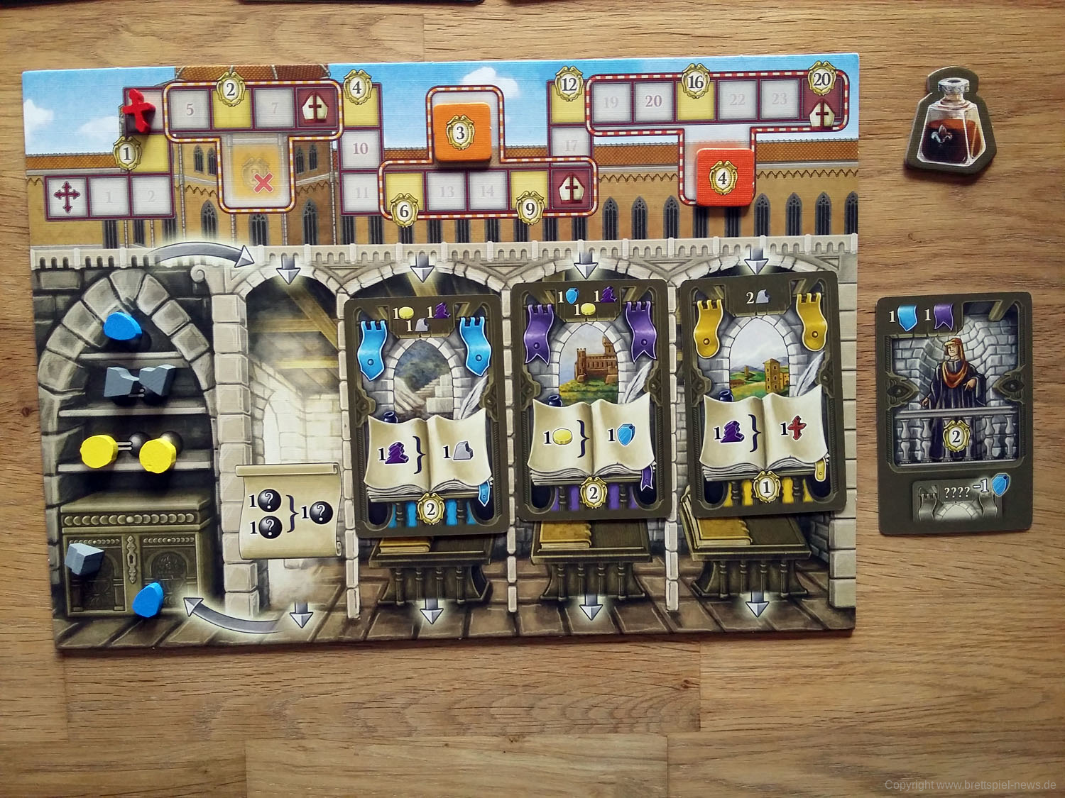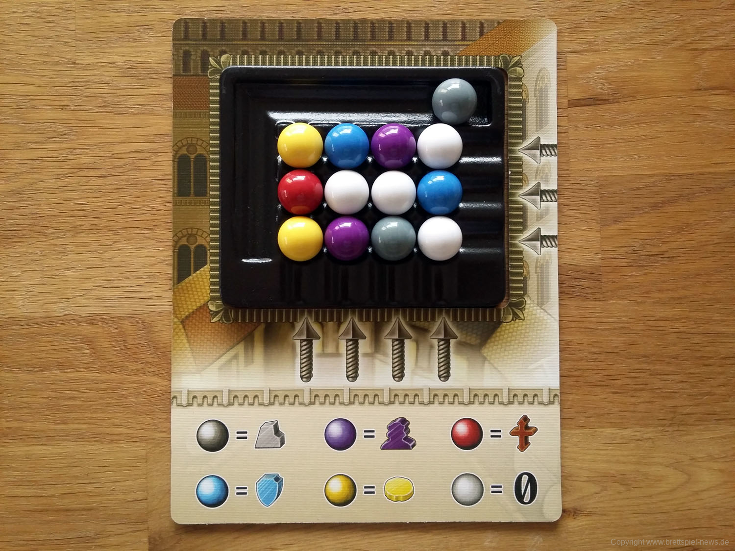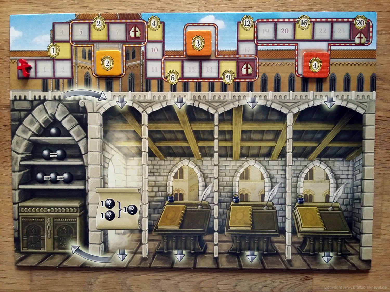 Jede Karte verschafft euch eine Produktionsfähigkeit, durch die ihr Ressourcen umwandeln und in eurer Schatzkiste lagern könnt. Eure Anführer geben euch nützliche Fähigkeiten. Doch vergesst niemals dem Papst eure Ergebenheit zu zeigen, denn seine Gunst kann alles verändern!