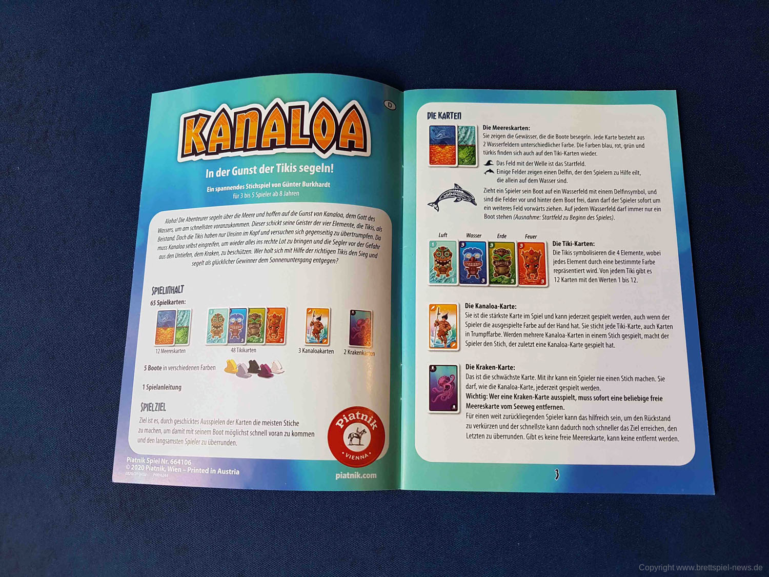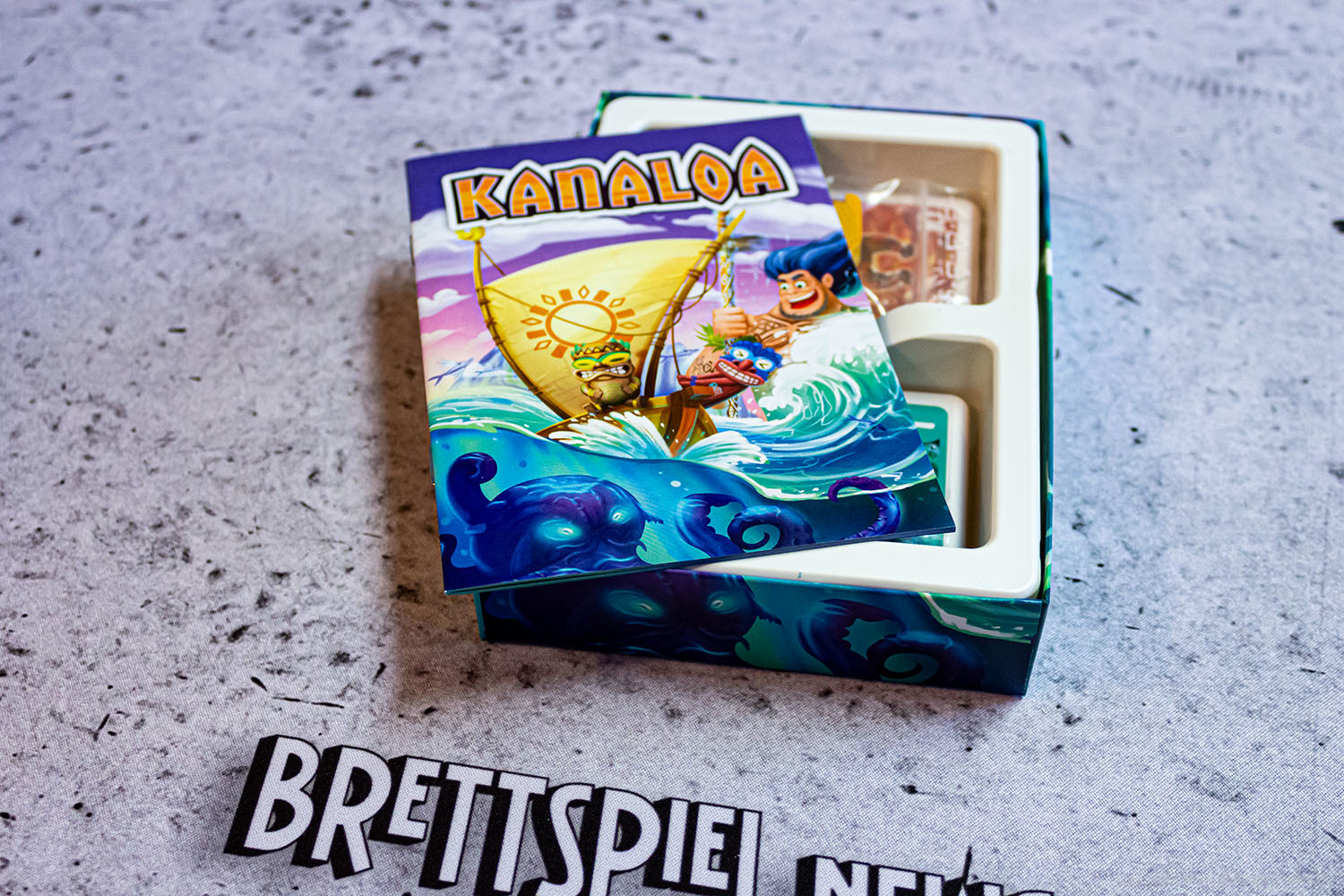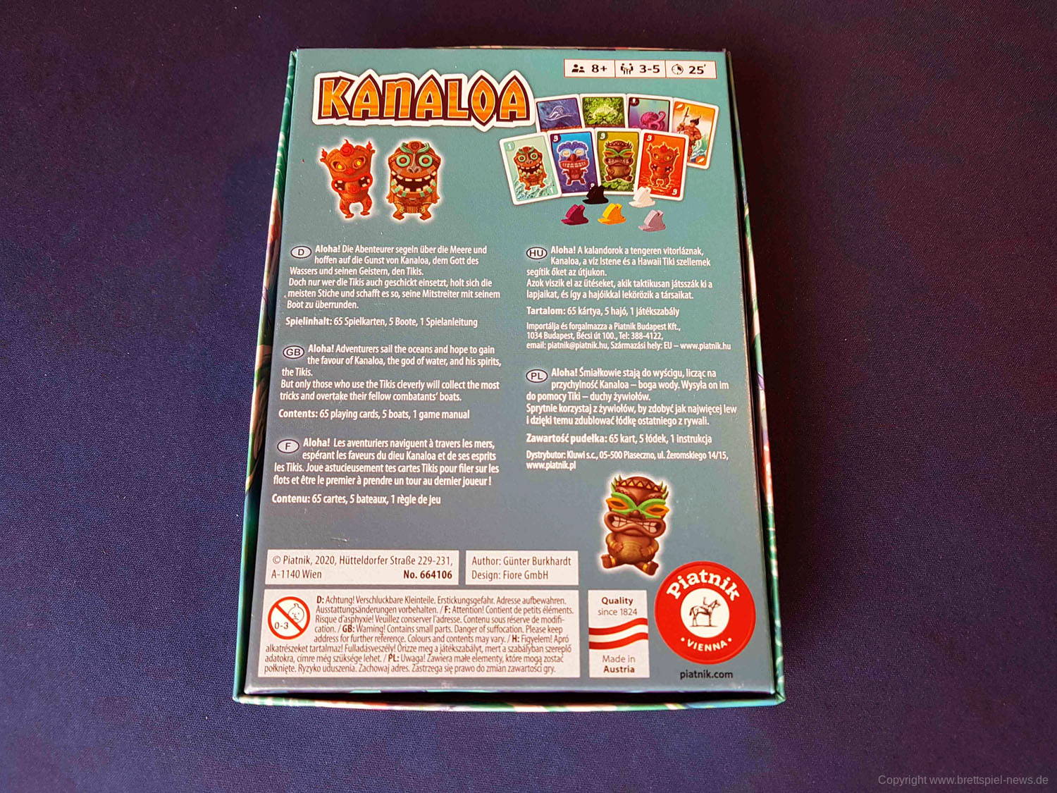Die Neuheit KANALOA von PIATNIK wird in Kürze im Handel eintreffen. Wir haben bereits vorab ein Exemplar erhalten und zeigen hier erste Bilder des Kartenspiels. Das Spiel ist mit 3-5 Spielern spielbar, und dauert rund 25 Minuten. Der Autor ist GÜNTER BURKHARDT. Der Preis liegt bei unter acht Euro, was bei der Produktionsqualität als echt fair anzusehen ist. Neben den Karten sind noch vier Holzschiffe in der Verpackung und ein Kunststoff Inlay ist auch vorhanden, die Grafik ist farbenfroh und durchaus ansehnlich.