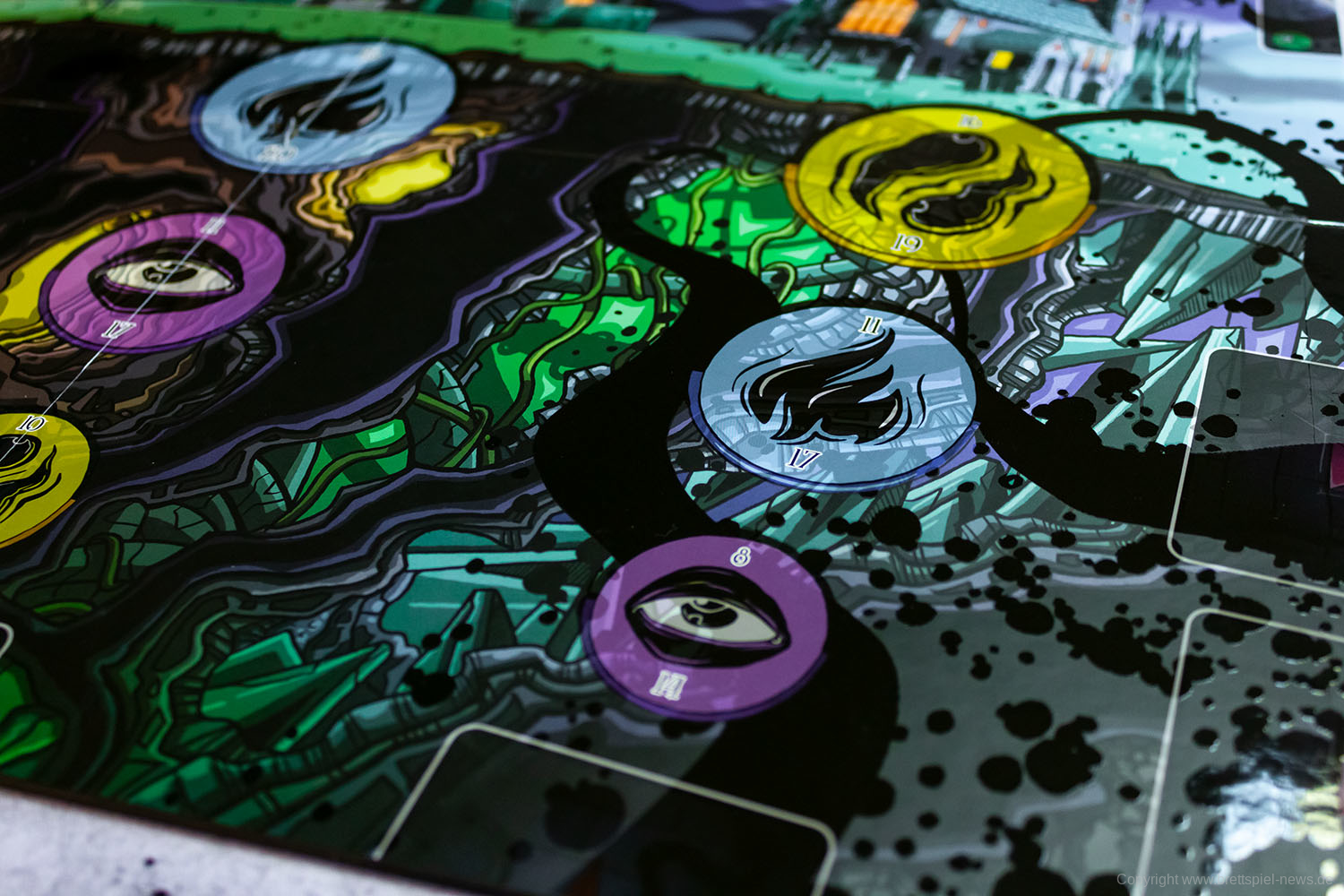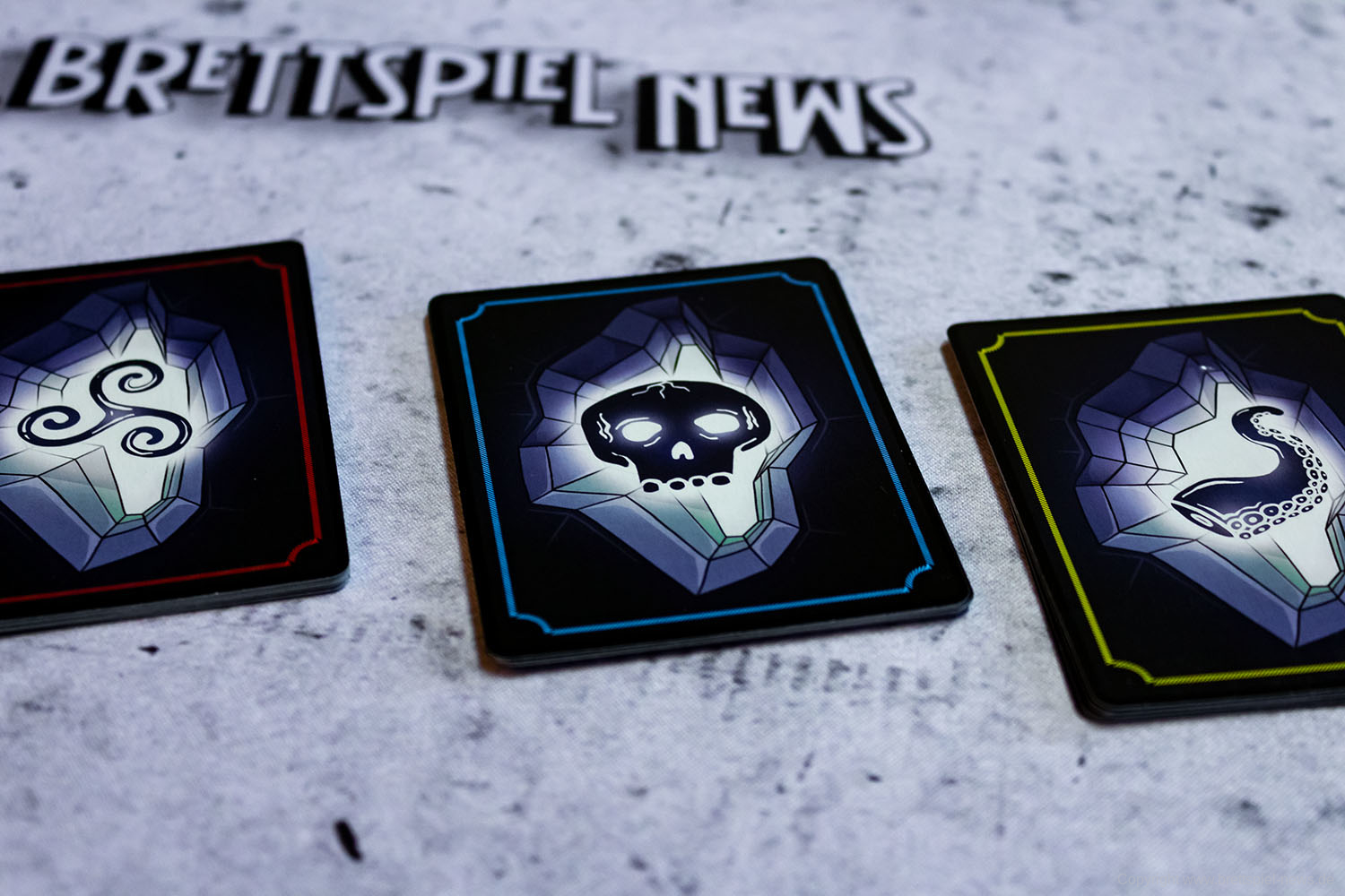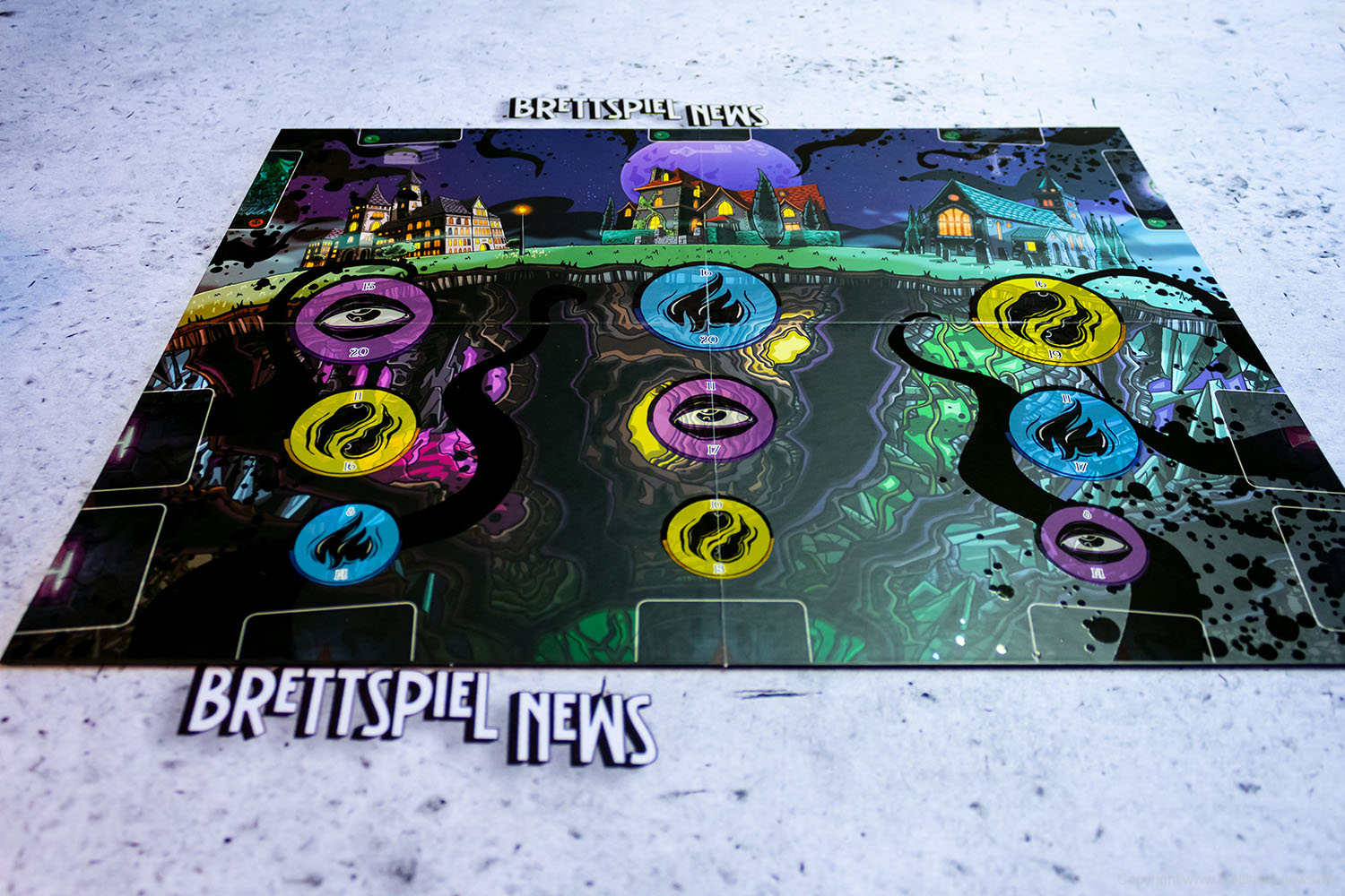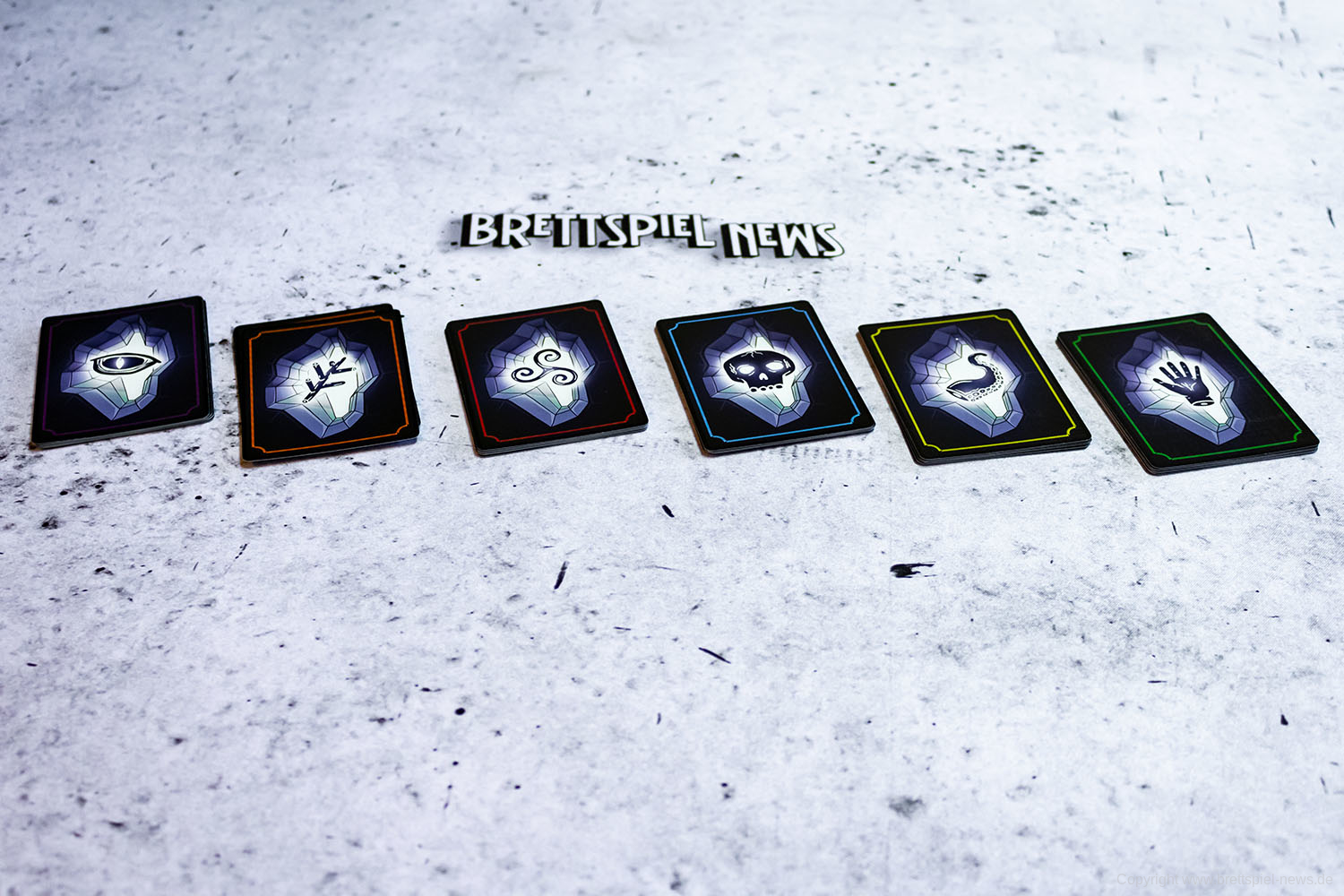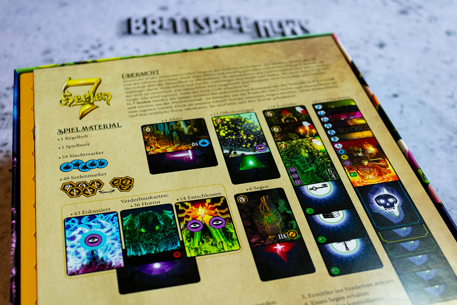 Wir haben ein Exemplar der Neuheit 7 SEELEN vom SCHWERKRAFT VERLAG gekauft und zeigen nun erste Bilder des Spiels. Das Spielmaterial macht einen guten Eindruck und auch die Grafik ist mit einem eigenen prägnanten Stil versehen. Das Spielfeld ist teilweise mit Glanzdruckfarbe bedruckt, was zu schönen Kontrastverhältnissen führt. 7 SEELEN richtet sich an 1-6 Spieler ab 8 Jahren und bietet Spielrunden von 30-40 Minuten Spielzeit.