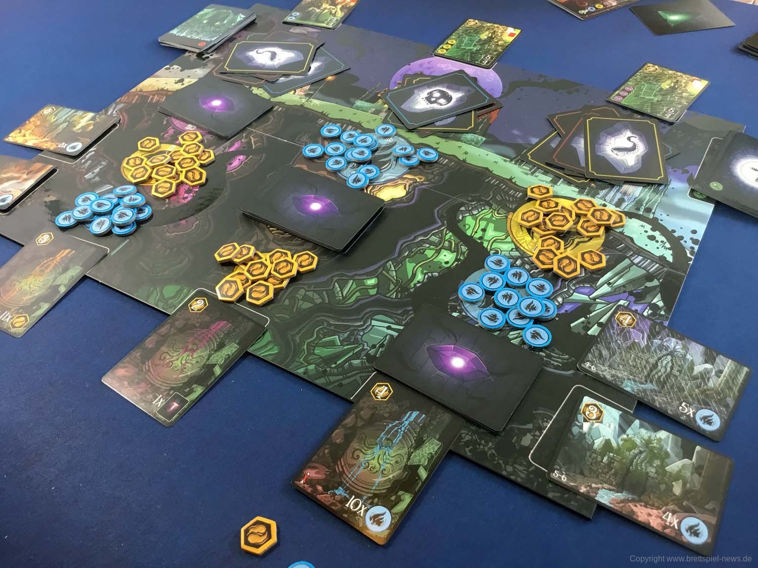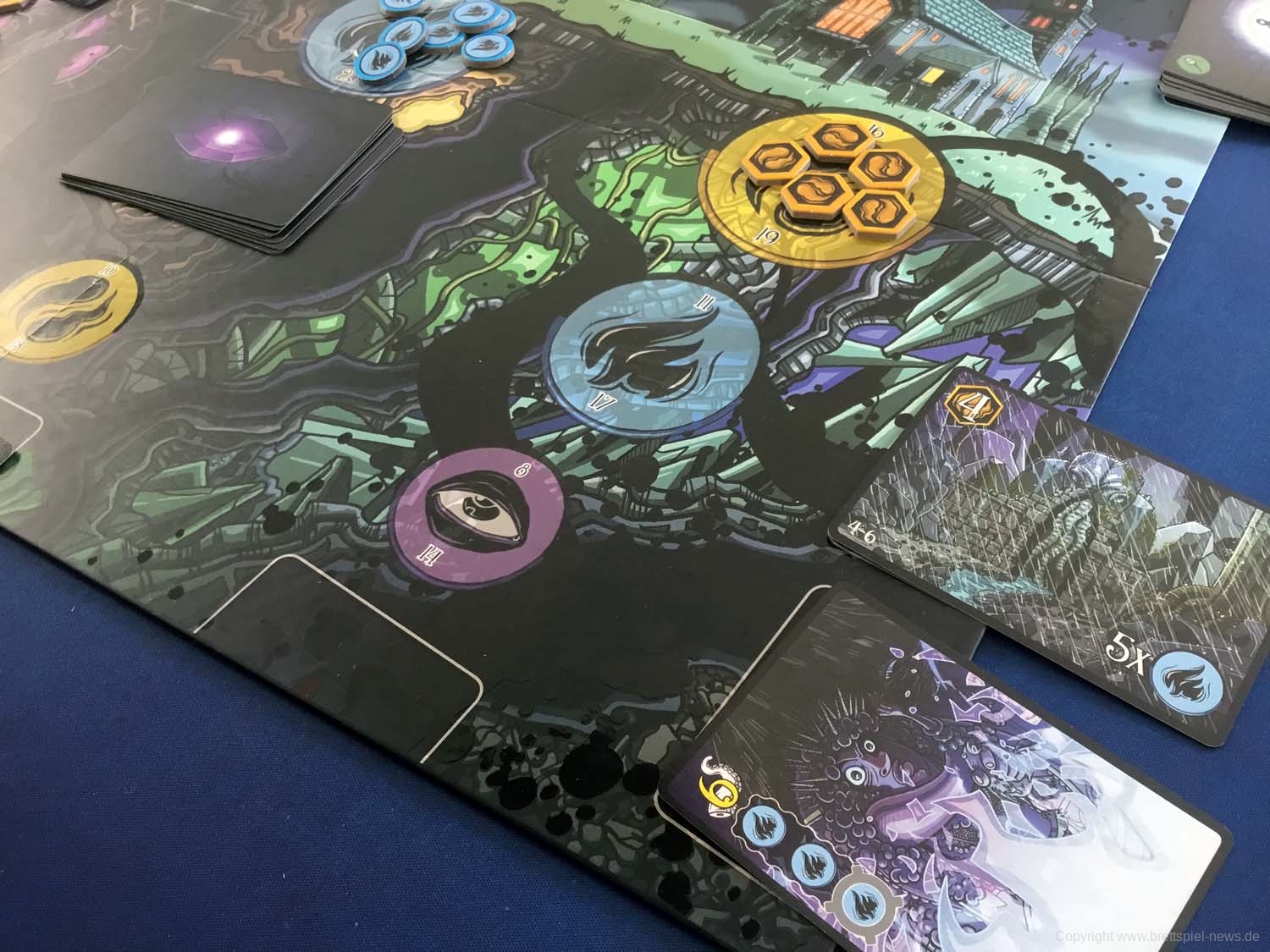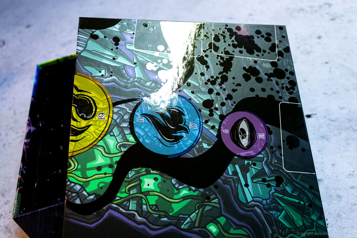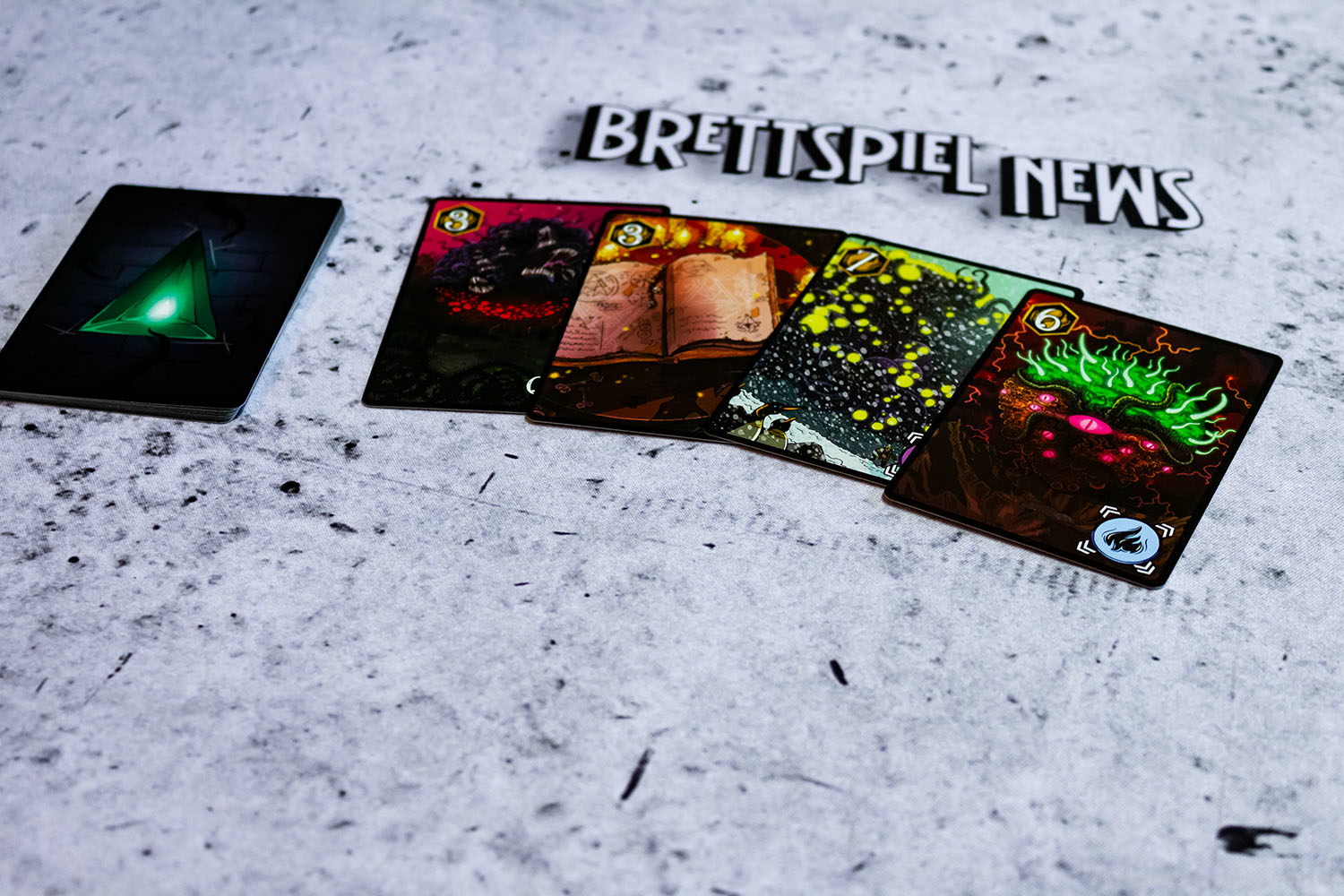 Wir haben ein Exemplar der Neuheit 7 SEELEN vom SCHWERKRAFT VERLAG gekauft und zeigen nun erste Bilder des Spiels. Das Spielmaterial macht einen guten Eindruck und auch die Grafik ist mit einem eigenen prägnanten Stil versehen. Das Spielfeld ist teilweise mit Glanzdruckfarbe bedruckt, was zu schönen Kontrastverhältnissen führt. 7 SEELEN richtet sich an 1-6 Spieler ab 8 Jahren und bietet Spielrunden von 30-40 Minuten Spielzeit.