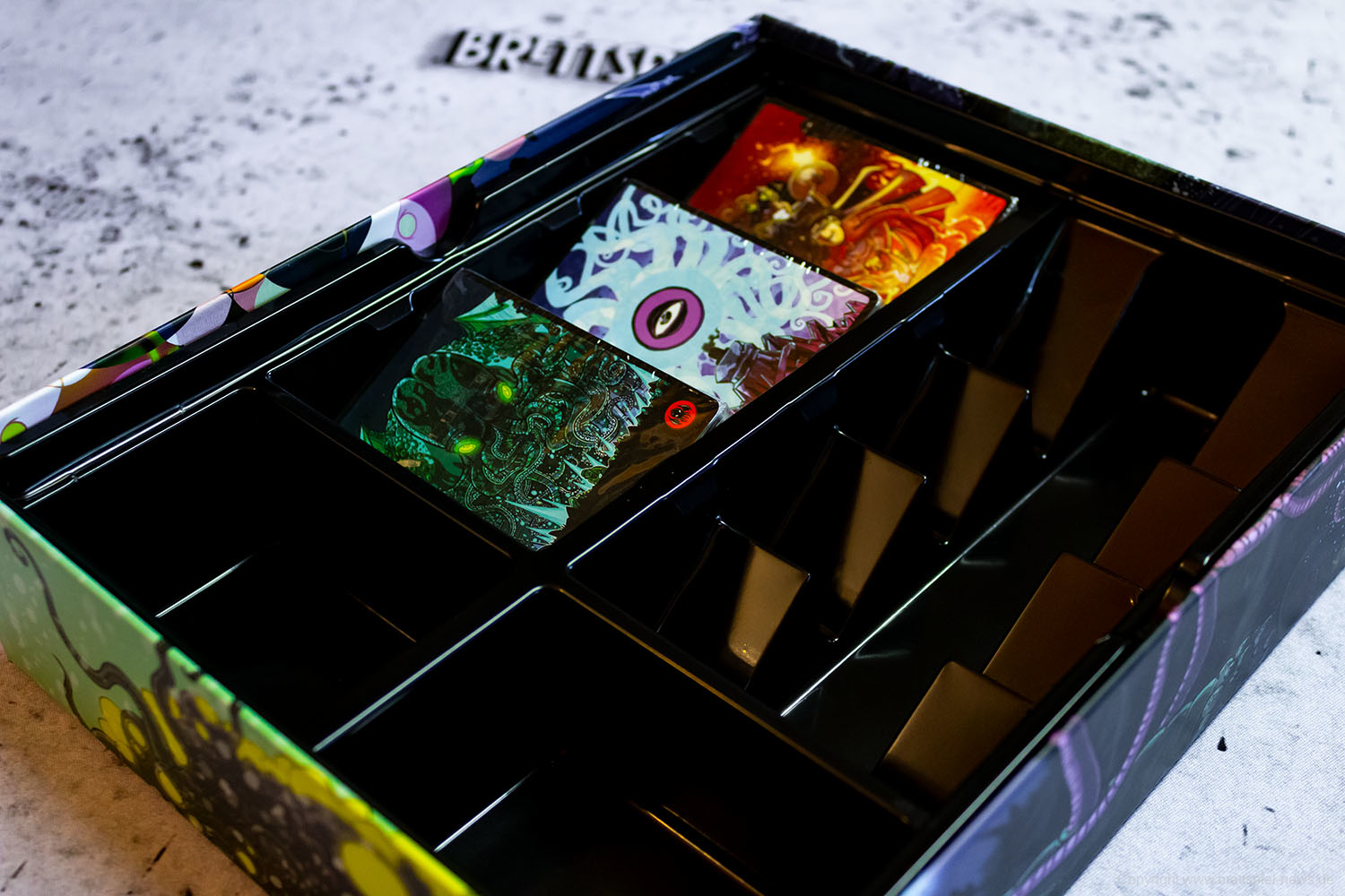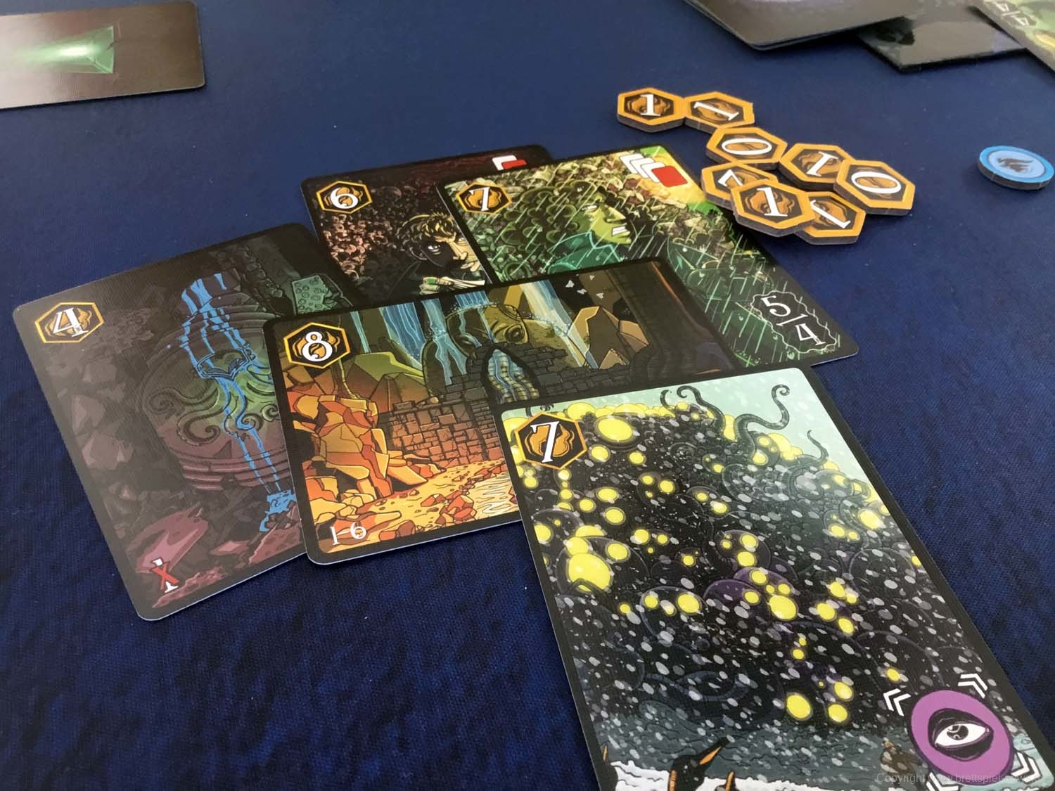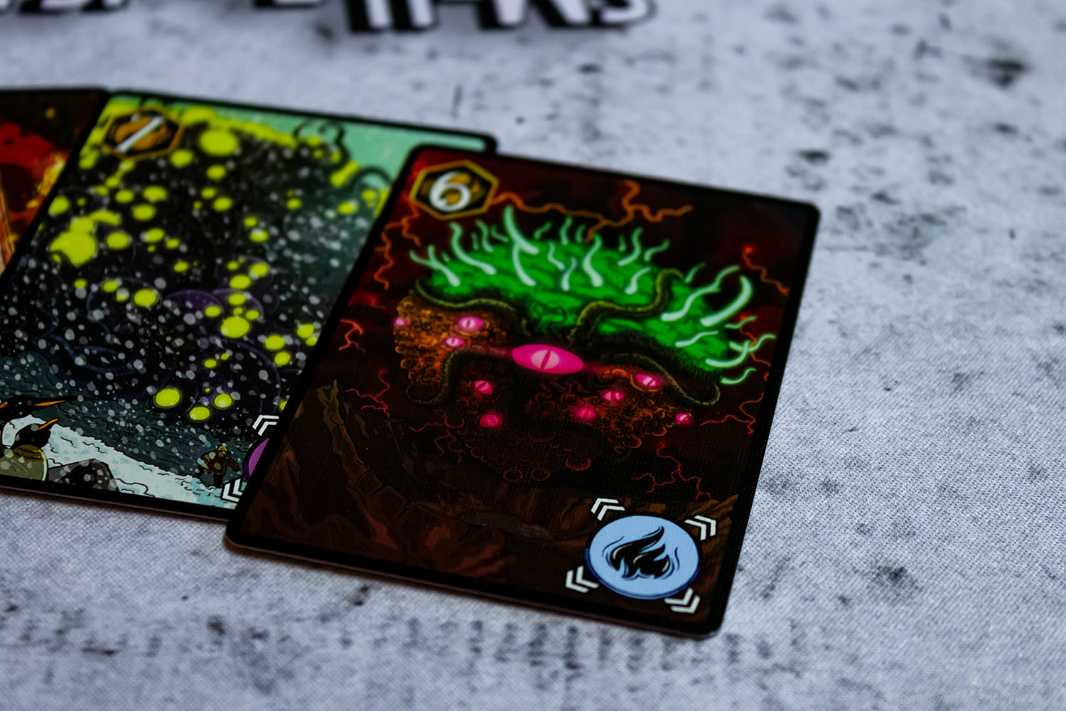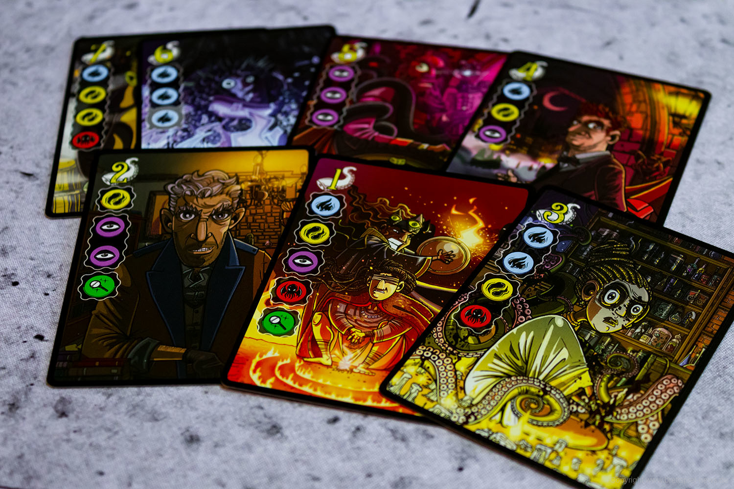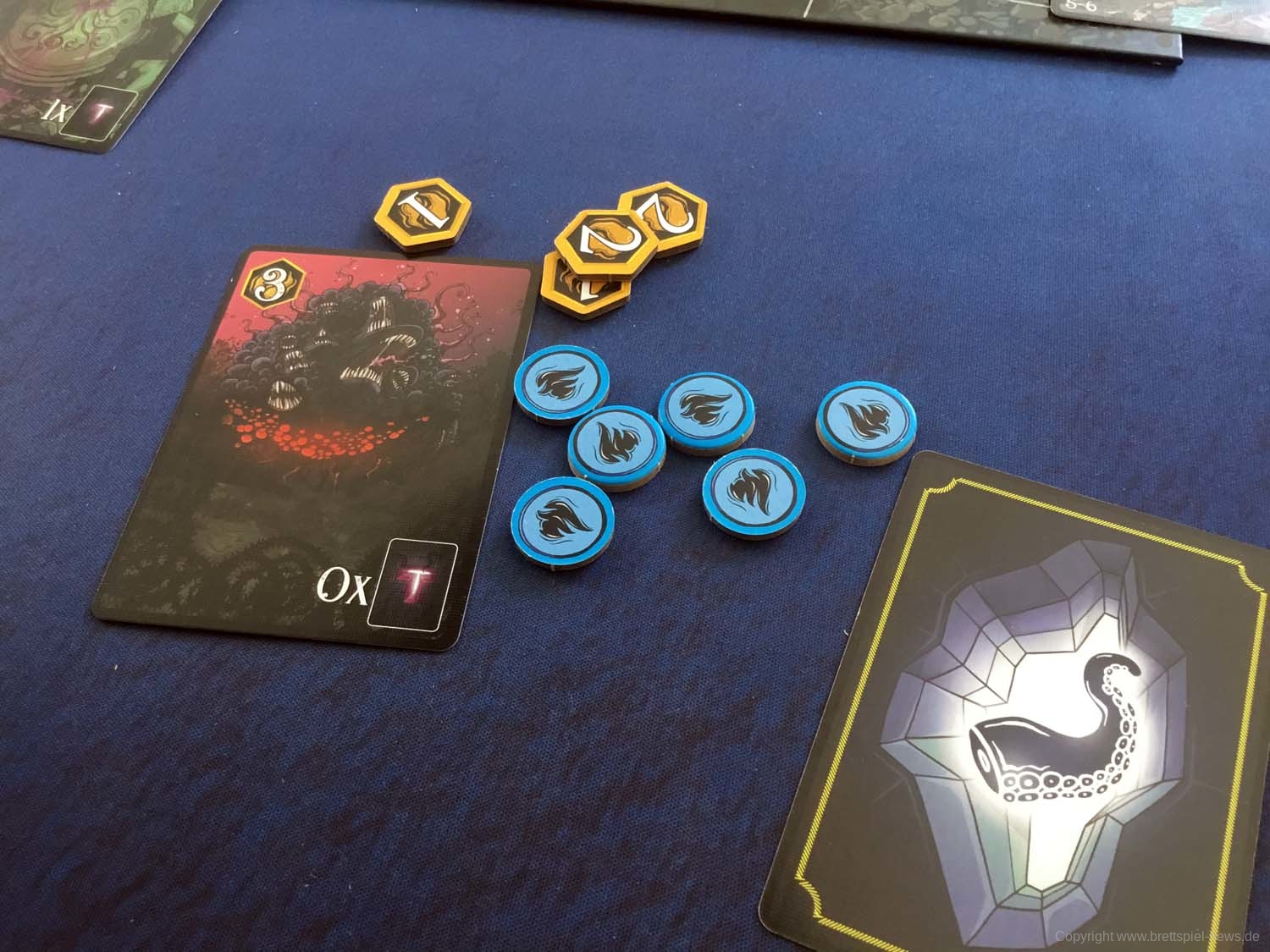 Wir haben ein Exemplar der Neuheit 7 SEELEN vom SCHWERKRAFT VERLAG gekauft und zeigen nun erste Bilder des Spiels. Das Spielmaterial macht einen guten Eindruck und auch die Grafik ist mit einem eigenen prägnanten Stil versehen. Das Spielfeld ist teilweise mit Glanzdruckfarbe bedruckt, was zu schönen Kontrastverhältnissen führt. 7 SEELEN richtet sich an 1-6 Spieler ab 8 Jahren und bietet Spielrunden von 30-40 Minuten Spielzeit.