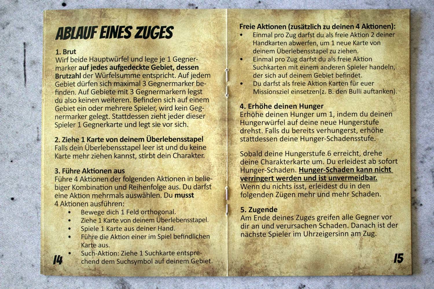 Durch die Wahl einer einzigartigen Überlebendenklasse innerhalb der Gruppe müssen die Spieler ihre Strategie planen und zusammenarbeiten und sich dabei auf die Stärken ihrer Überlebenden stützen, um Monster zu besiegen und dem Hungertod zu entgehen. Zum Beispiel ist der Feuerwehrmann mit seiner Axt aus nächster Nähe tödlich und kann Monster leicht zerhacken; der verstohlene Jäger kann die Karte gut auskundschaften und Fallen vermeiden - aber umherstreifende Monster sammeln sich schnell und die Zeit wird knapp. Wenn man von Monstern überwältigt wird oder verhungert, verlieren die Spieler. Wenn sie genug Benzin finden und es zu ihrem Wagen zurückbringen können, um zu entkommen, gewinnen sie alle und überleben, um ein anderes Szenario zu spielen.
