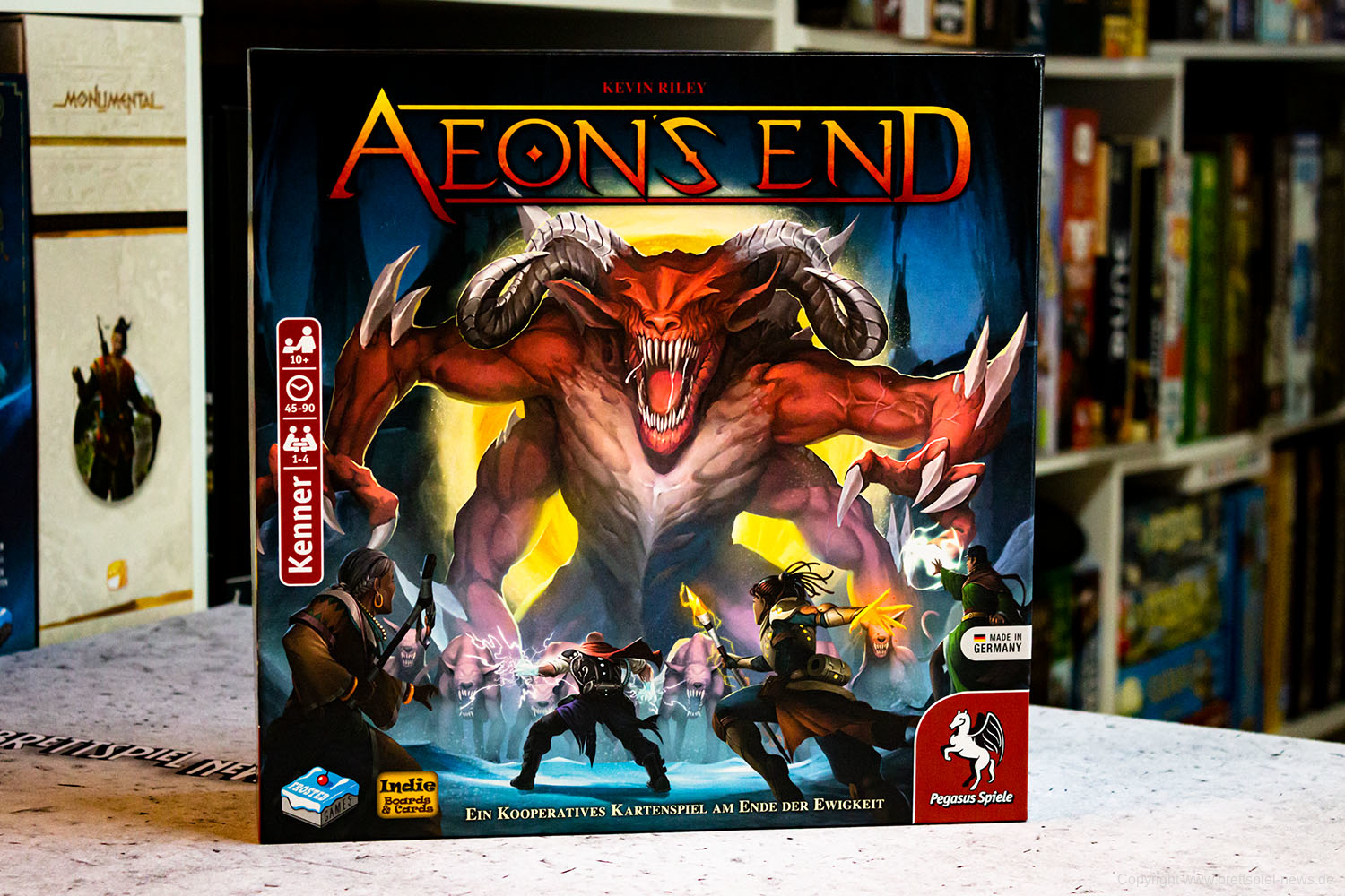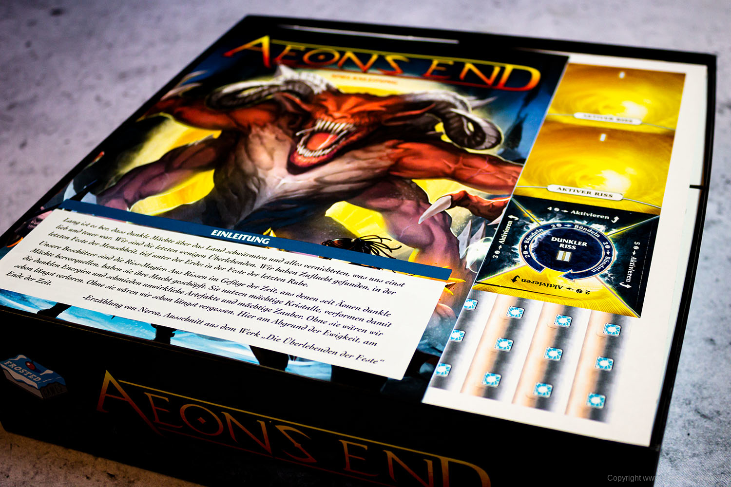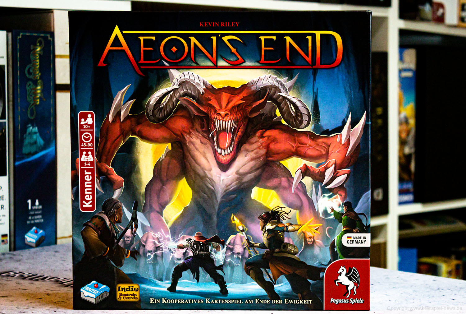 Wir haben vorab ein Exemplar von der aktuellen FROSTED GAMES Neuheit AEON'S END auf dem Tisch. Schon in Kürze wird das Spiel im Handel ertscheinen, denn der Vertriebspartner Pegasus hat mit dem Versand gestartet. Wie üblich, hat der Verlag ordentlich Arbeit in die deutsche Version gesteckt und zum Beispiel das Kartendesign komplett überarbeitet und optimiert. Es ist viel Zeit in dei sinnvolle Übersetzung geflossen und die Anleitung ist komplett neu und eigenständig erstellt worden. Wer das Spiel gleich zum Start haben möchte, sollte es sich gleich bestellen.