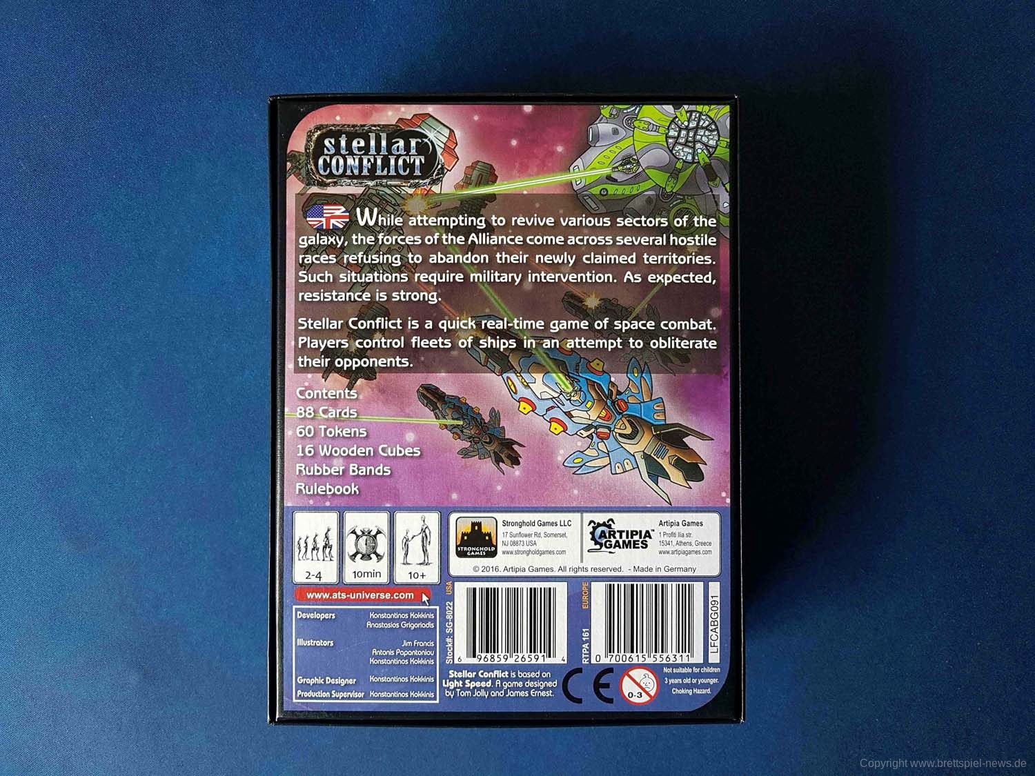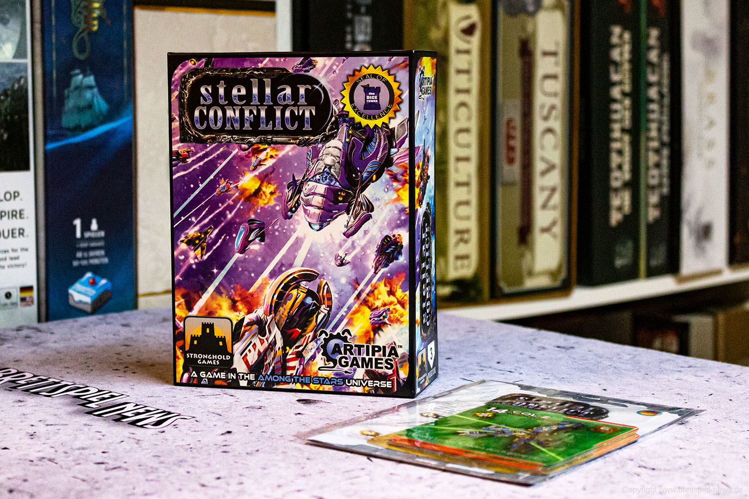 STELLAR CONFLICT ist ein schnelles Kartenspiel, das bereits 2015 bei ARTIPIA GAMES erschienen ist. Mittlerweile ist bei TL GAMES eine deutsche Version erschienen. Wir haben Bilder vom Spiel gemacht und werden es demnächst testen. Das Spiel stammt von den Autoren JAMES ERNEST und TOM JOLLY. Es richtet sich an 2-4 SpielerInnen ab 10 Jahren und als Familienspiel geeignet. Es lässt sich nur im Shop des Verlags kaufen und kostet 14,99 €.