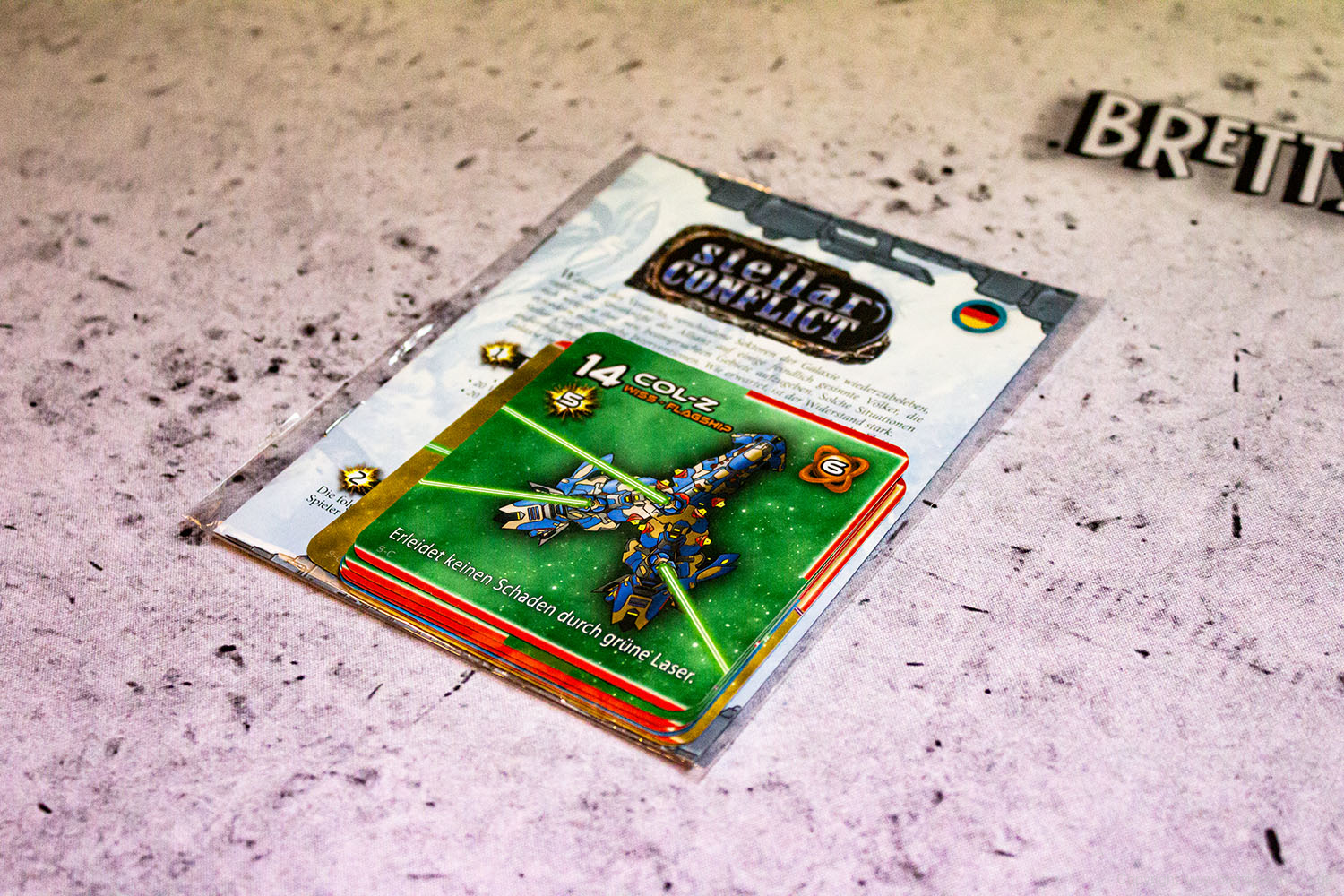 Die deutschen Regeln zu Stellar Conflict sind aus unserer Feder und dies ist somit unser erstes Verlagsprodukt. Ihr erhaltet die englische Ausgabe und zusätzlich die deutschen Regeln sowie 8 Karten mit übersetzten Texten.