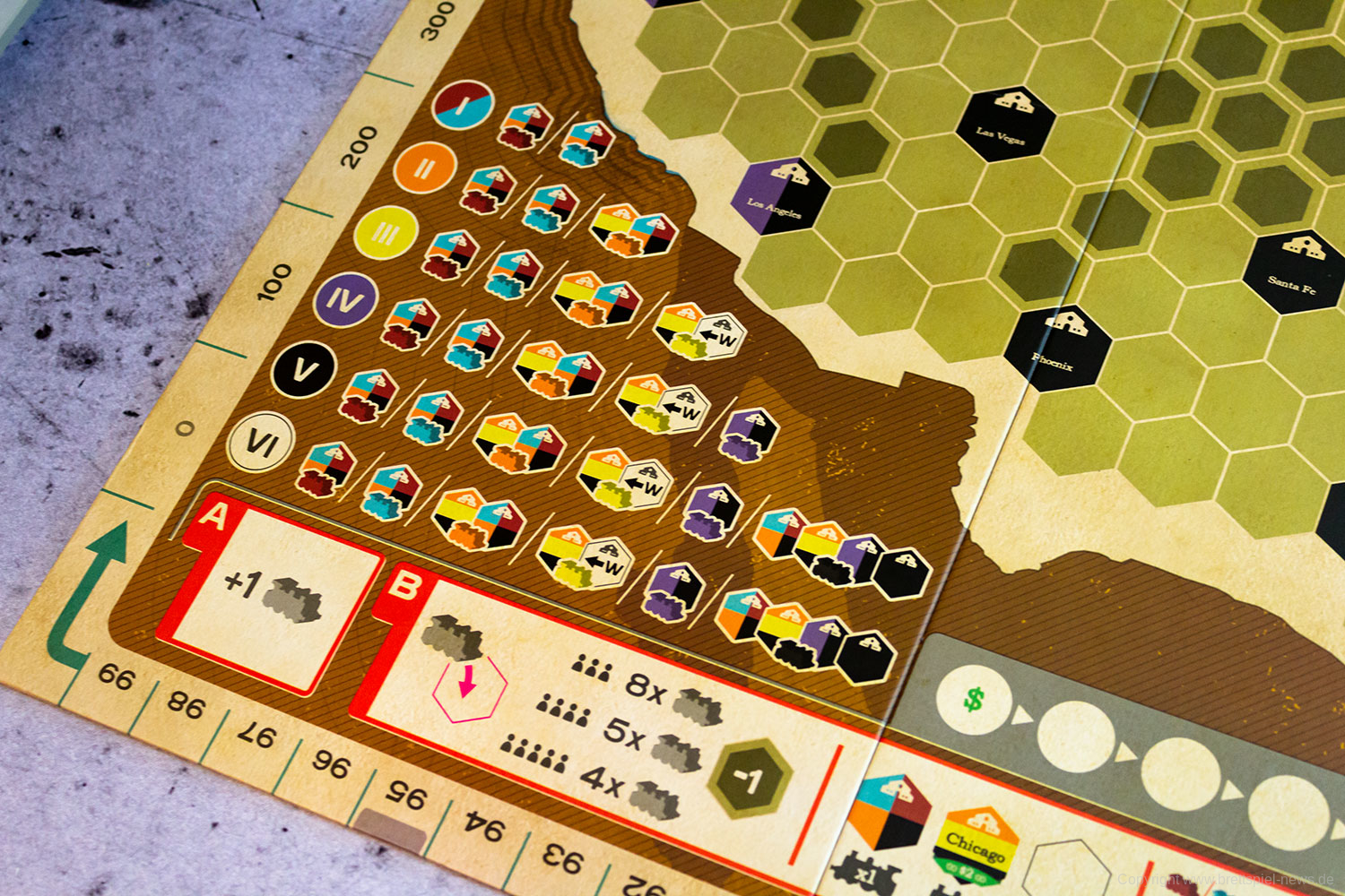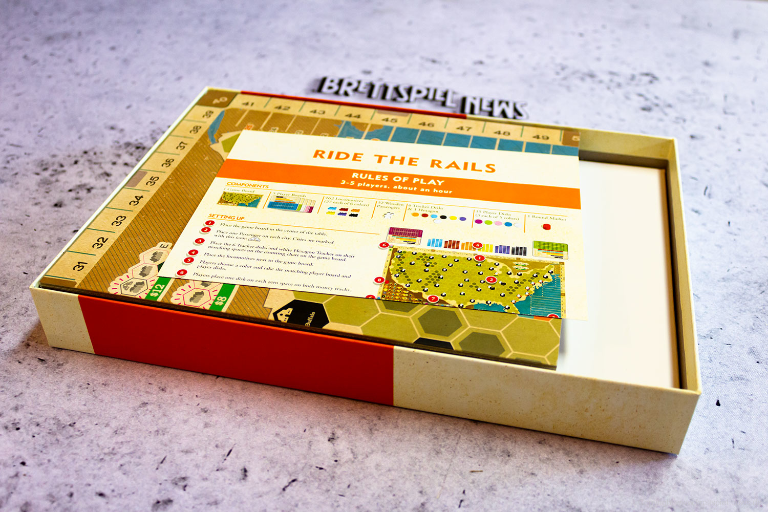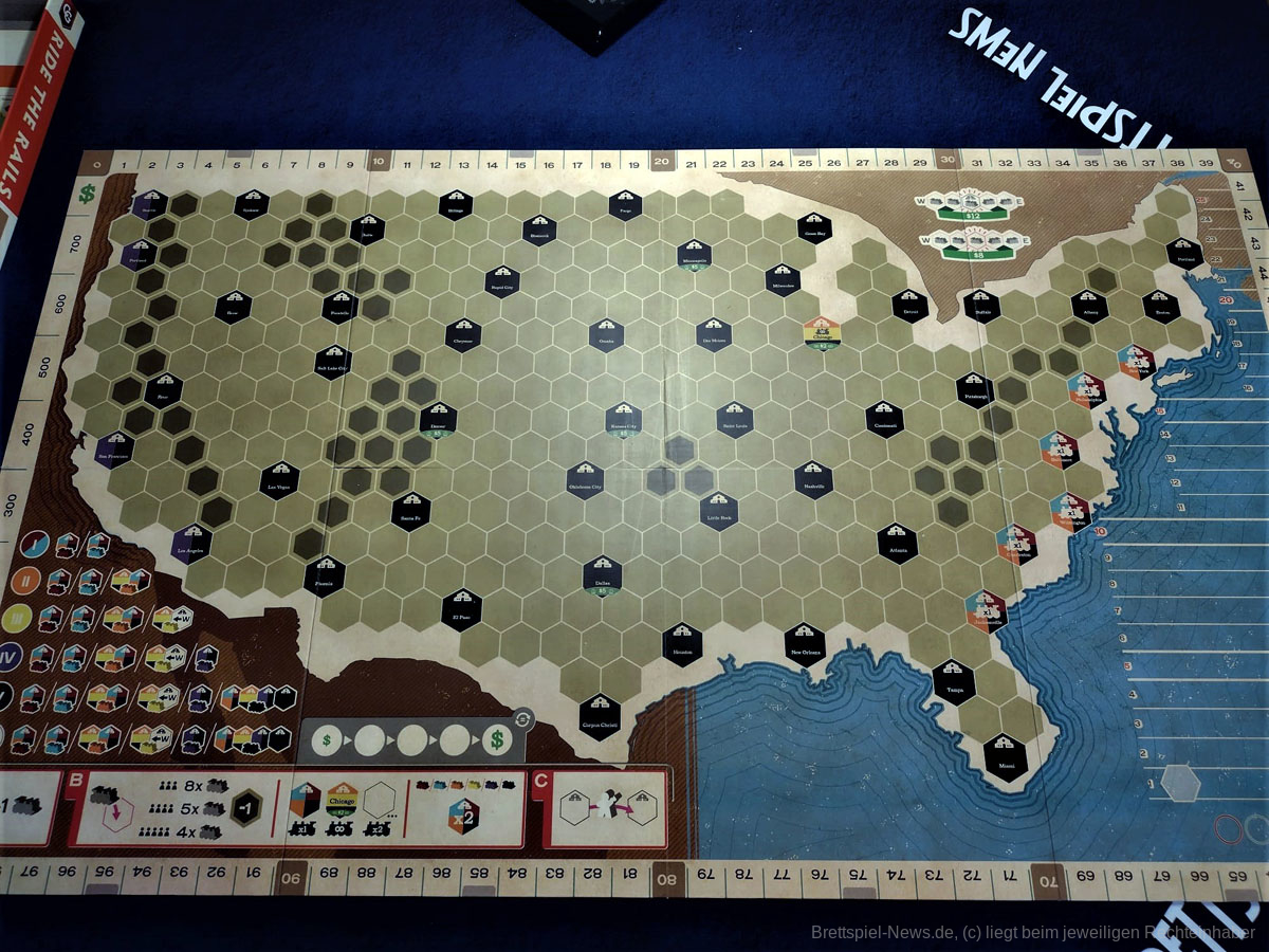 Wir haben die Neuheit RIDE THE RAILS von CAPSTONE GAMES bei fantasywelt.de gekauft und zeigen nun Bilder vom Spielmaterial. Wer der englischen Sprache mächtig ist, kann sich das Spiel vom Autoren JOHN BOHRER anschauen. Die Grafik stammt übrigens vom bekannten Grafiker IAN O'TOOLE der auch für die puristische Grafik von der AGE OF STEAM Deluxe Edition verantwortlich ist.