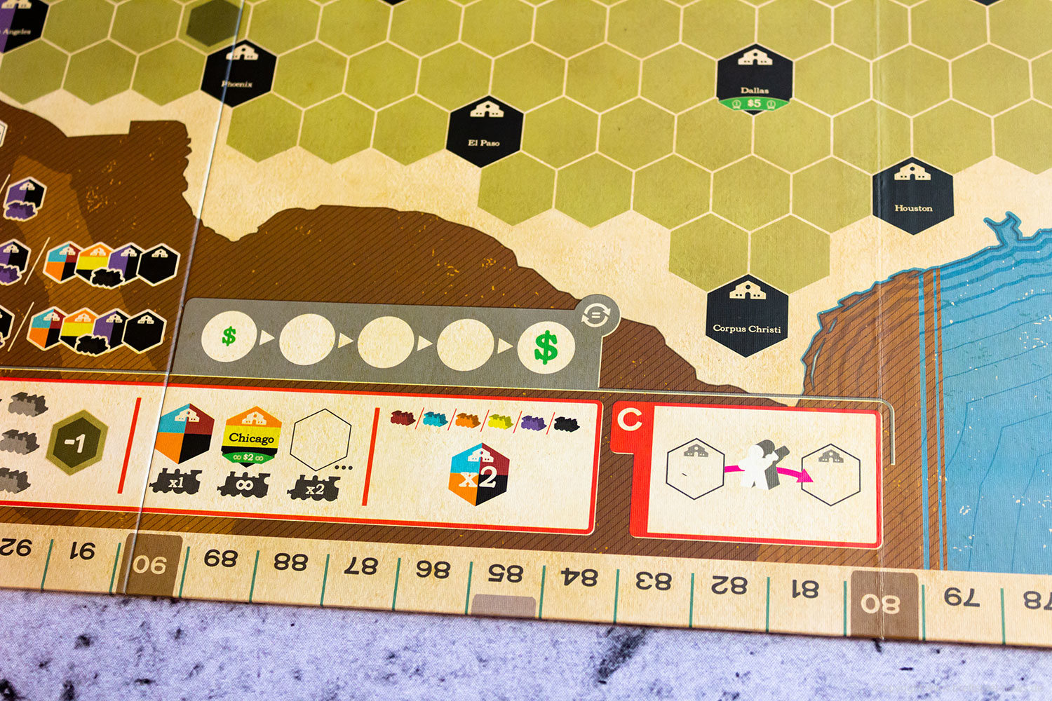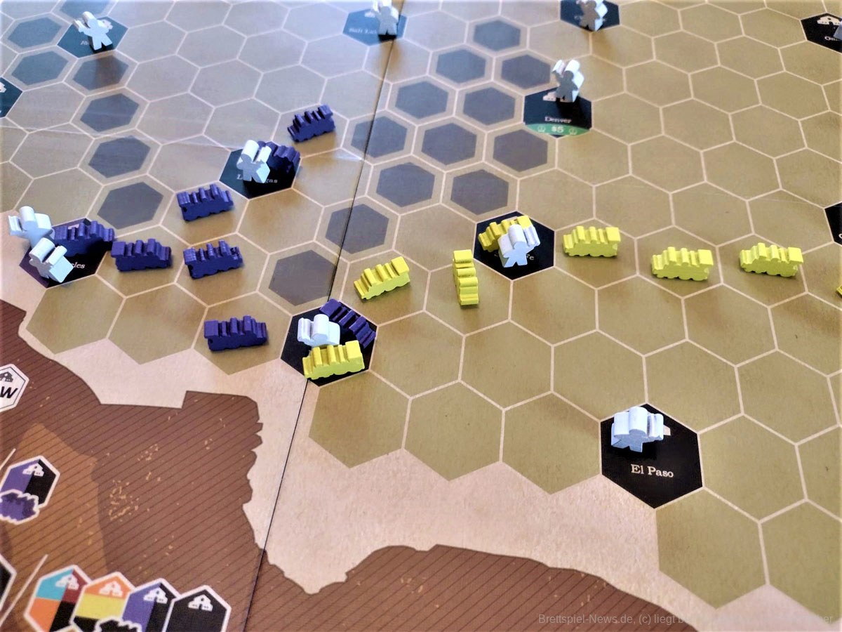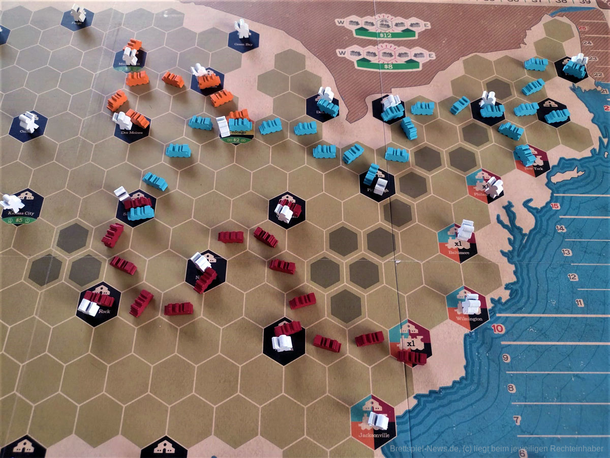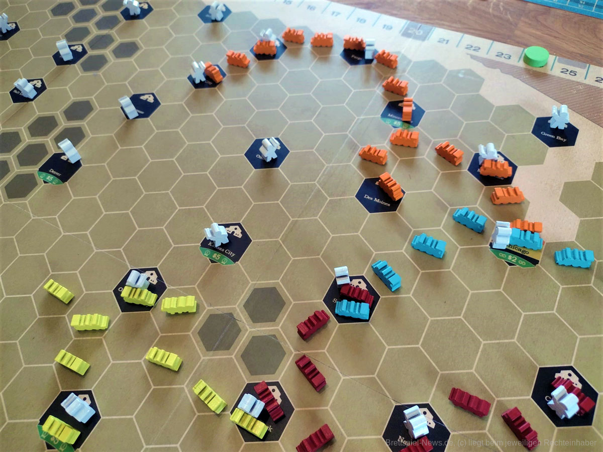In Ride the Rails werden Sie in Eisenbahngesellschaften investieren, Eisenbahnschienen quer durch die Vereinigten Staaten bauen und Passagiere in so viele Städte wie möglich bringen. In jeder Runde wird eine neue Eisenbahngesellschaft in das Spiel eingeführt, und jede Eisenbahngesellschaft hat ihre eigenen speziellen Platzierungsregeln! Liefern Sie Fahrgäste in so viele Städte wie möglich, um die meisten Punkte zu erhalten. Seien Sie auf Ihren Reisen vorsichtig, denn auch Aktionäre von Eisenbahnen, die Sie benutzen, werden Punkte sammeln!
