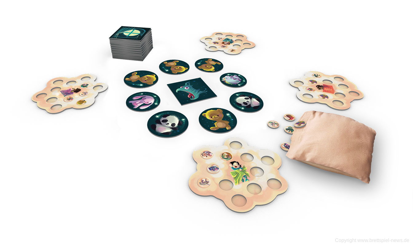 Mit Albträumen ist nicht zu spaßen! Zum Glück habt ihr eure Kuscheltiere dabei. Sie verwandeln die bösen Träume in schöne Geschichten! Nehmt das richtige Kuscheltier, um die wechselnden Alptraumwesen zu verdecken und so gute Traum-Plättchen zu sammeln.