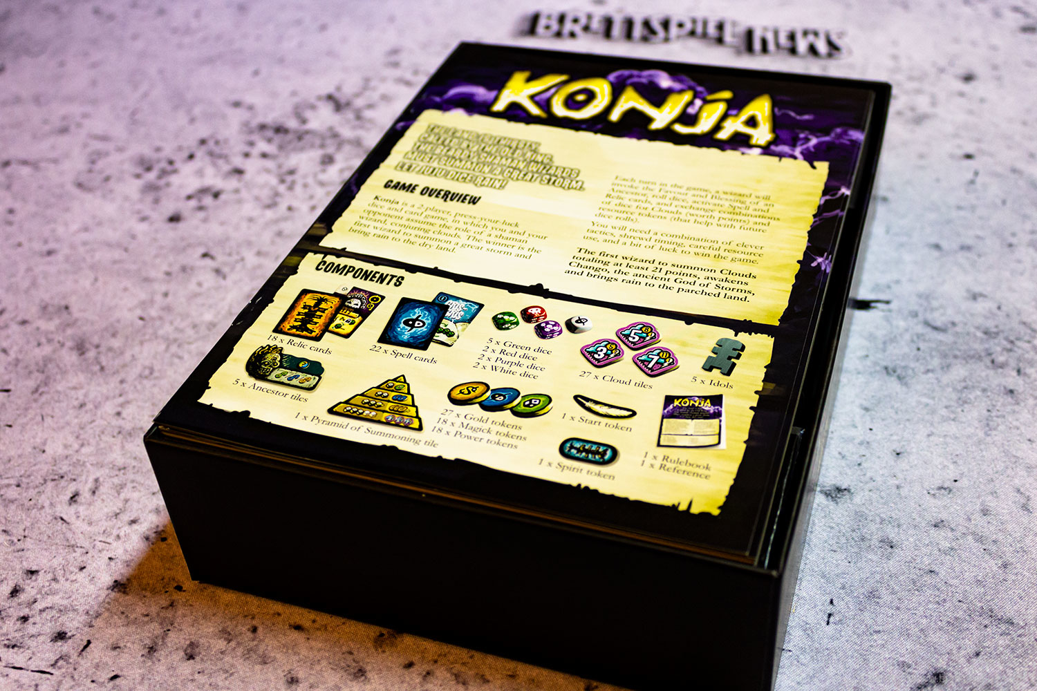 Konja ist ein Würfelspiel, bei dem 2 Spieler als Zauberer gegeneinander antreten, die von einem alten König herbeigerufen wurden, um einen großen Sturm zu manifestieren und Regen auf ein trockenes Land zu bringen. Durch Würfeln und Aktivieren von mächtigen Zaubersprüchen und Reliquienkarten gewinnen die Spieler Gold, Magie, Macht und Wolken.