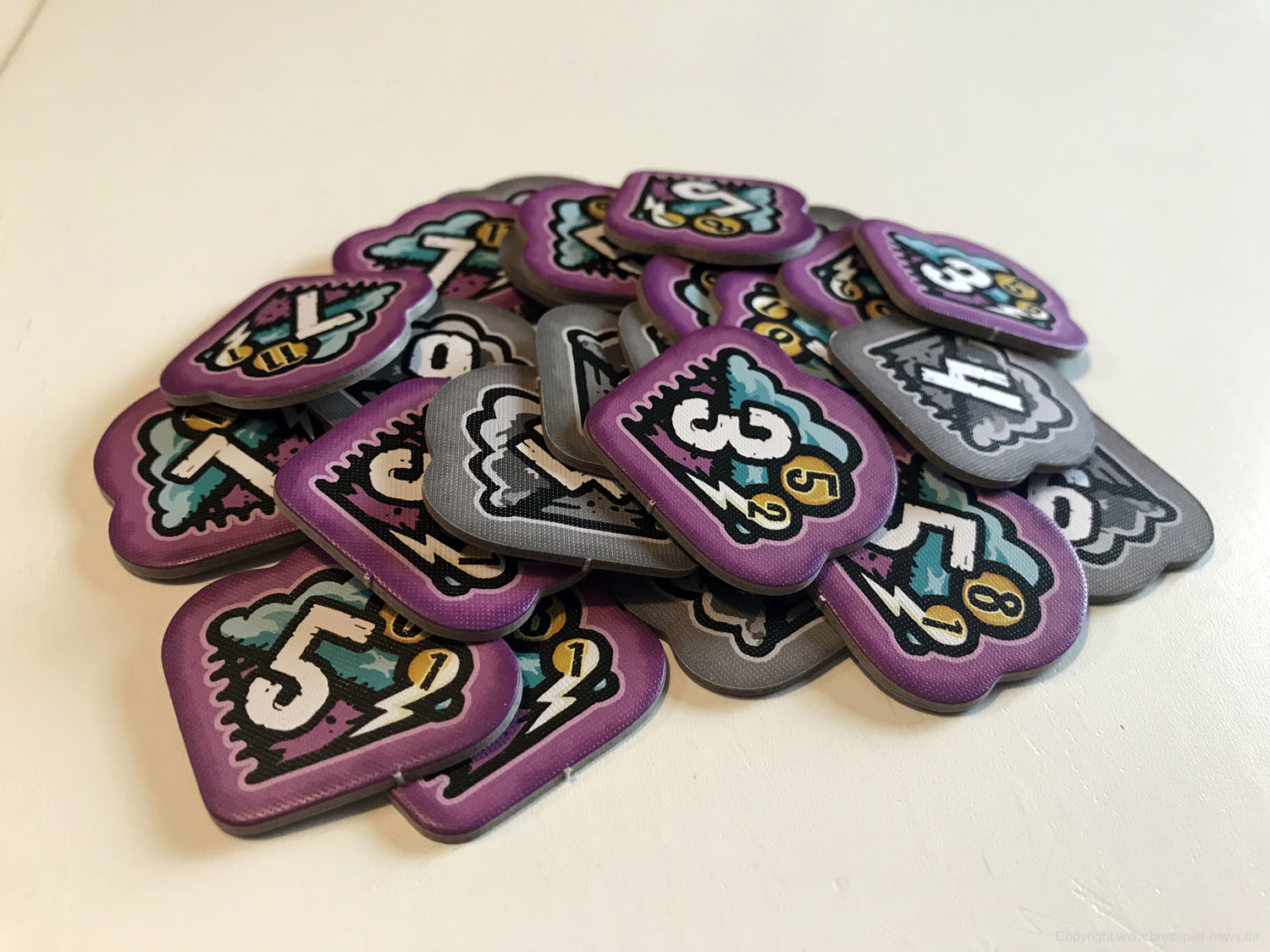 Drei oder mehr Würfel, die die gleiche Zahl zeigen, erhalten Wolkenplättchen, die am Ende des Spiels Punkte wert sind.