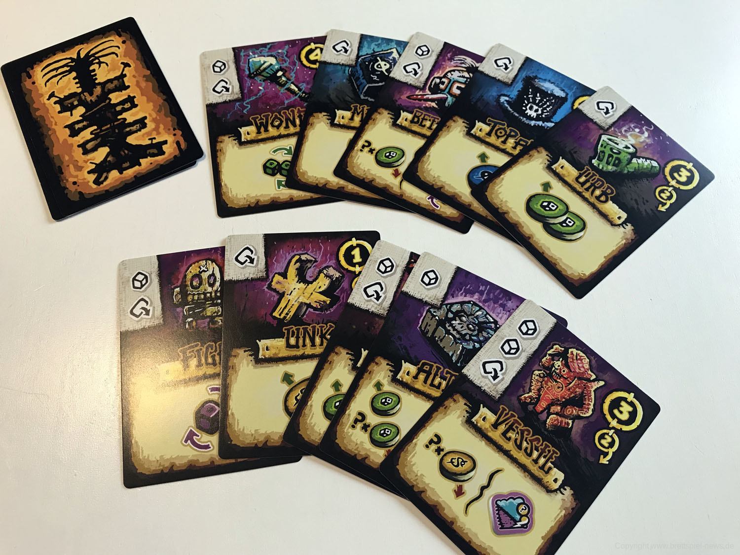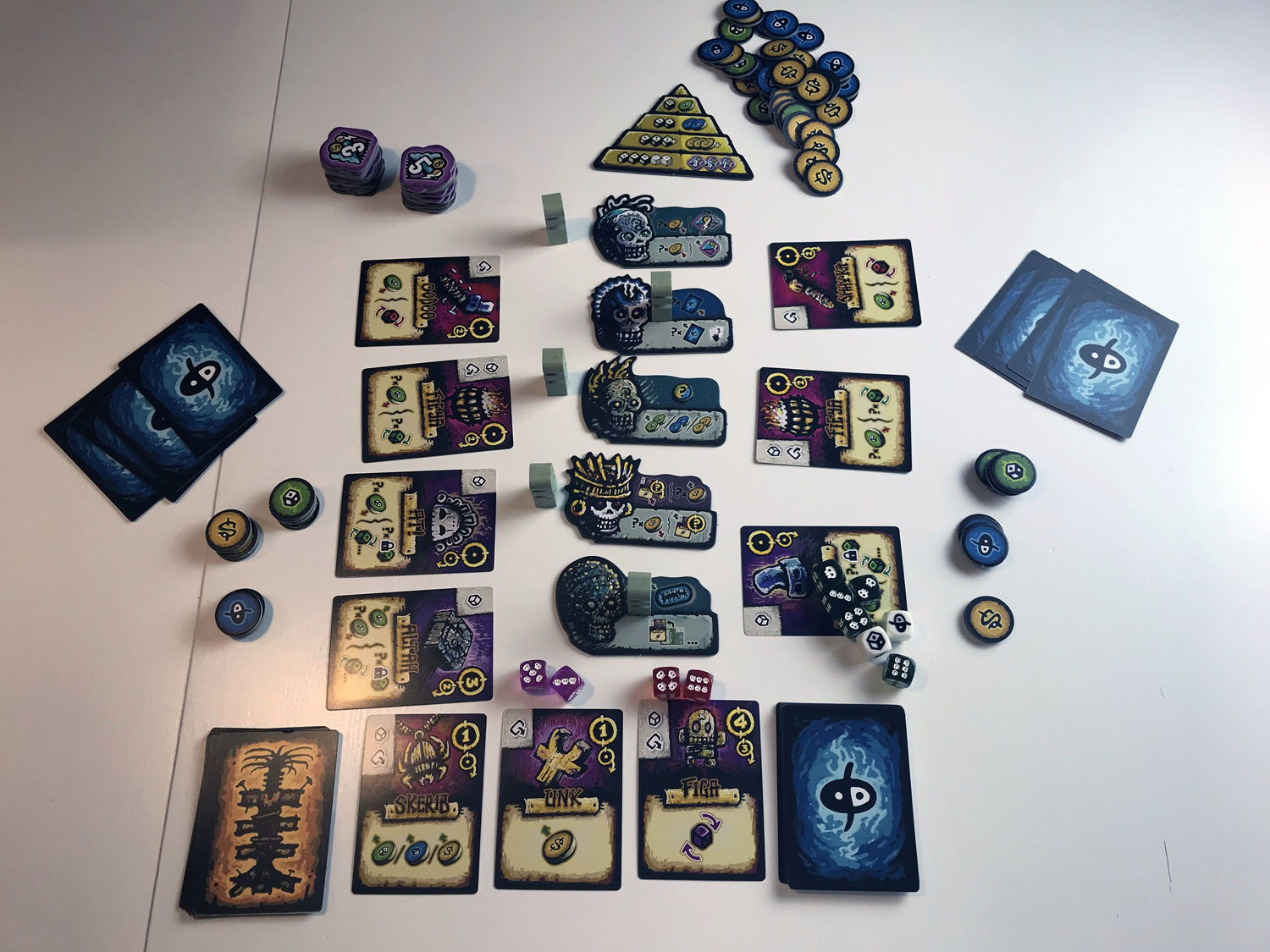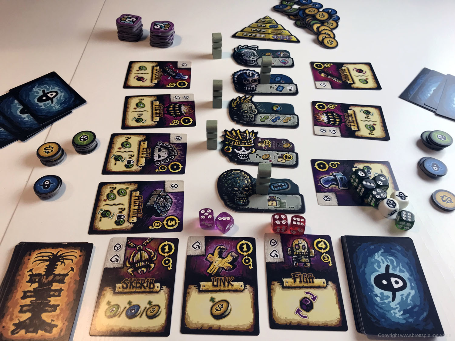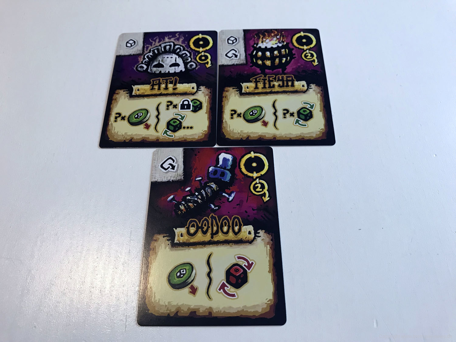 Der aktive Spieler würfelt dann und erzeugt durch Manipulation der Reliquien- und Zauberkarten nützliche Würfelkombinationen: