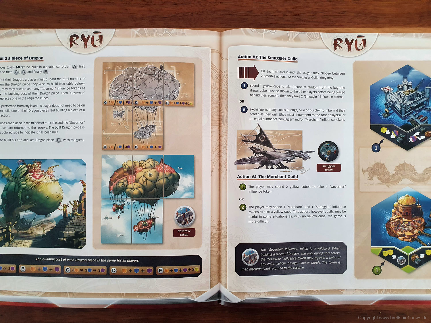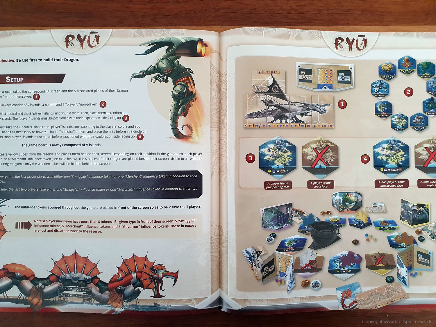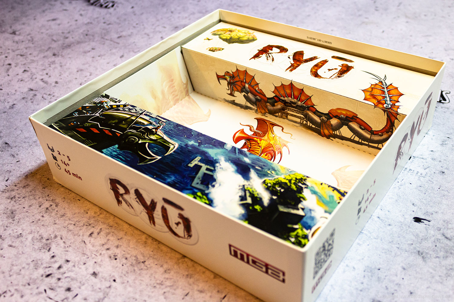 In RYŪ, einem Spiel mit Verhandlungen, Bluffen und Würfelentwurf, repräsentiert jeder Spieler einen der anderen fünf Planeten dieses Sternensystems, wobei jeder Planet eine andere Art von Humanoiden - wie Haie, Amazonen und Meka-Goblins - und seine eigenen einzigartigen Einflüsse hat. Diese Planeten stehen für die Erkundung offen, und mit der entsprechenden Finanzierung können die Spieler die Ressourcen ausgraben, die sie für den Bau ihres eigenen Mutterschiffs RYŪ benötigen, das aus "Seltenem Metall", "Memory Stone" und "Bernsteinmagie" besteht. Die Spieler werden miteinander kooperieren müssen, um die notwendigen Ressourcen zu beschaffen, aber sie müssen auch für sich selbst arbeiten, um einen Vorteil gegenüber anderen Spielern zu erhalten. Einmal zusammengesetzt, erwacht die RYŪ als lebendiges Raumschiff zum Leben, und ihr Besitzer gewinnt das Spiel.