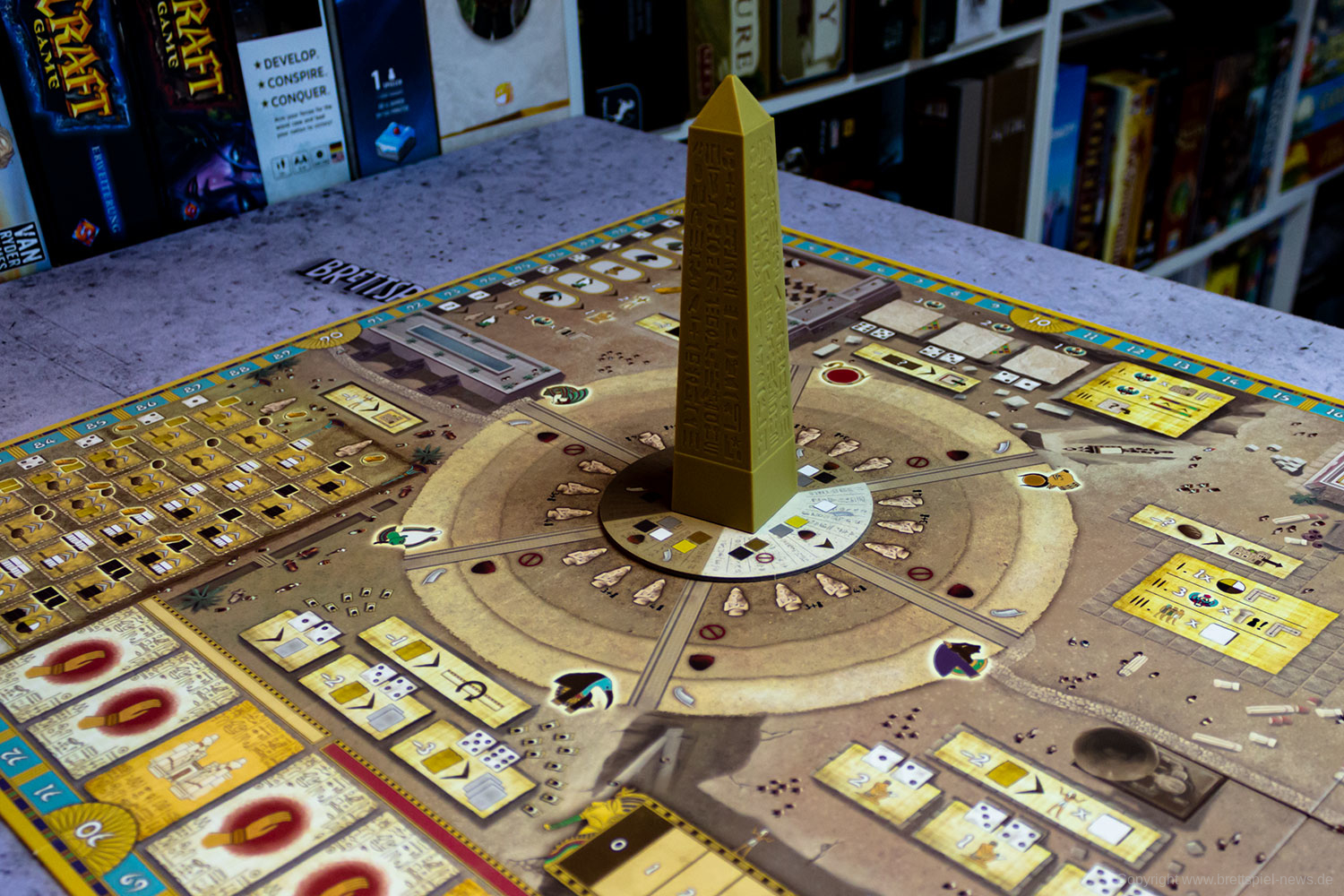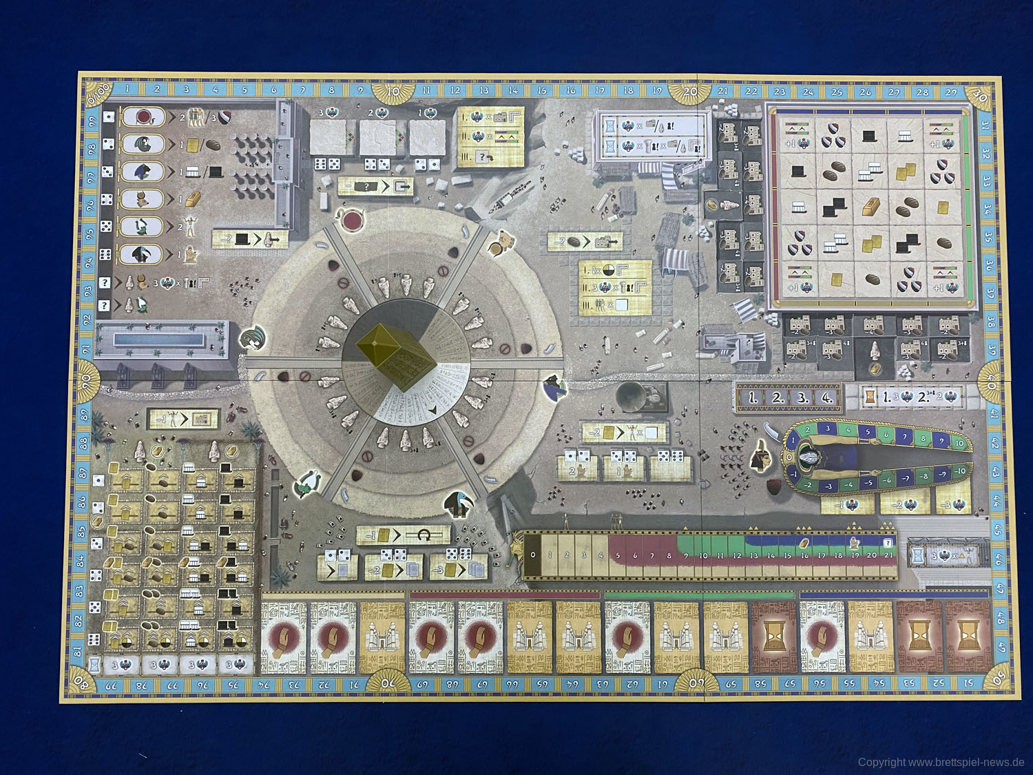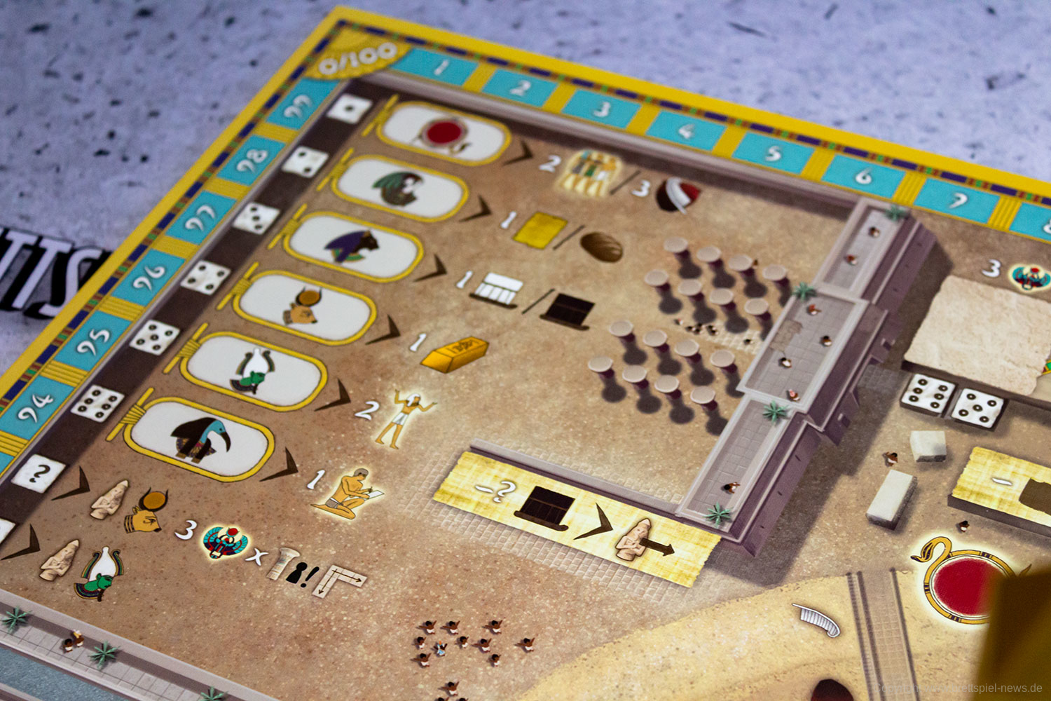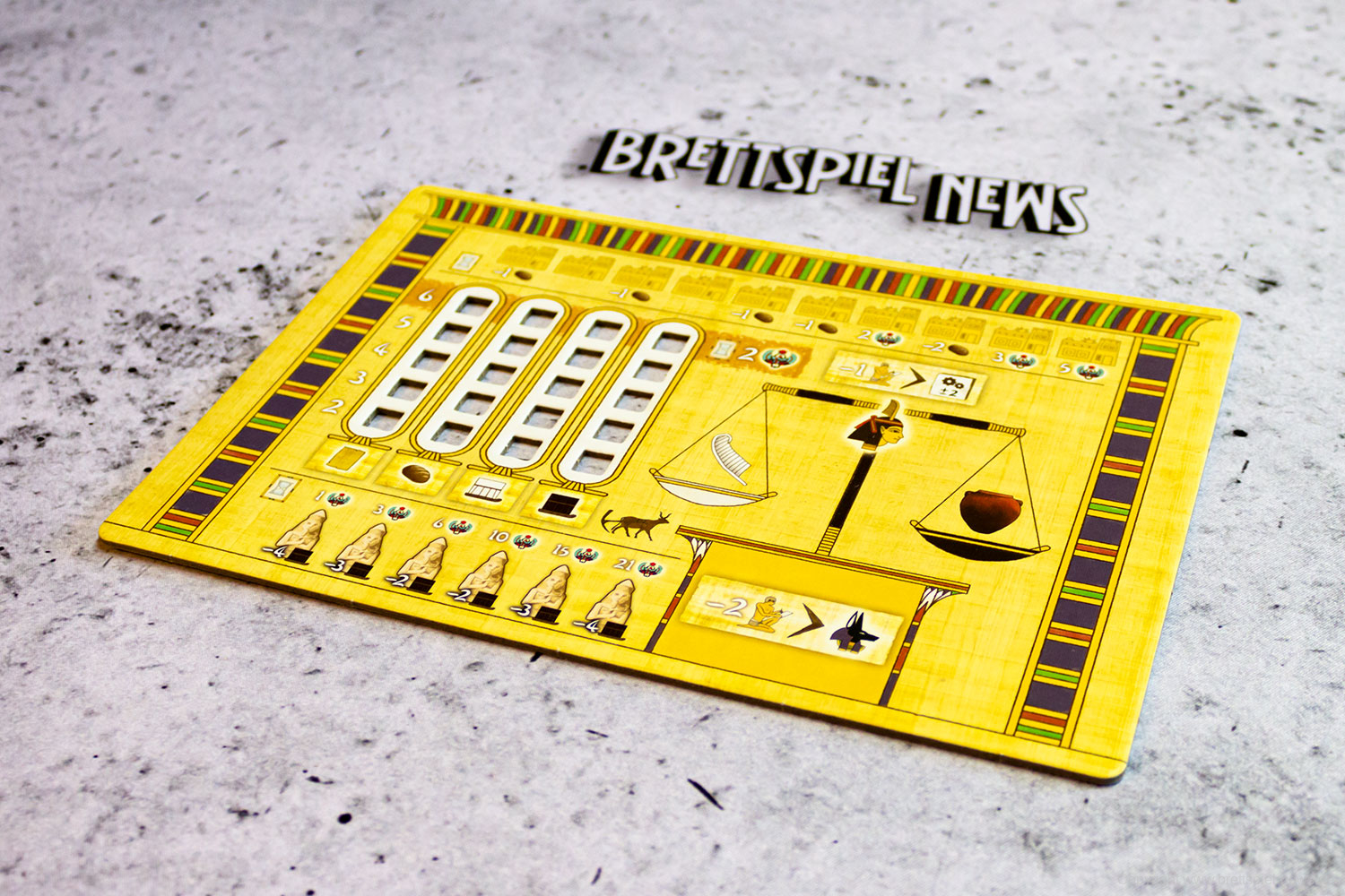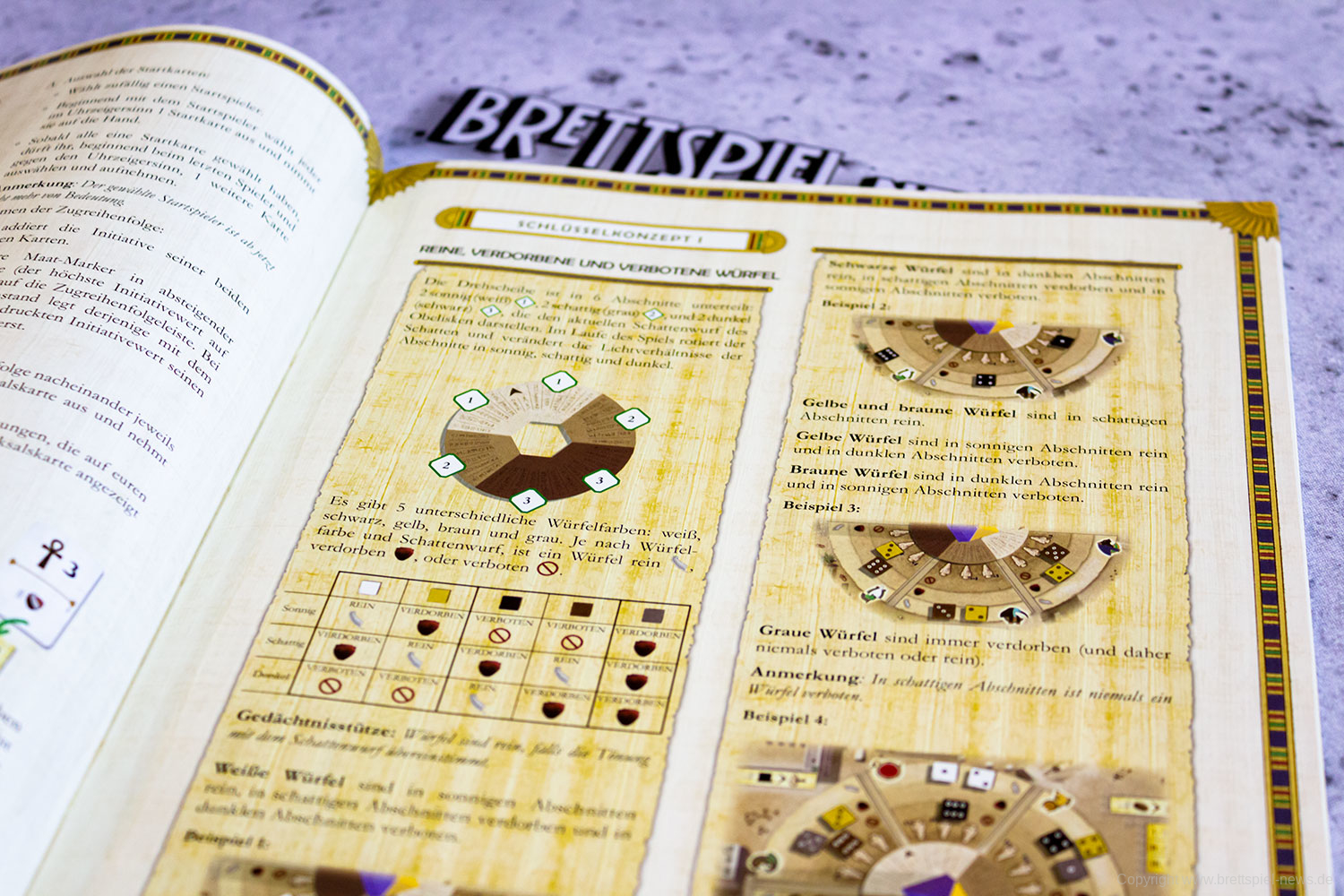 Dabei bestimmt der stetig wandernde Schattenwurf des Sonnenobelisken darüber, ob die Würfel rein, verdorben oder gar verboten sind und wie es um eure Seelenwaage steht, wenn Maat ihr Urteil über euch fällt.