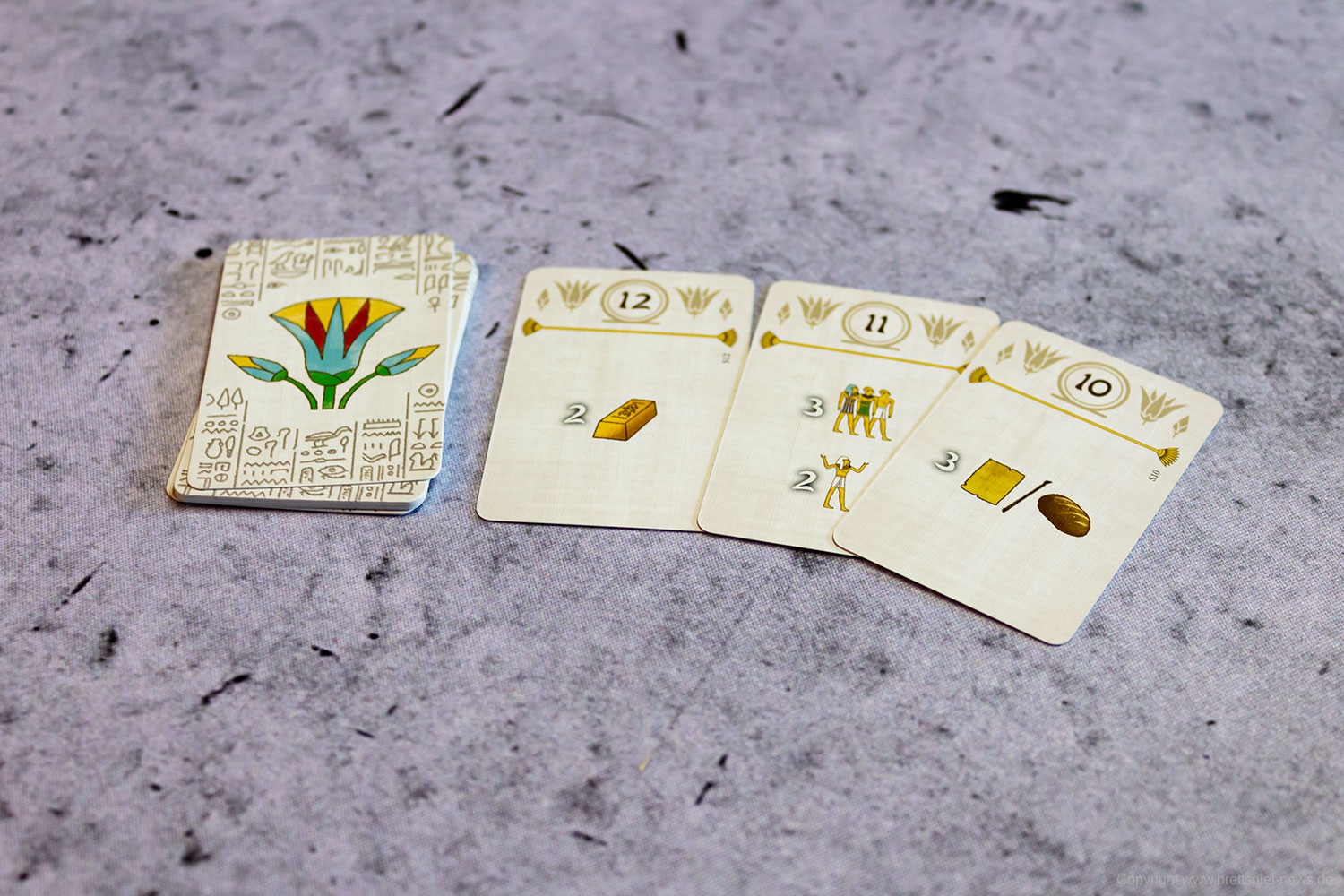 Ihr schlüpft in die Rollen von hohen Beamten im Alten Ägypten und errichtet sowohl den Tempel des Amun-Re, als auch das Gebiet, auf dem heute Karnak liegt. Während eures Spielzugs wählt ihr einen der Würfel, die auf dem Sockel des Obelisken liegen.Ihr entscheidet dann, ob ihr mit dem Würfel eine Gottesaktion ausführen, die entsprechenden Ressourcen produzieren oder seinen Wert mit Hilfe eines Schreibers verändern wollt.