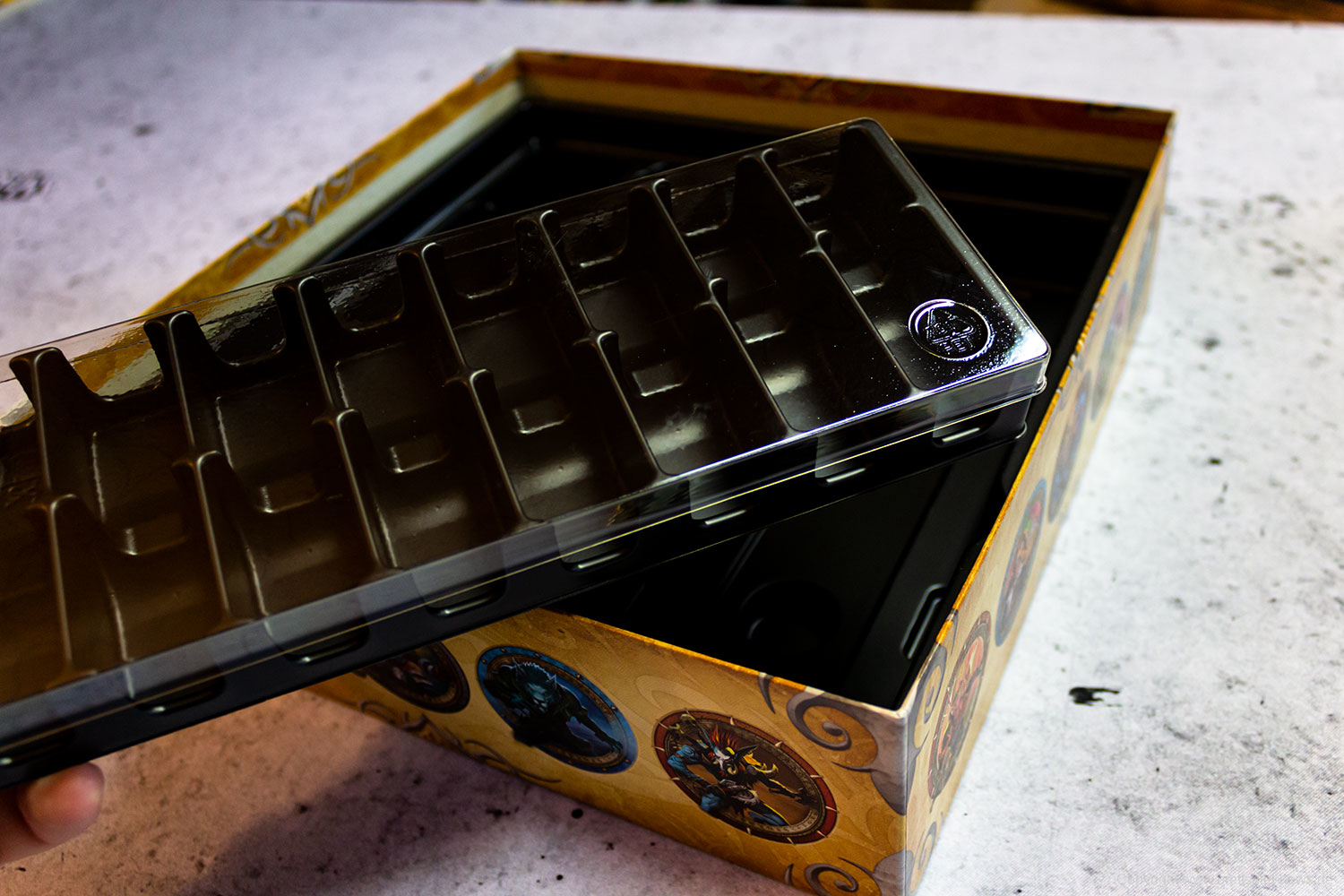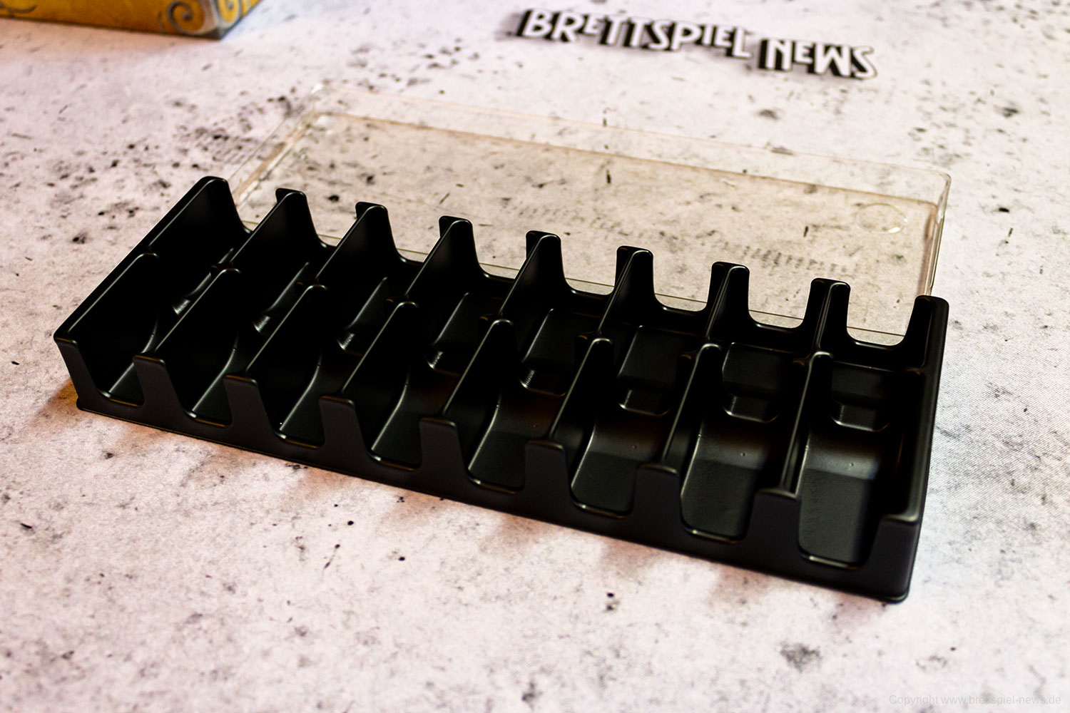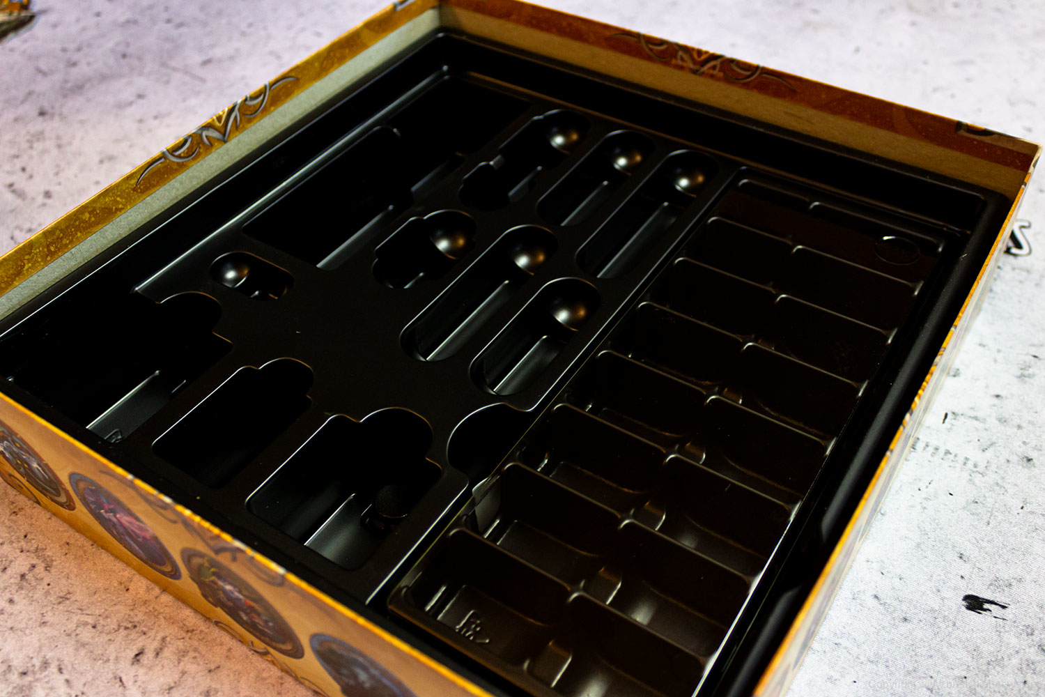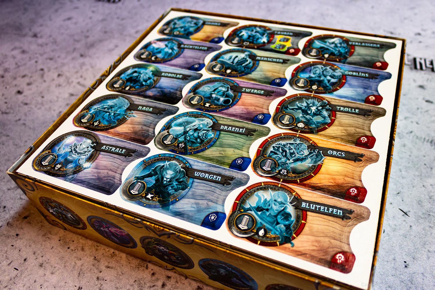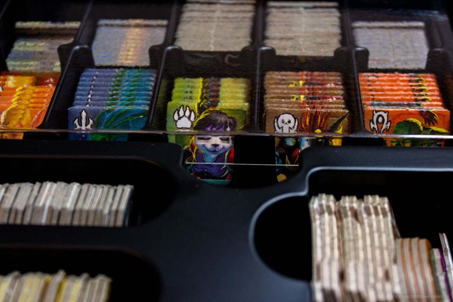 SMALL WORLD OF WARCRAFT wird mit einem Inlay ausgeliefert, in dem das Spielmaterial gut Platz findet. Es sollten nur die leeren Stanzmatten aufbewahrt und unter das Inlay gelegt werden, damit die Marker und Spielteile eng eingepackt ist. Ein Teil des Inlays lässt sich separat rausnehmen was im Spiel ein praktischer Aspekt sein dürfte.