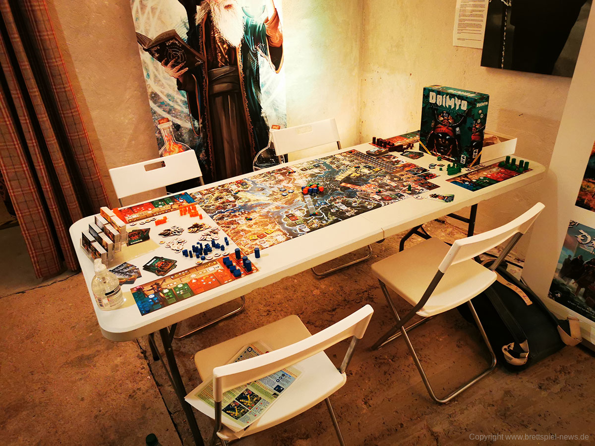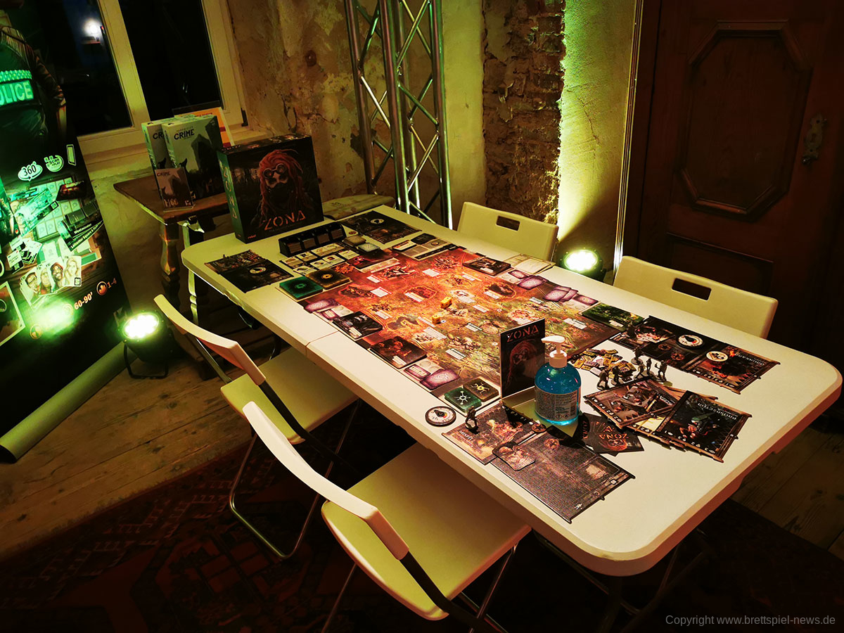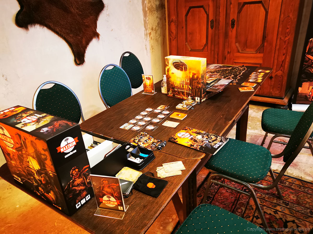 Insgesamt ist die Lokation gut gewählt und bietet genügend Räume, um alle Corona-Regeln einhalten zu können. Allein die schiere Anzahl an Tischen mit vielen Spielen, die erst im Herbst oder Ende des Jahres erscheinen werden, ist für Brettspieler ein kleines Paradies. Durch die bunte Vielzahl ist für jeden Geschmack etwas dabei und trotz der zahlreichen Tische gibt es noch mehr Spiele, die in einer Ausleihe darauf warten ausgepackt zu werden. Übrigens: die unten gezeigten Bilder zeigen nur knapp 50% der Tische. Insgesamgt wird es rund 40 verschiedene Spiel zum testen geben plus Prototypen, die nicht weiter benannt werden dürfen.