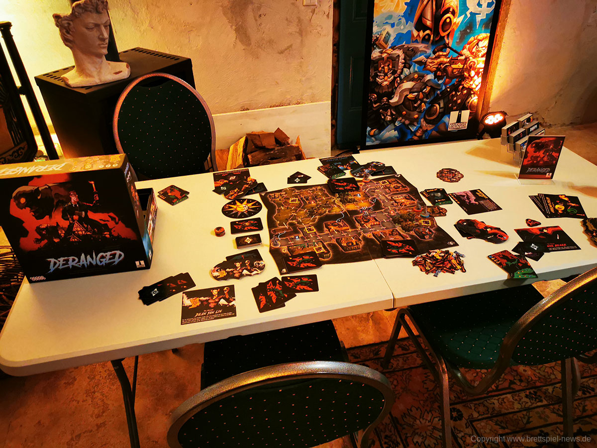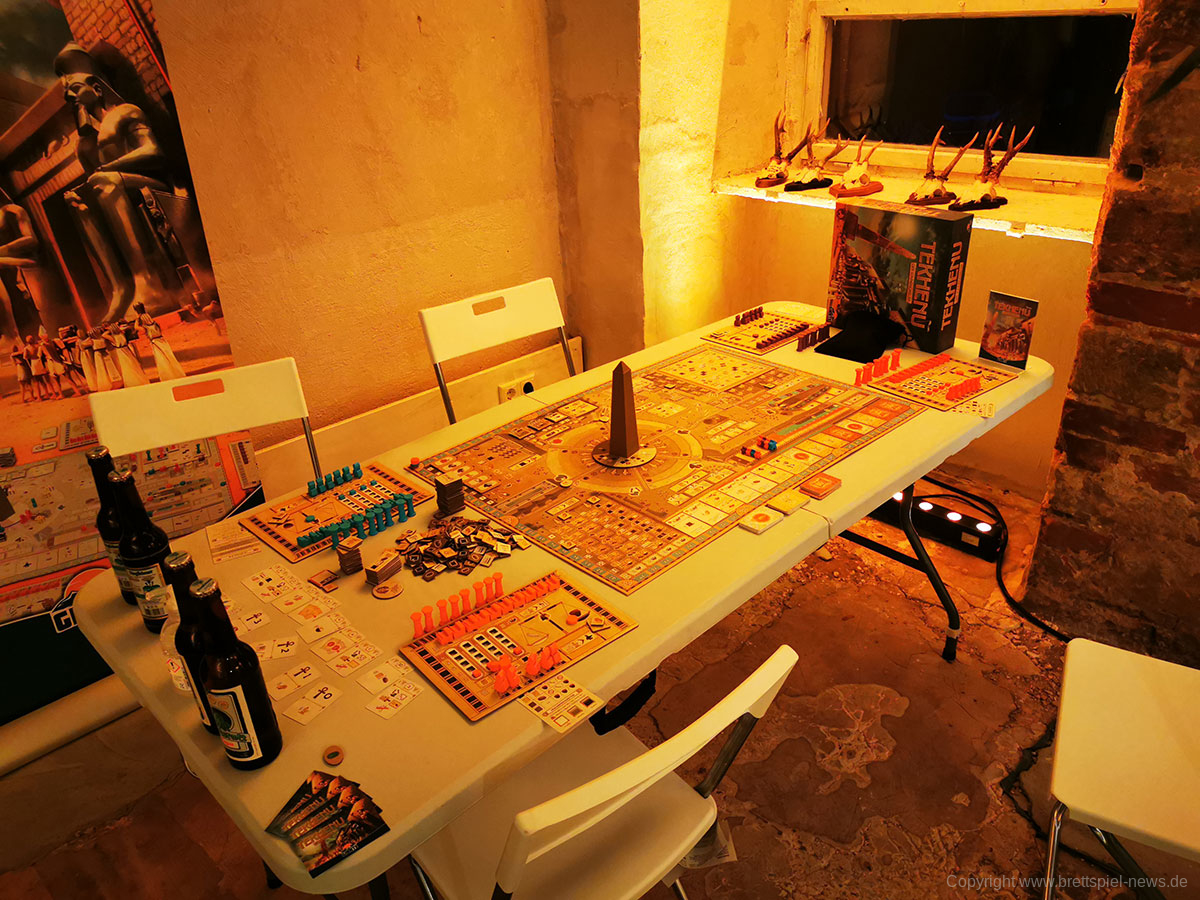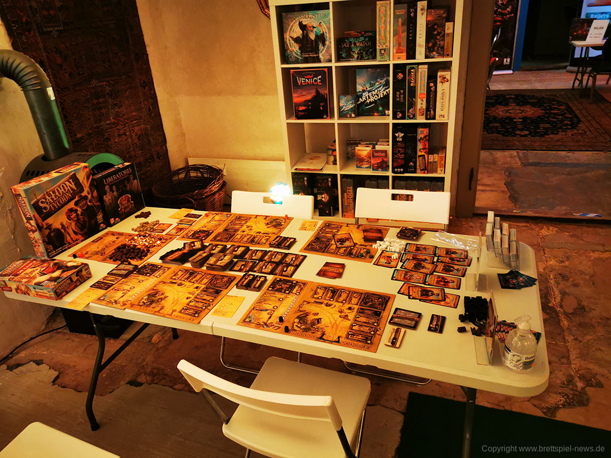 Insgesamt ist die Lokation gut gewählt und bietet genügend Räume, um alle Corona-Regeln einhalten zu können. Allein die schiere Anzahl an Tischen mit vielen Spielen, die erst im Herbst oder Ende des Jahres erscheinen werden, ist für Brettspieler ein kleines Paradies. Durch die bunte Vielzahl ist für jeden Geschmack etwas dabei und trotz der zahlreichen Tische gibt es noch mehr Spiele, die in einer Ausleihe darauf warten ausgepackt zu werden. Übrigens: die unten gezeigten Bilder zeigen nur knapp 50% der Tische. Insgesamgt wird es rund 40 verschiedene Spiel zum testen geben plus Prototypen, die nicht weiter benannt werden dürfen.