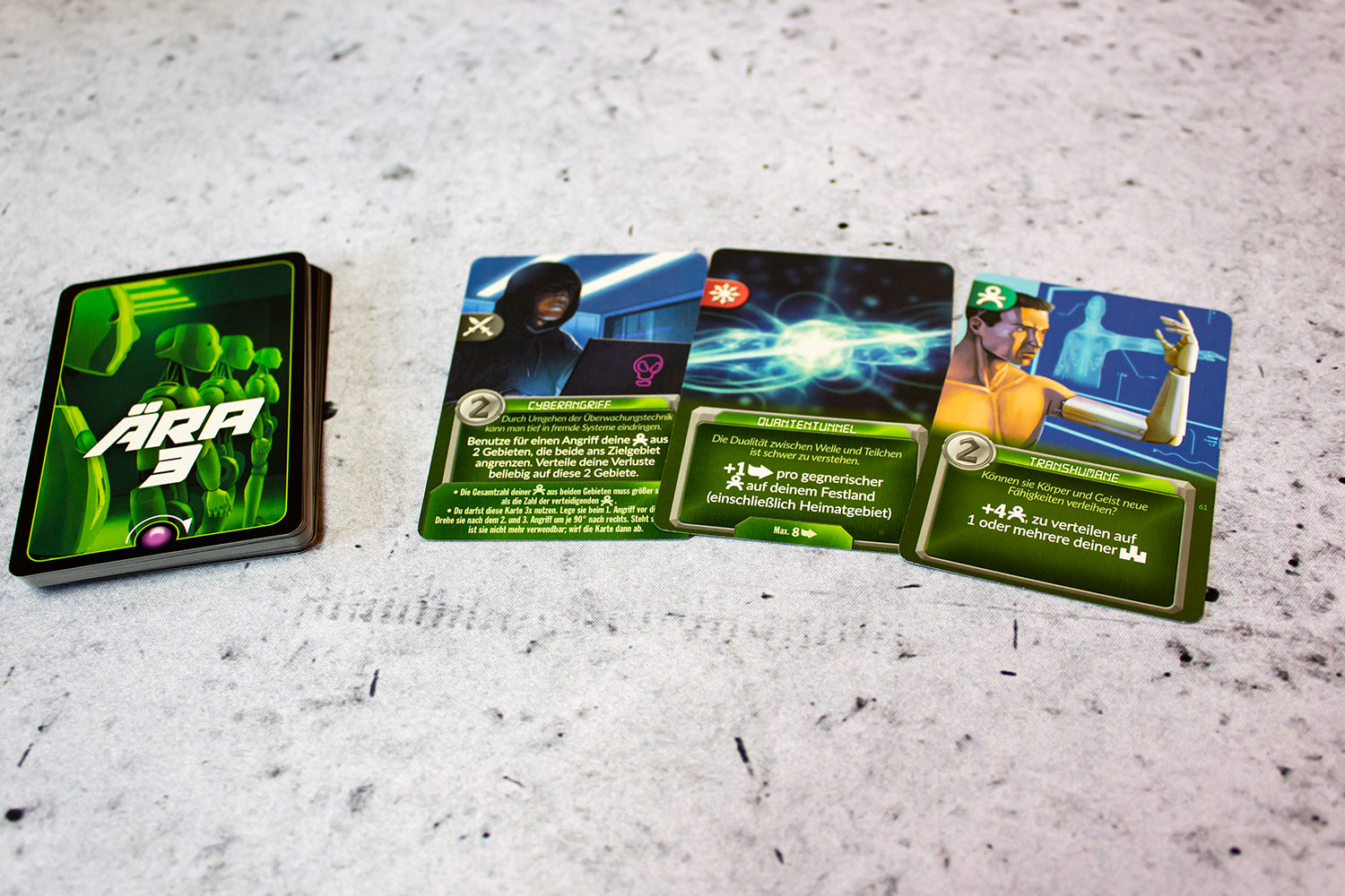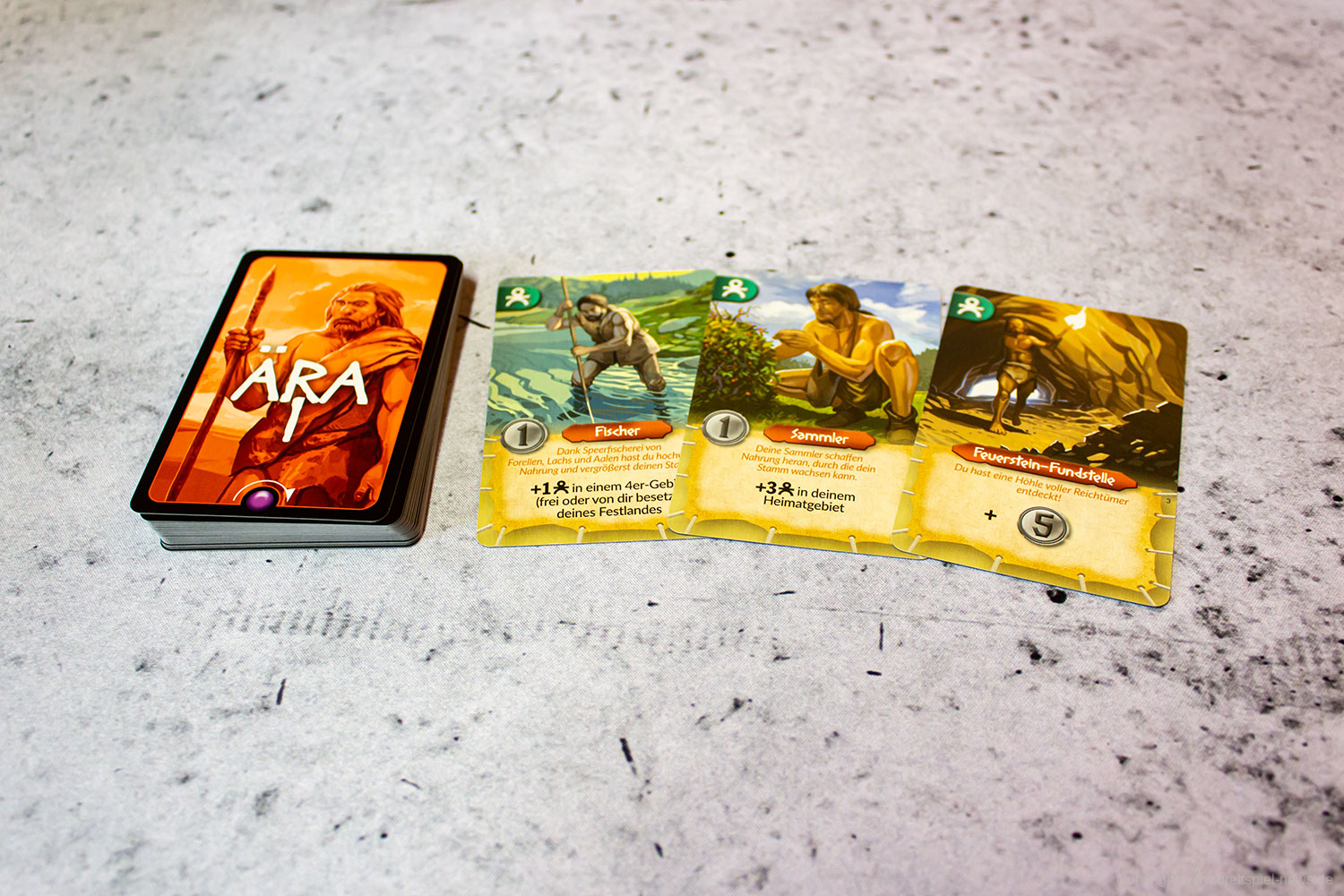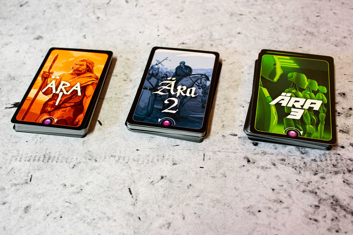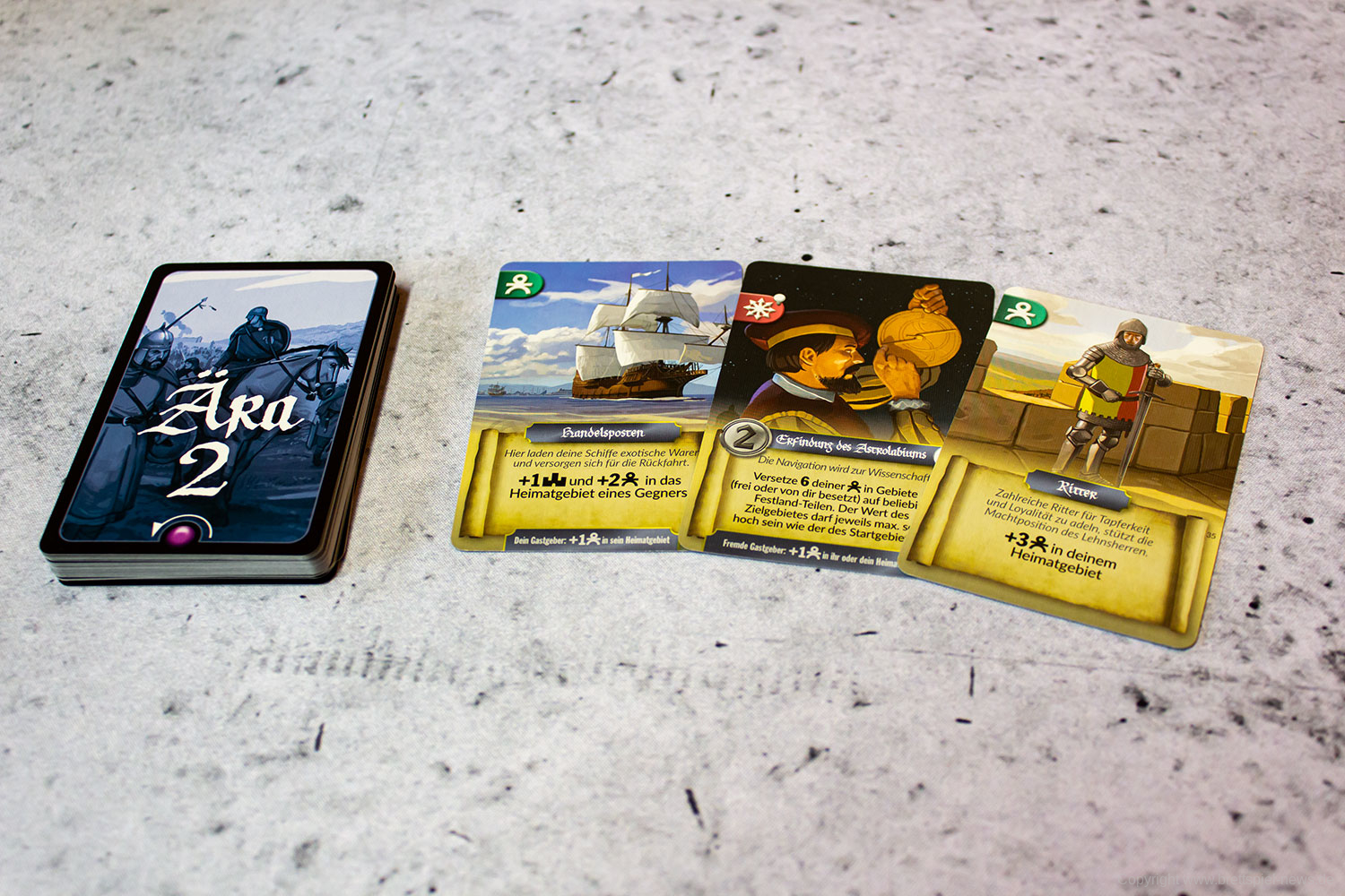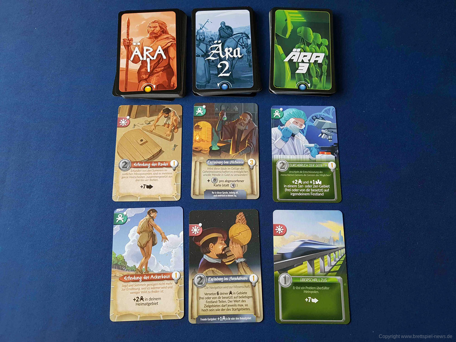 Die drei Zeitalter sind die Steinzeit, das Mittelalter und die nahe Zukunft. Zu Beginn jedes Zeitalters erhältst du etwas Gold und draftest deine Kartenhand.