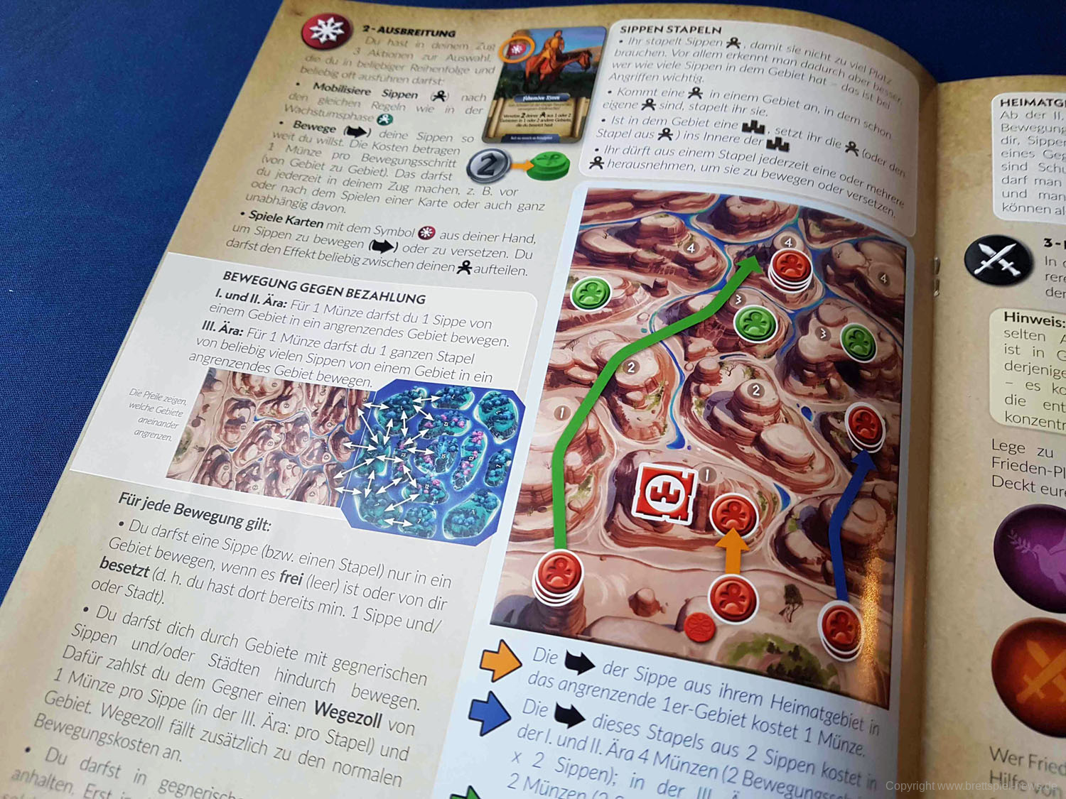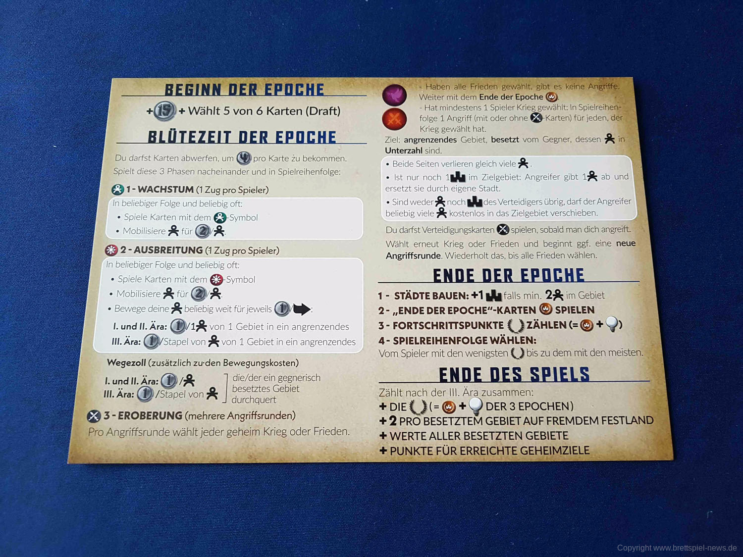 Dann beginnen die 4 Phasen des Zeitalters: Wachstum, Expansion, Angriff und Ende. Jede Karte zeigt genau, in welchen Phasen sie gespielt werden kann. In jeder Phase spielt ihr reihum, bis alle gepasst haben. Dann beginnt die nächste Phase.