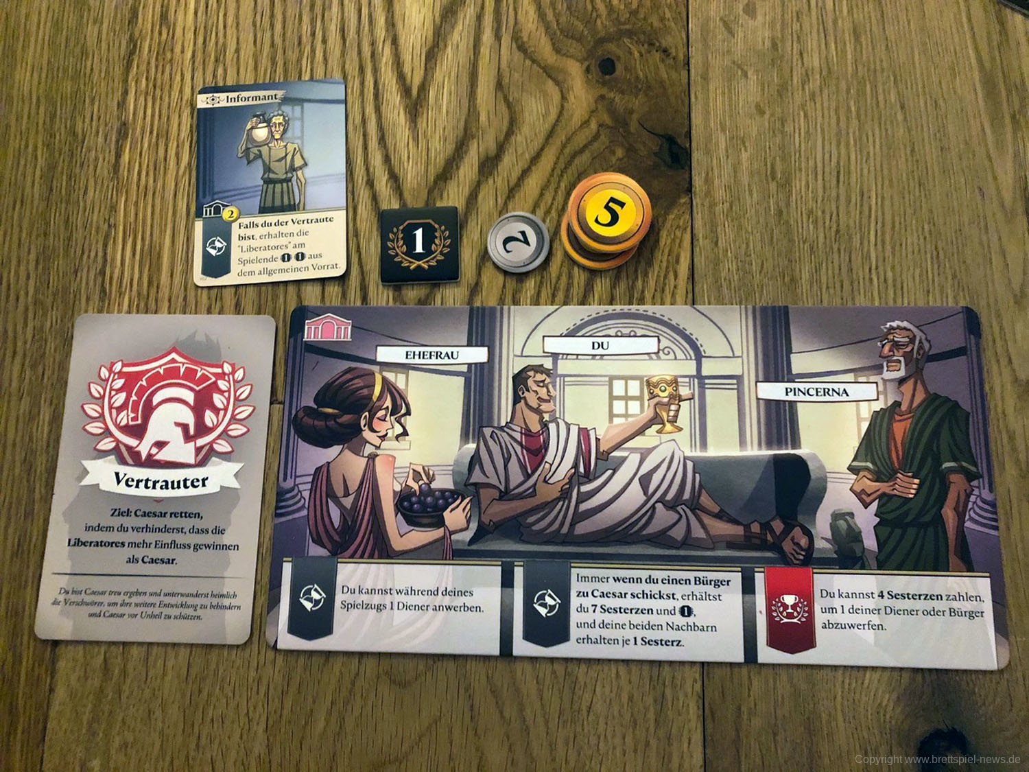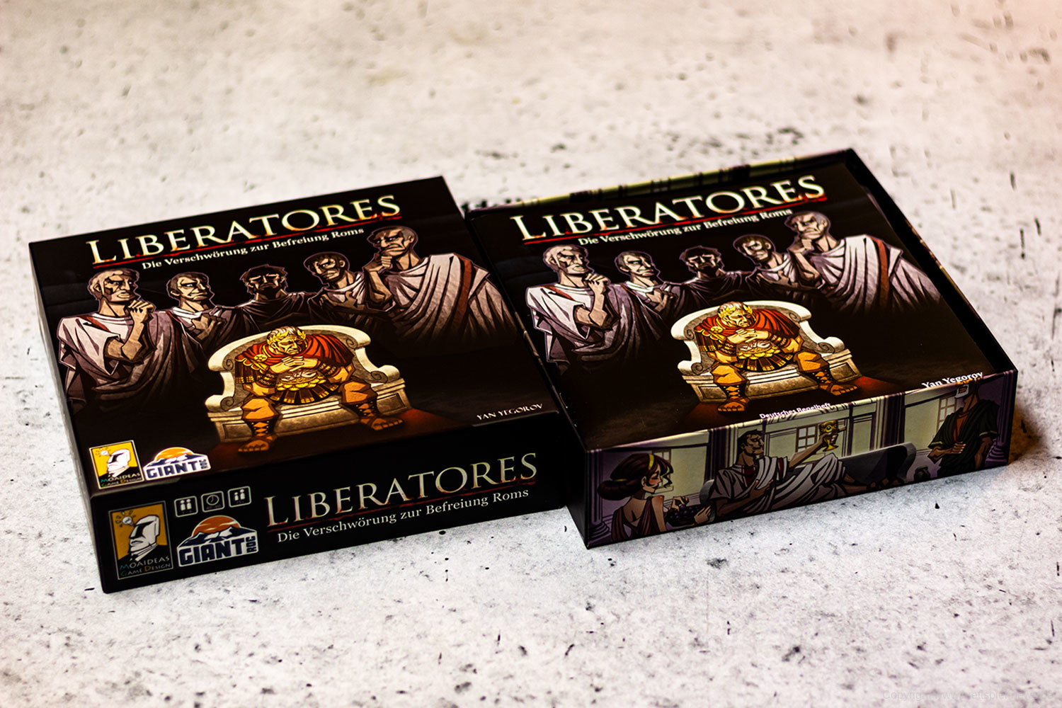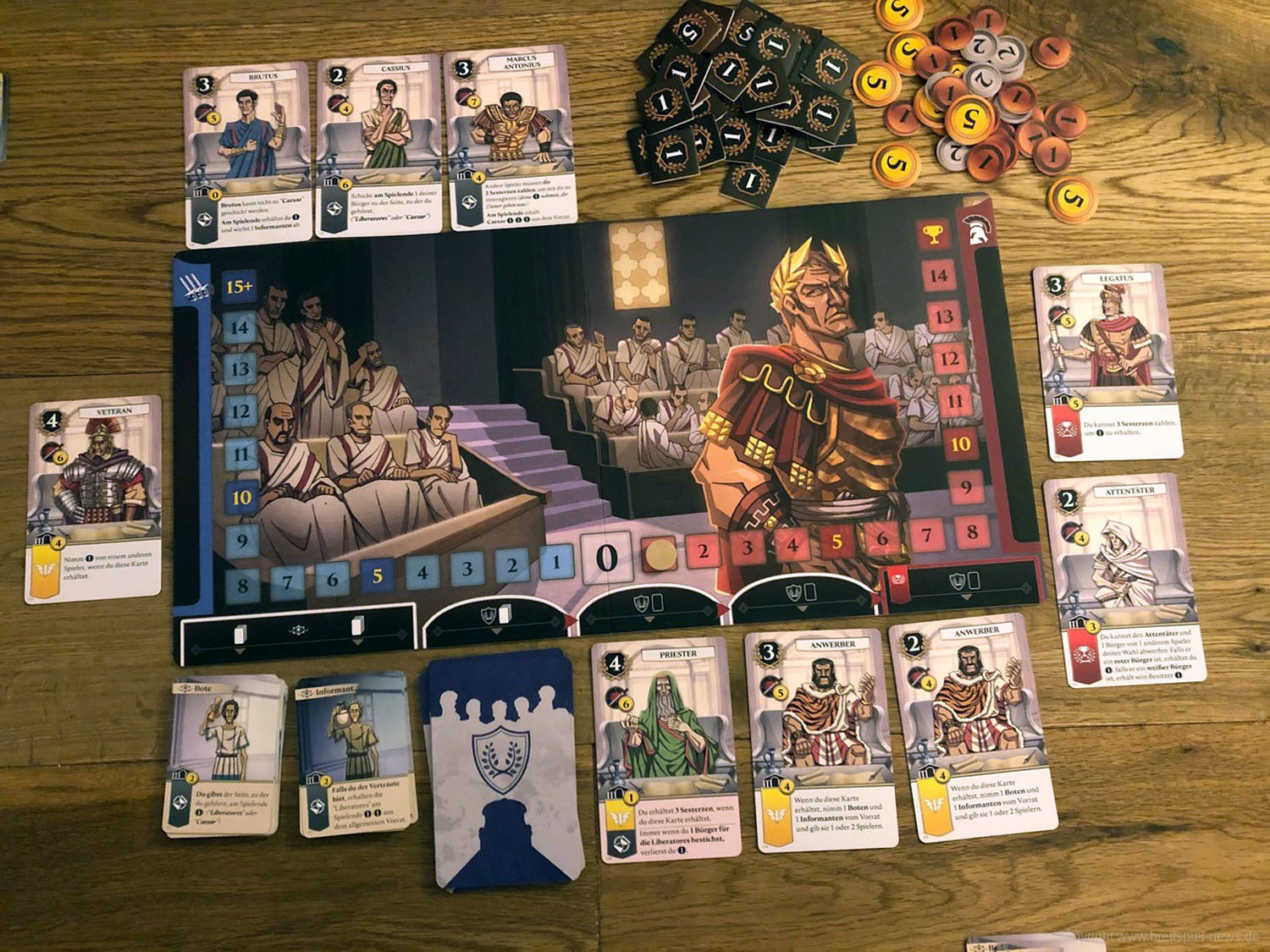 Drei bis sechs Senatoren ab 15 Jahren intrigieren in diesem kartenbasierten Spiel als Liberatores sieben Runden lang gegen Caesar, um ihn zu stürzen. Das Römische Reich soll wieder zu einer Demokratie werden. Dazu muss der Diktator Caesar beseitigt werden. Ihr erreicht euer Ziel, indem ihr im Senat möglichst viel Einfluss gewinnt. Das schafft ihr durch Bestechung, die Unterstützung von Bürgern und Dienern (natürlich ist die nicht umsonst) oder durch Geld und seinen strategischen Einsatz. Doch auch in den eigenen Reihen gibt es Feinde: Einer von euch ist ein Agent Caesars, der ihn heimlich unterstützt und die Verschwörung auffliegen lassen möchte. Und einige Konkurrenten unter euch würden sich, statt die Republik wiederherzustellen, nur zu gern selbst zum Diktator aufschwingen ...