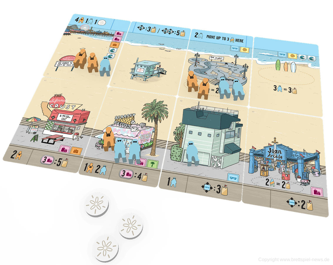 In jedem Zug ziehst du eine Spielkarte aus der Auslage, um entweder den Strand oder die Straße in deinem Abschnitt zu erweitern. Aber nur, wenn Straße und Strand aufeinander abgestimmt sind, bekommst du genügend Siegpunkte, um das Spiel zu gewinnen!