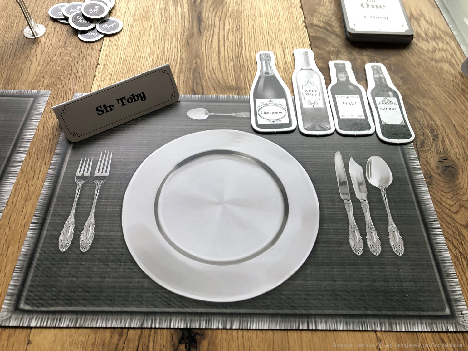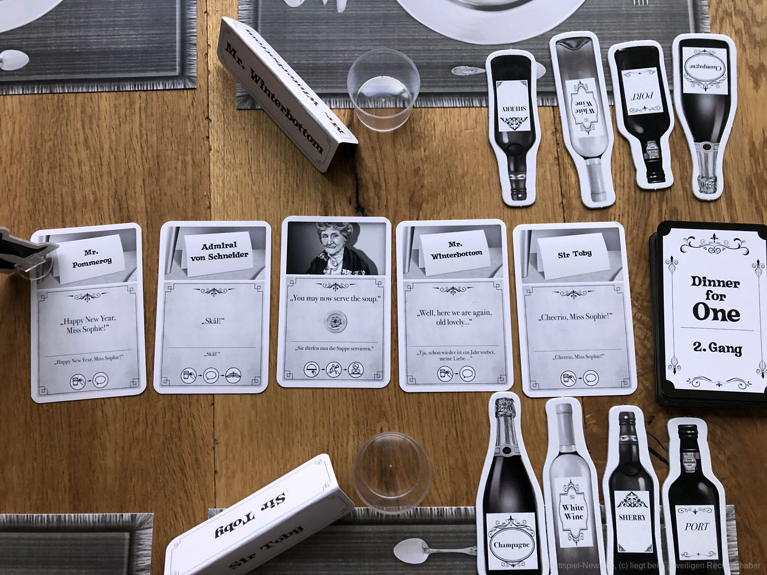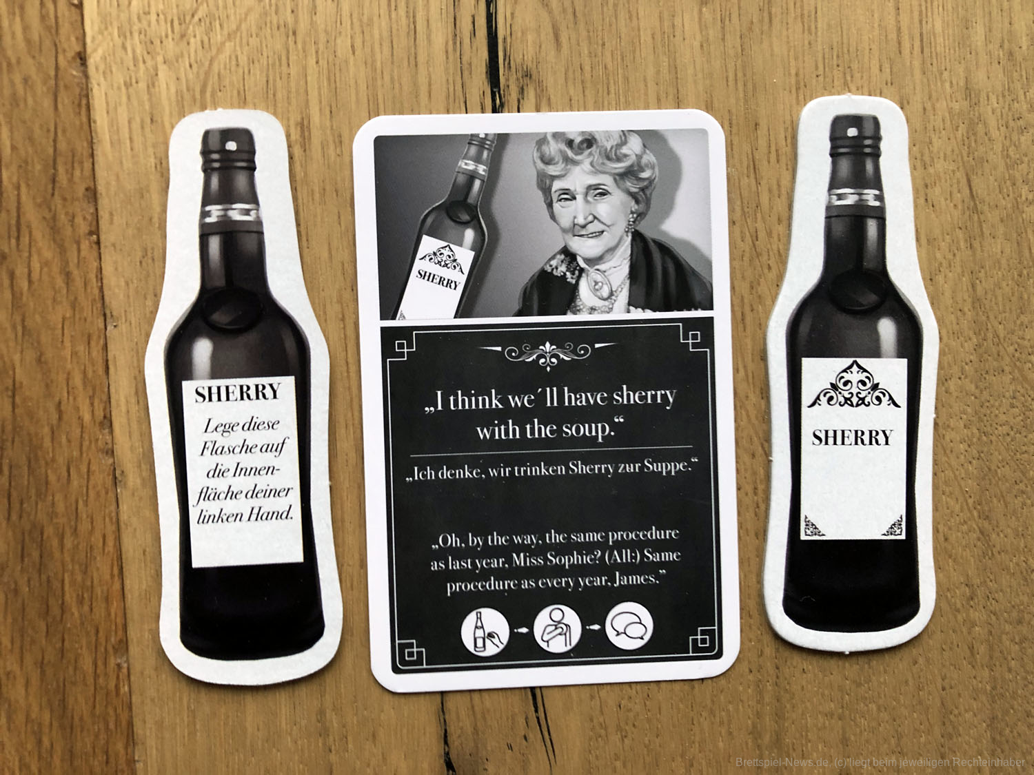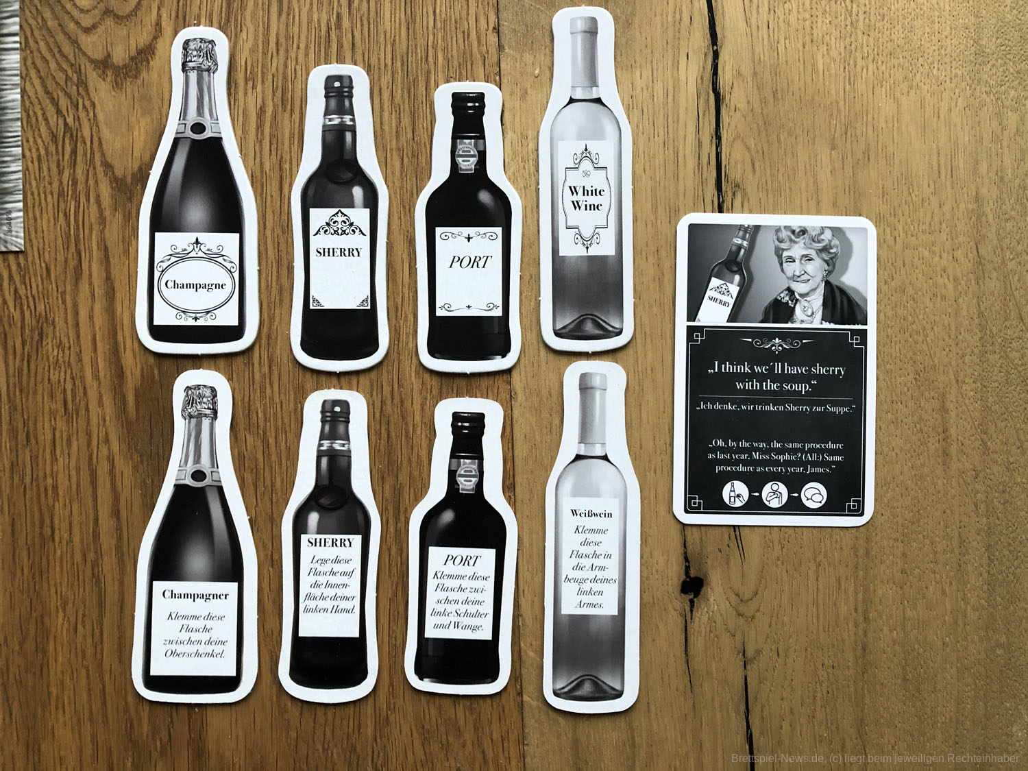 Natürlich darf im Partyspiel auch der zunehmend betrunkene Zustand von Butler James nicht fehlen. Dafür sorgen die Getränkewunschkarten mit Sherry, Weißwein, Portwein und Champagner. Zieht ein Spieler eine solche Karte, müssen sich alle Mitspieler eine Pappflasche auf die Innenfläche der linken Hand legen, als nächstes in die linke Armbeuge klemmen usw. Bewegen wird damit immer schwieriger, geschweige denn über den Tigerkopf springen, gekonnt das Hühnchen servieren oder die Hacken zusammenschlagen. Die Lacher sind garantiert und sorgen für einen unterhaltsamen Abend. Gewonnen hat am Ende, wer am wenigsten Schwips-Chips besitzt. „Skol!“