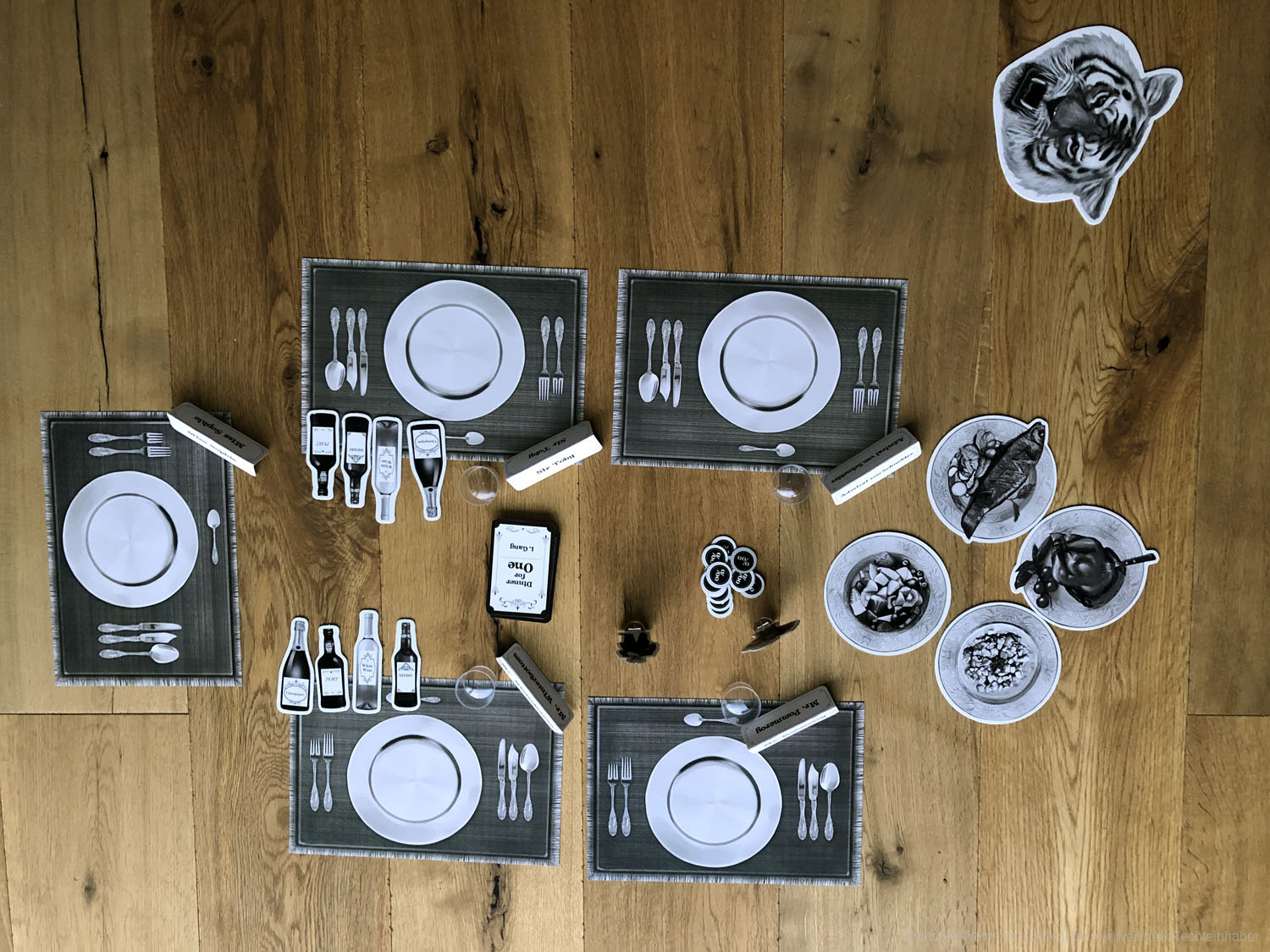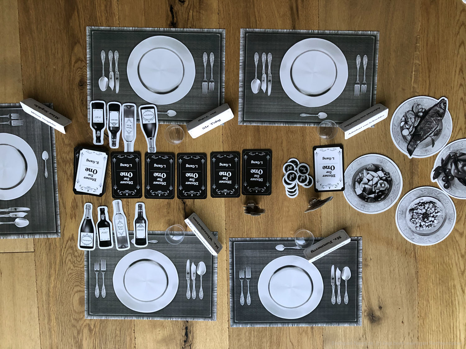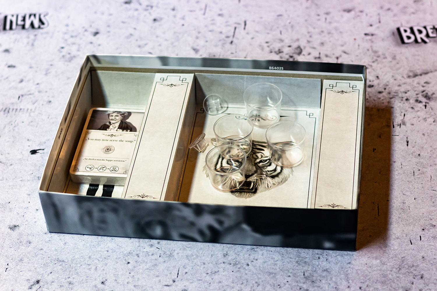 Natürlich darf im Partyspiel auch der zunehmend betrunkene Zustand von Butler James nicht fehlen. Dafür sorgen die Getränkewunschkarten mit Sherry, Weißwein, Portwein und Champagner. Zieht ein Spieler eine solche Karte, müssen sich alle Mitspieler eine Pappflasche auf die Innenfläche der linken Hand legen, als nächstes in die linke Armbeuge klemmen usw. Bewegen wird damit immer schwieriger, geschweige denn über den Tigerkopf springen, gekonnt das Hühnchen servieren oder die Hacken zusammenschlagen. Die Lacher sind garantiert und sorgen für einen unterhaltsamen Abend. Gewonnen hat am Ende, wer am wenigsten Schwips-Chips besitzt. „Skol!“