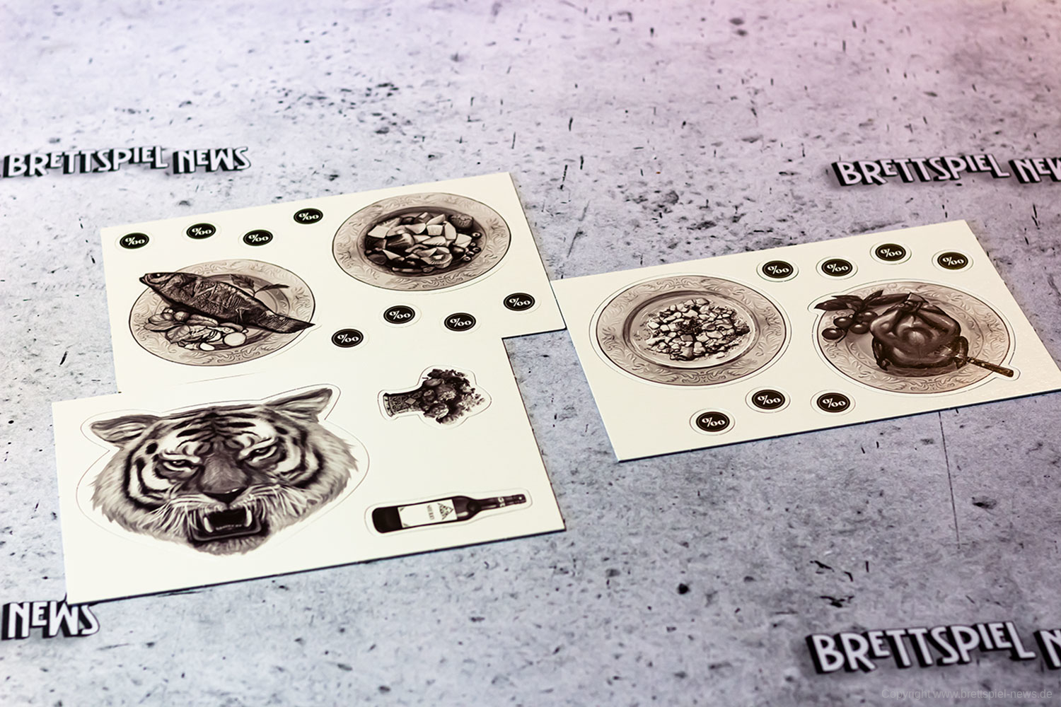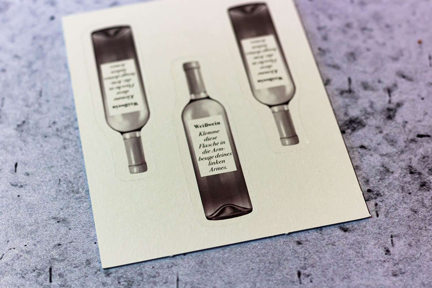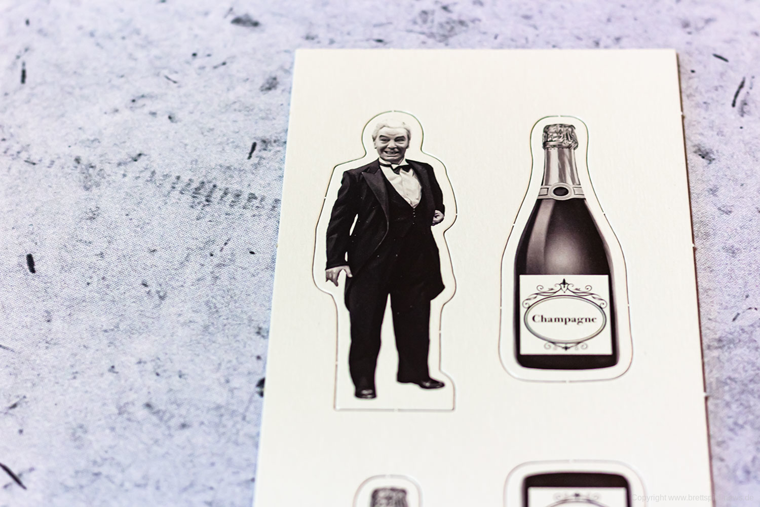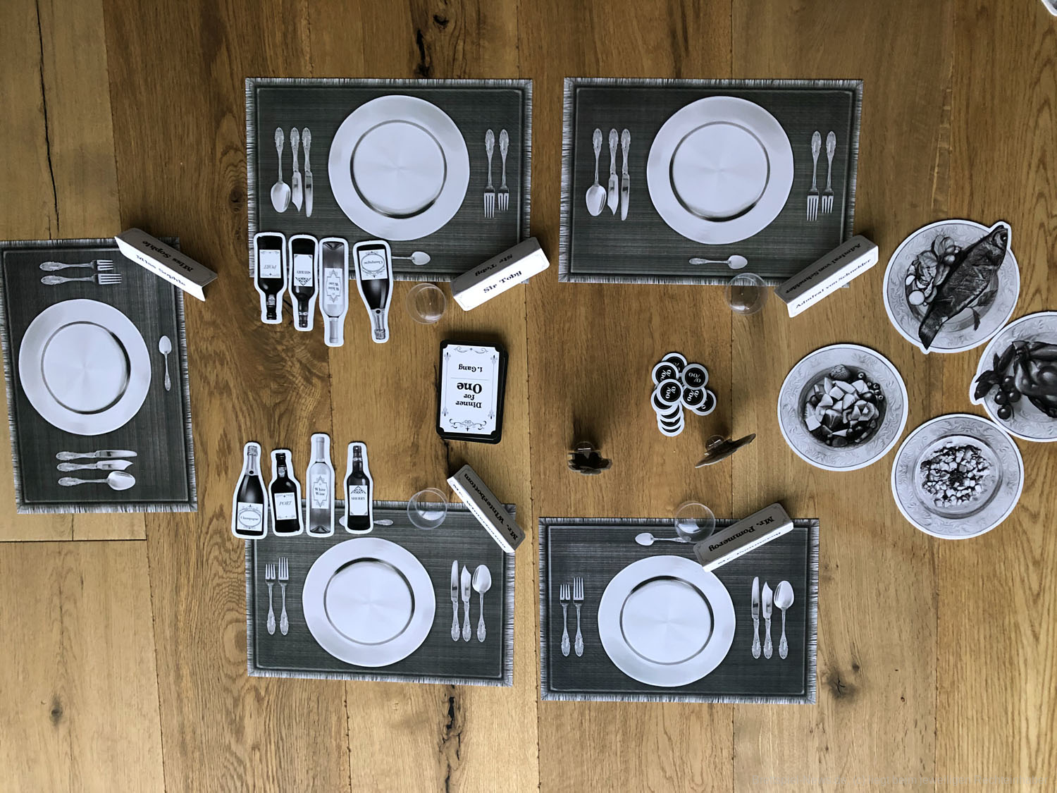 Natürlich darf im Partyspiel auch der zunehmend betrunkene Zustand von Butler James nicht fehlen. Dafür sorgen die Getränkewunschkarten mit Sherry, Weißwein, Portwein und Champagner. Zieht ein Spieler eine solche Karte, müssen sich alle Mitspieler eine Pappflasche auf die Innenfläche der linken Hand legen, als nächstes in die linke Armbeuge klemmen usw. Bewegen wird damit immer schwieriger, geschweige denn über den Tigerkopf springen, gekonnt das Hühnchen servieren oder die Hacken zusammenschlagen. Die Lacher sind garantiert und sorgen für einen unterhaltsamen Abend. Gewonnen hat am Ende, wer am wenigsten Schwips-Chips besitzt. „Skol!“