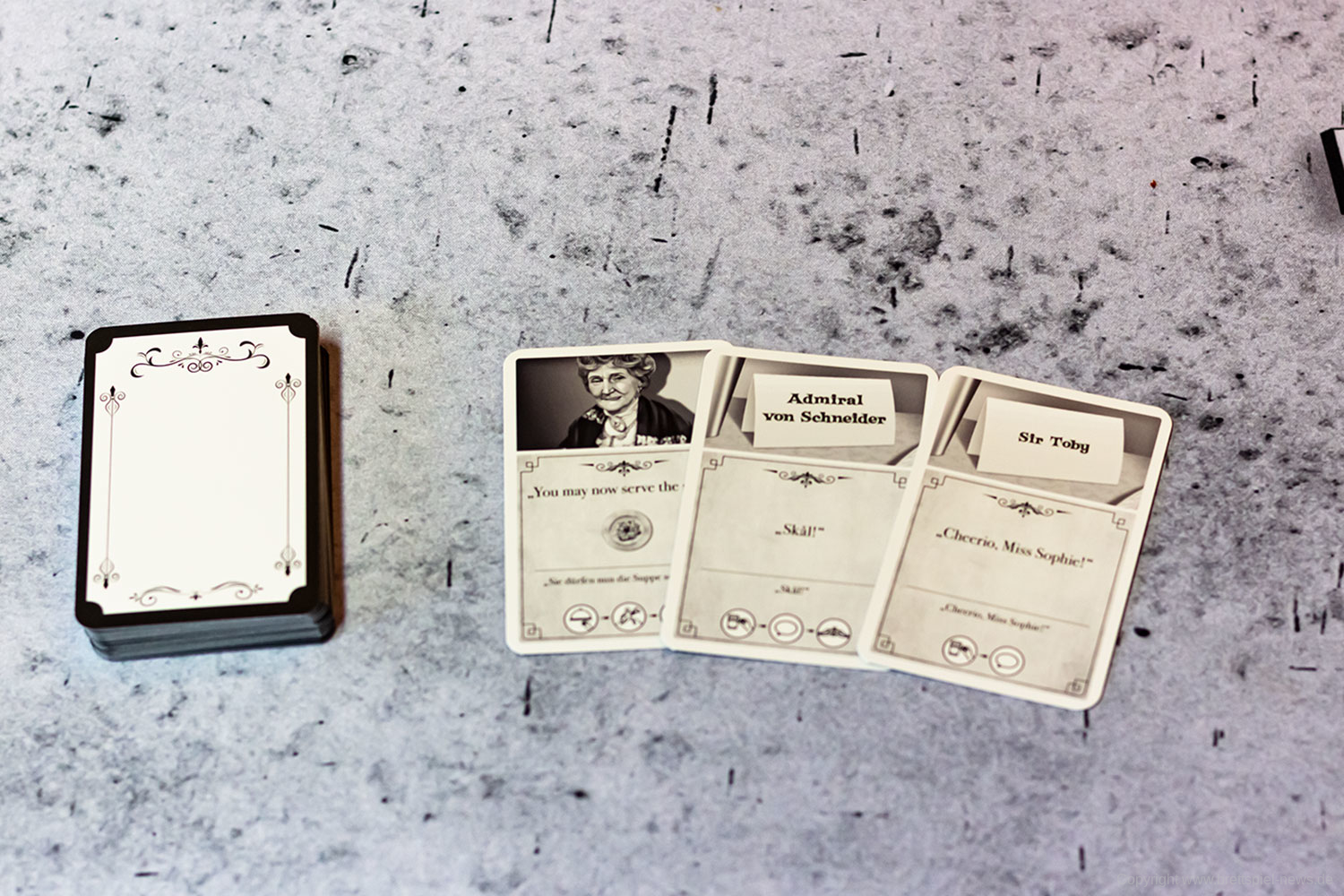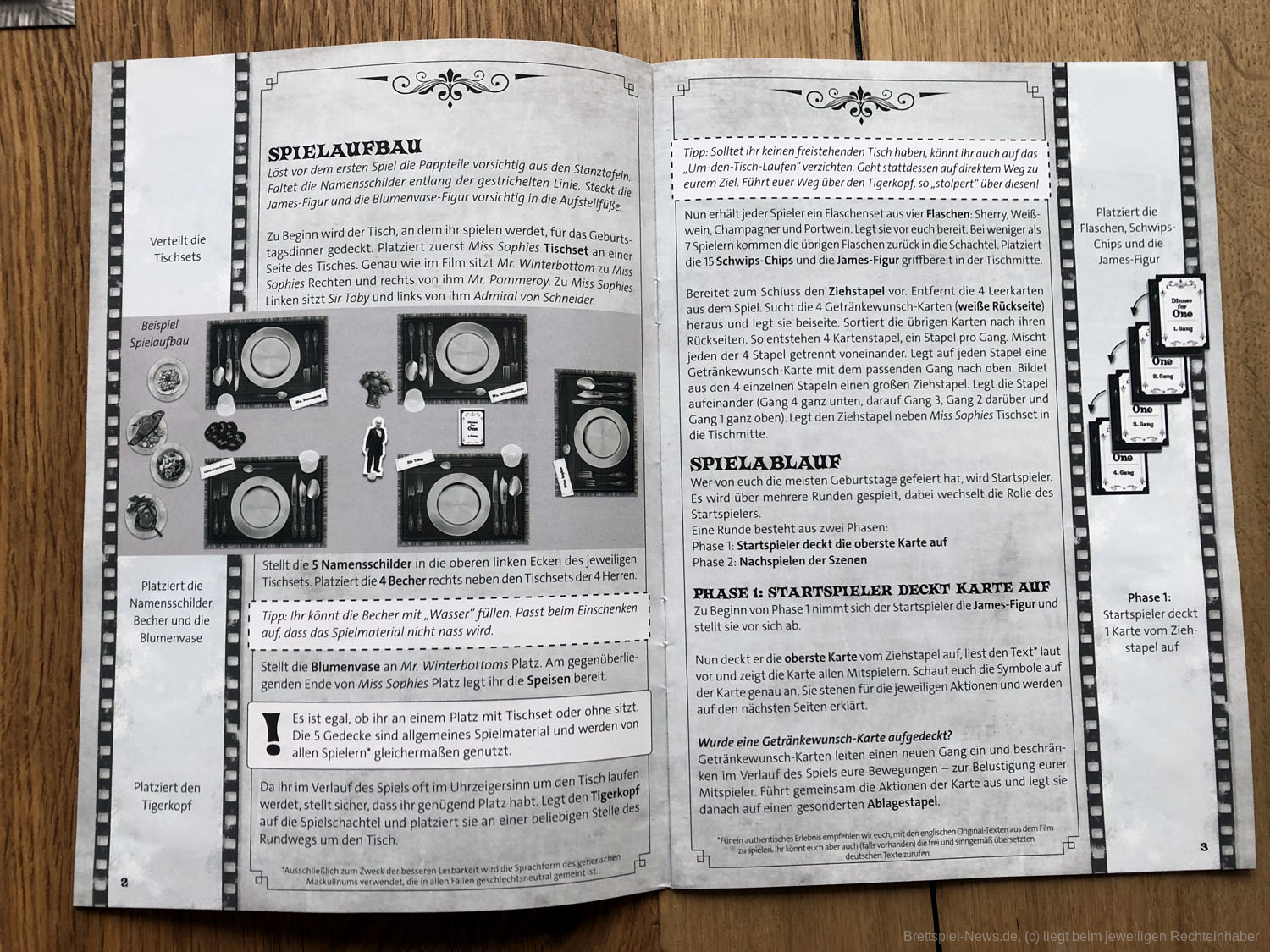 Toasts auf das Geburtstagskind aussprechen, die Hacken zusammenschlagen und Speis und Trank servieren – natürlich inklusive des beherzten Sprungs über den Tigerkopf: Das alles macht eigentlich der Butler „James“. Im Ravensburger Partyspiel von den Erfolgsautoren Inka und Markus Brand übernehmen das die Spieler. Was jeder einzelne – sehr zur Belustigung der Mitspieler – nachspielen muss, das verraten die Karten. In einem Ziehstapel befinden sich in zufälliger Reihenfolge Gast-Karten, Speise- und Getränkewunsch-Karten. Der Startspieler deckt die oberste Karte auf, liest sie laut vor und legt sie verdeckt ab. Nun gilt es, sich die Karte gut zu merken, denn im Lauf des Spiels kommen immer mehr Karten hinzu. Angefangen wird aber immer mit der ersten Karte, dann folgt die zweite usw. Musste man nun als erstes „Cheerio, Miss Sophie“ rufen, dann den Fisch servieren (Achtung, Tigerkopf nicht vergessen) und als nächstes mit hoher Piepsstimme „Happy New Year, Sophie“ flöten? Oder kam der Fisch zum Schluss? Oder…