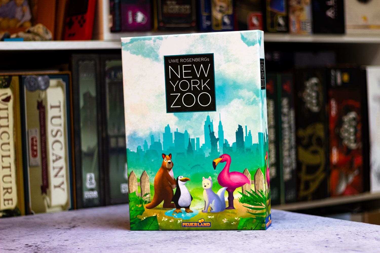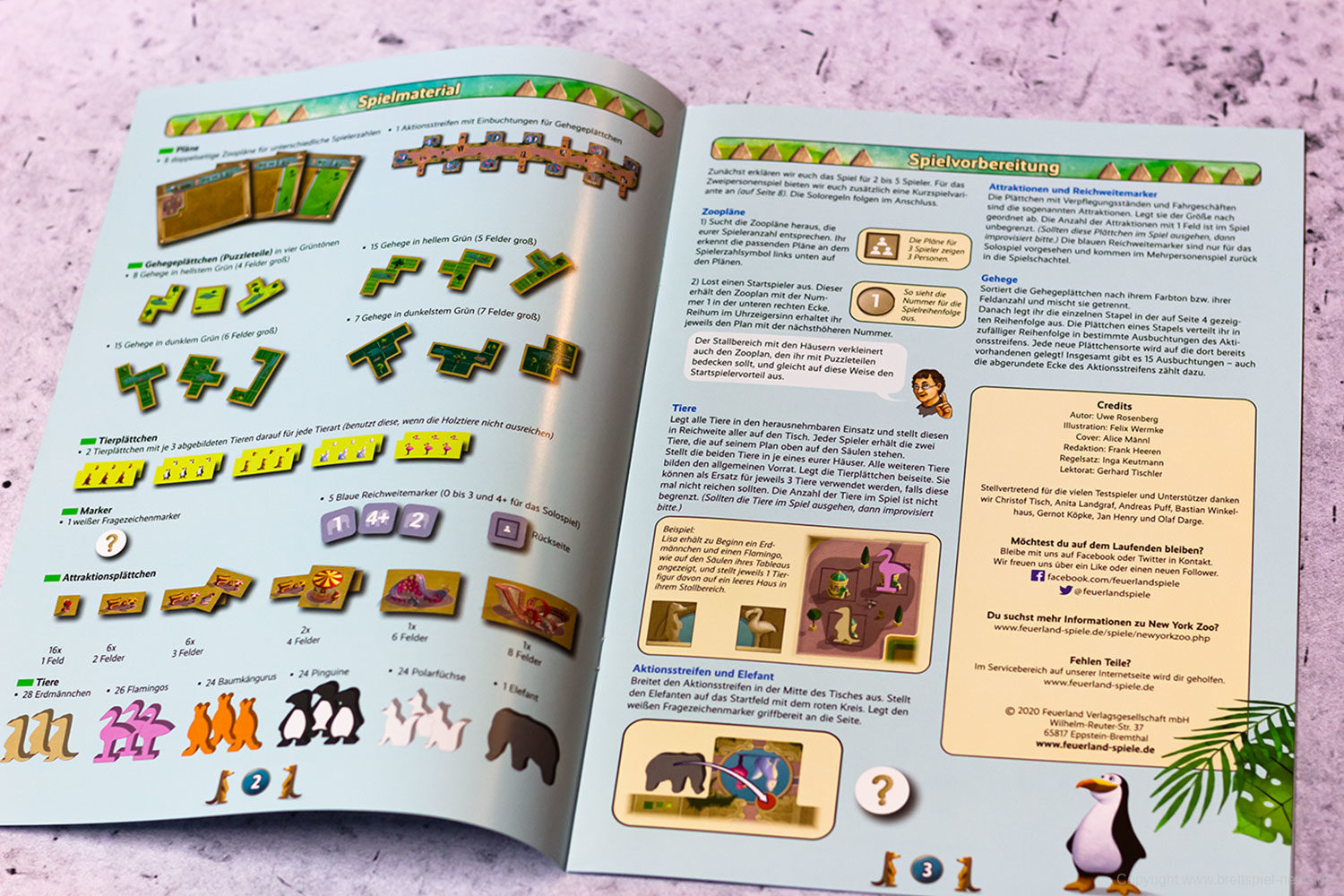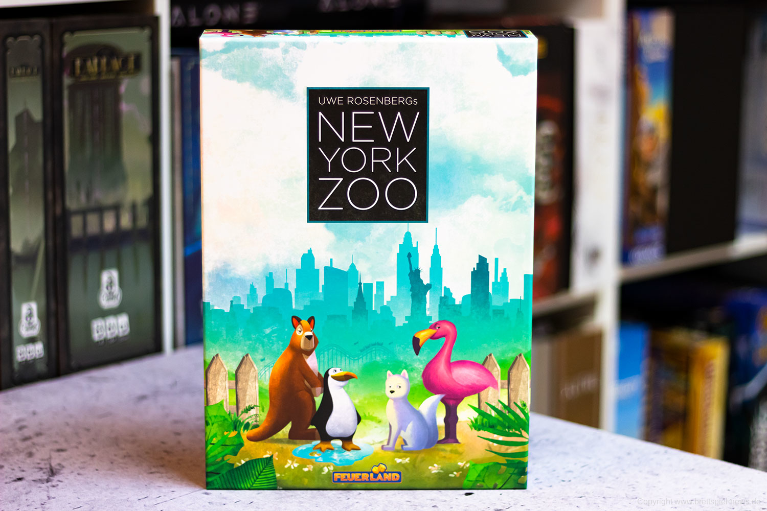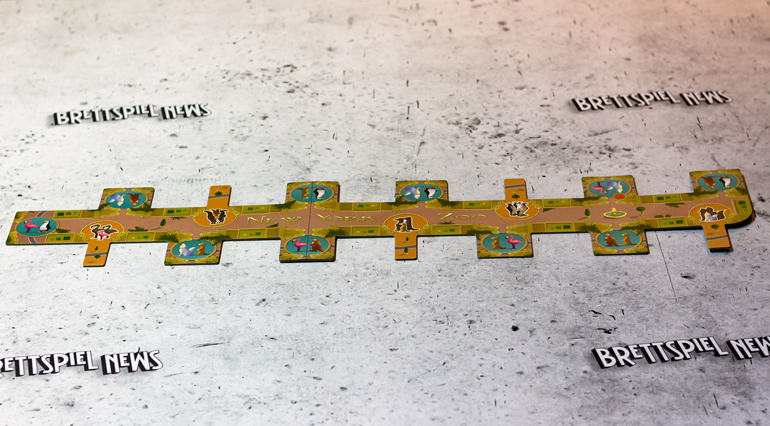 NEW YORK ZOO von UWE ROSENBERG ist eine kommende Neuheit von FEUERLAND. Wir haben ein Exemplar bereits erhalten und zeigen Bilder vom Spielmaterial. Es handelt sich bei NEW YORK ZOO um ein Legespiel, bei dem vorhandene Parkflächen mit verschiedenen Tieren und Attraktionen optimal zu füllen sind. Das Spiel richtet sich an ein bis fünf Spieler ab 10 Jahren und soll zwischen 30-60 Minuten dauern. Mit enthalten sind über 120 Tierfiguren aus Holz, 45 Puzzleteile und 32 Attraktionsplättchen.