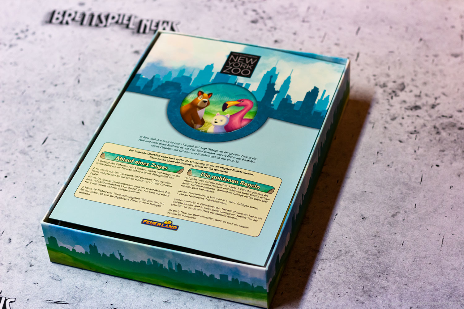 In New York Zoo errichtet ihr einen Tierpark. Baut Gehege, stattet diese mit Tieren aus und lasst sie Nachwuchs bekommen. Die Grundregeln des Spieles sind schnell erlernt, denn es gibt nur zwei Aktionsmöglichkeiten: Setzt ein neues Gehege auf eurem Zooplan ein oder beschafft euch Tiere für die Anlagen. Dabei ist aber ein gutes Timing gefragt, denn in euren Zügen löst ihr immer wieder Tiervermehrungen aus, an denen ihr teilhaben wollt.