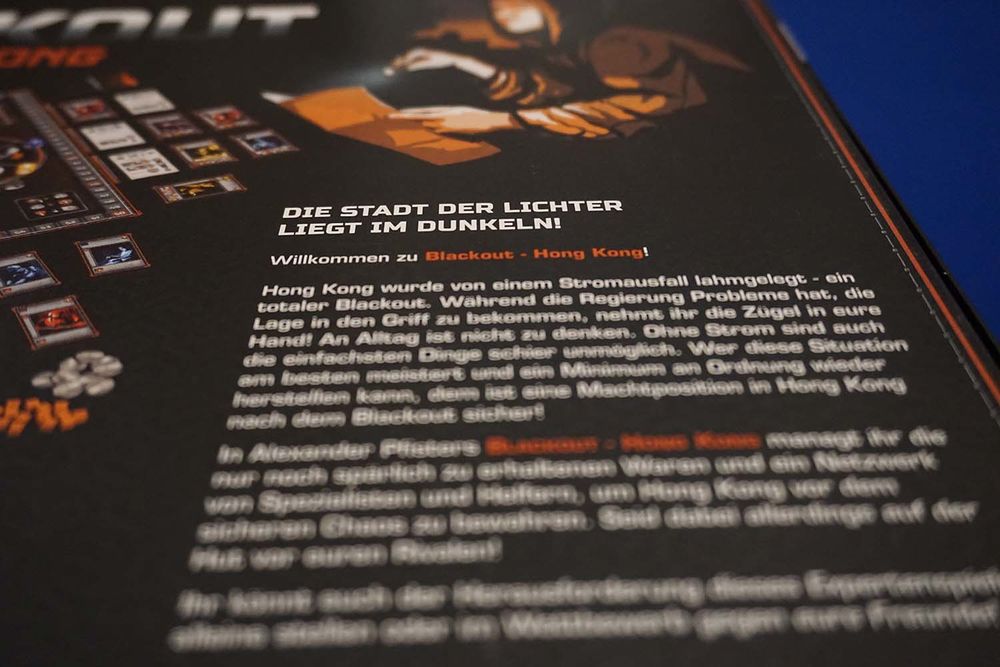 In Alexander Pfisters Blackout - Hong Kong, managen die Spieler die nur noch spärlich zu erhaltenen Waren sowie ein Netzwerk von Spezialisten und Helfern, um Hong Kong vor dem sicheren Chaos zu bewahren. Dabei müssen sie gleichzeitig auf der Hut vor ihren Rivalen sein. Sie können sich der Herausforderung dieses Expertenspiels alleine stellen oder im Wettbewerb gegen Freunde.