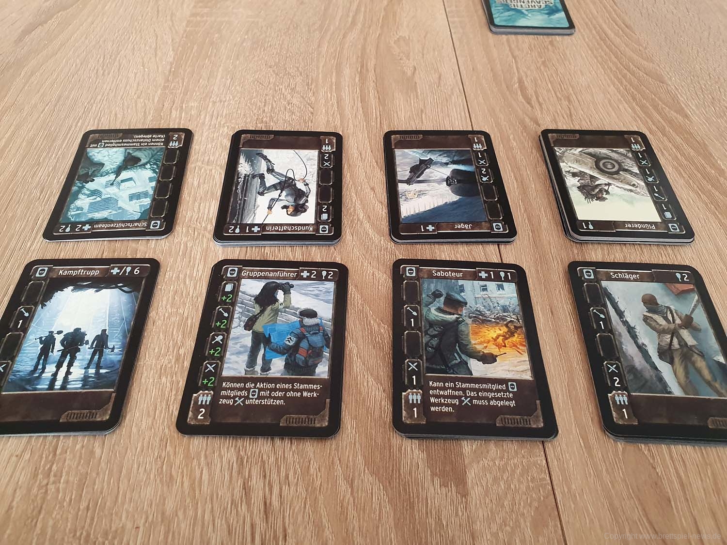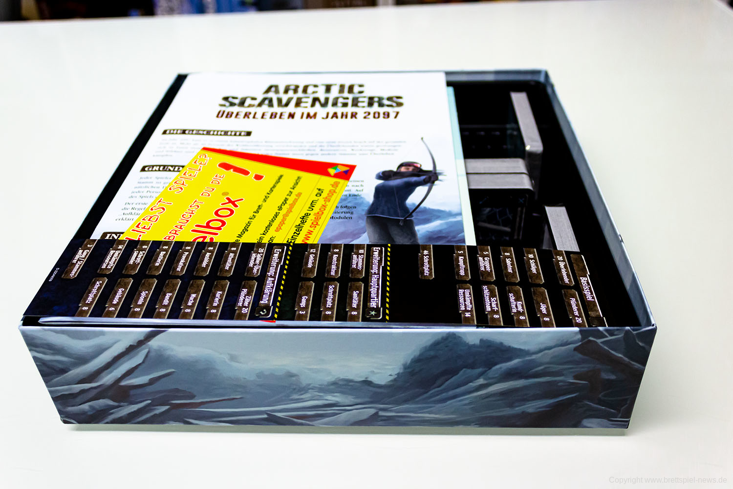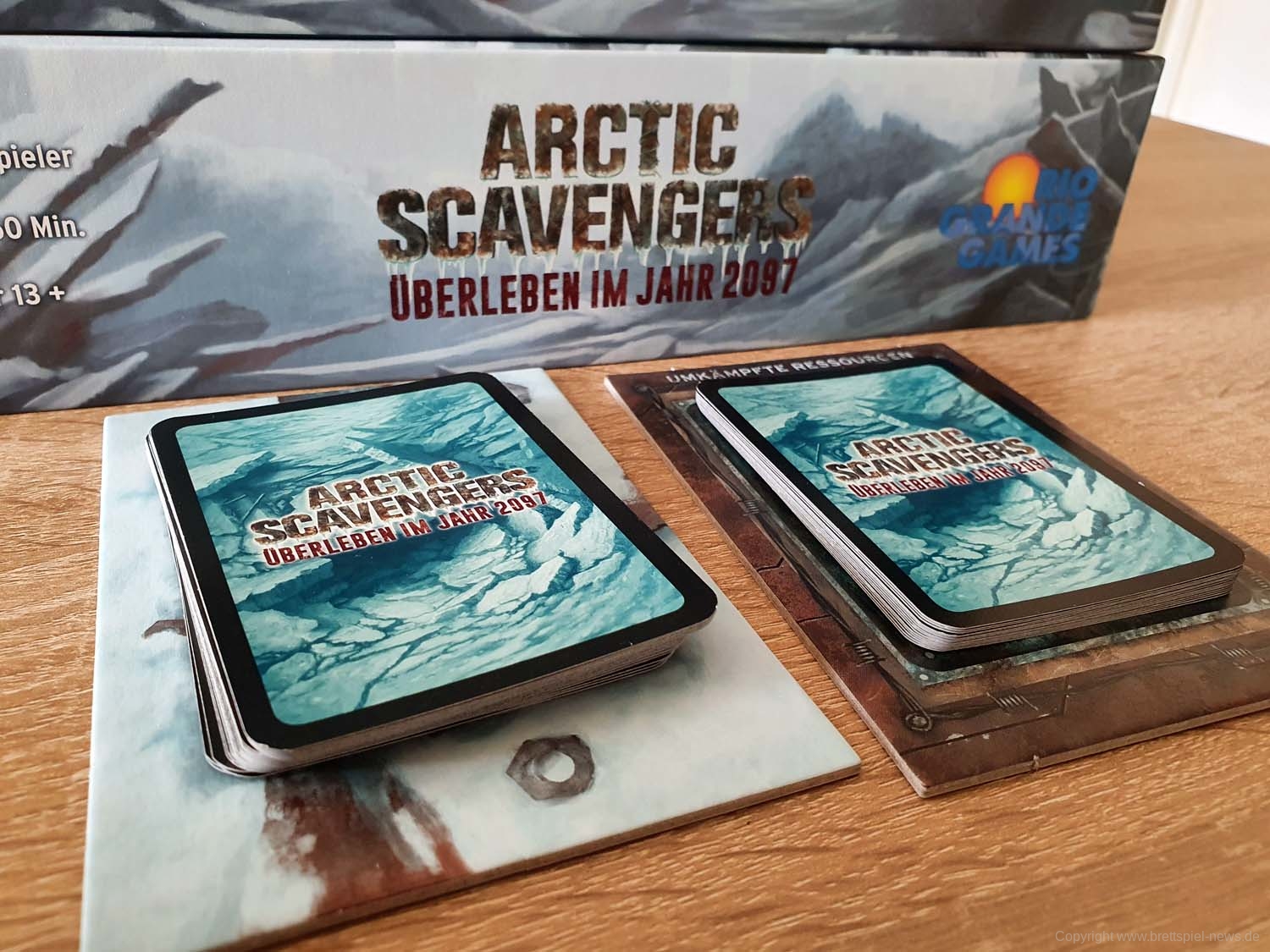 Erweiterung des Hauptquartiers: Die erste Erweiterung für Arctic Scavengers führt die Idee eines Basislagers oder Hauptquartiers für jeden Stamm ein. Dieses Basislager besteht aus einem Stammesführer (komplett mit Spezialfähigkeiten) und dem Potenzial, Gebäude zu errichten, die während des Spiels strategisch genutzt werden können. Zusätzlich führt das Spiel alternative Siegespfade, neue Söldner, neue Werkzeuge und die Erweiterung um den Stapel "Konstruktionsschemata".