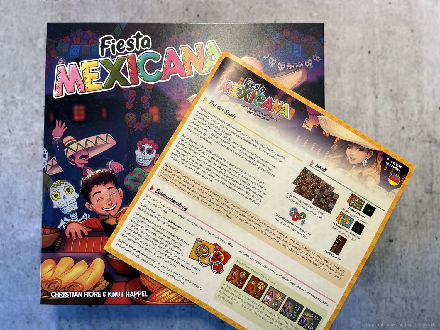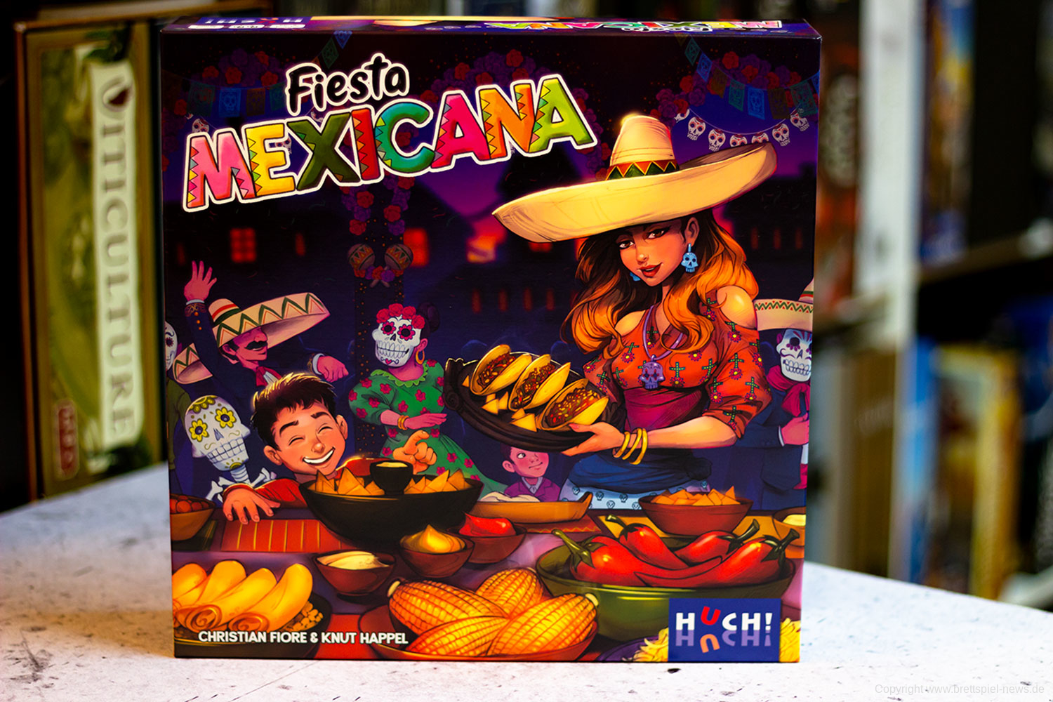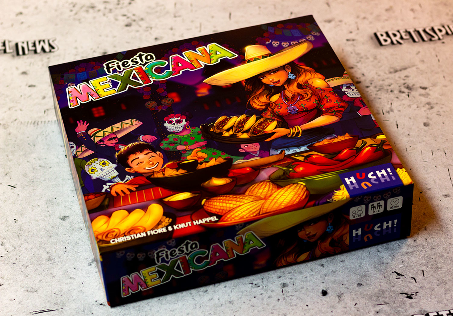 Mit FIESTA MEXICANA erscheint bei HUCH! ein Spiel von CHRISTIAN FIORE & KNUT HAPPEL. Das Spiel ist für 2-4 Spieler ausgelegt und ab acht Jahren geeignet. Eine Partie soll in 30 Minuten gespielt sein. FIESTA MEXICANA ist ein Legespiel, das sich mit dem großen mexikanischen Familienfest zur Ehrung der Toten befasst.