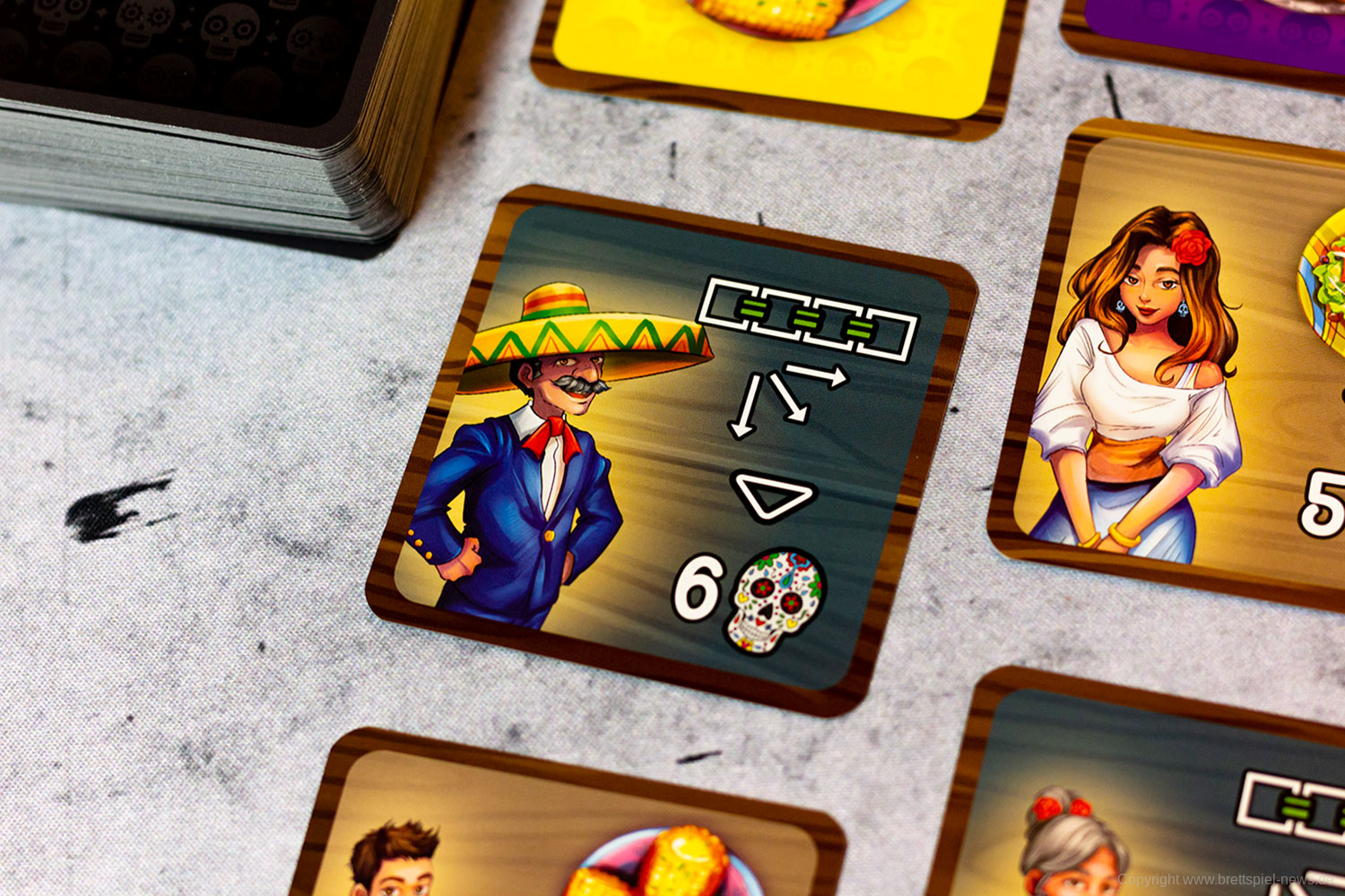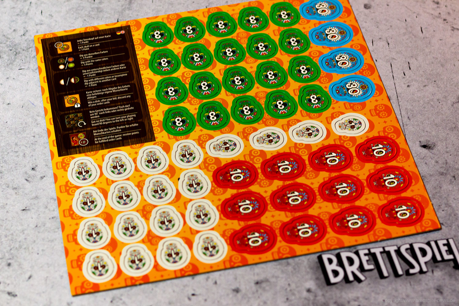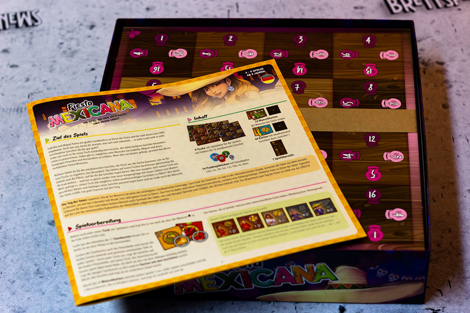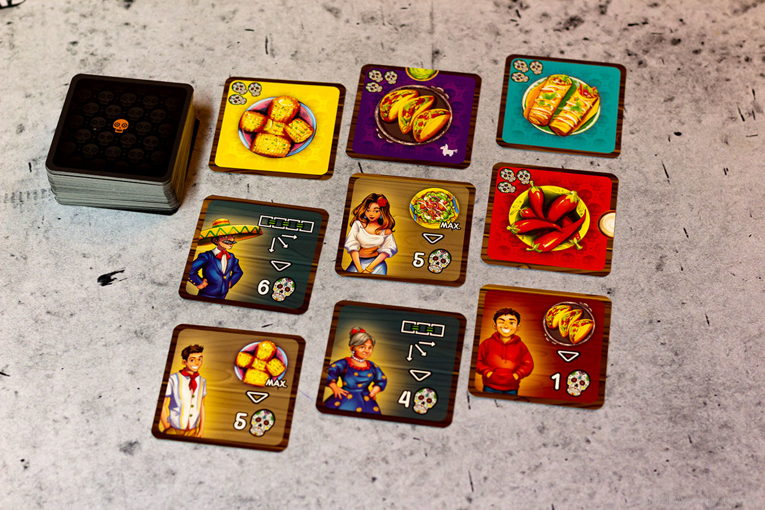 Isabella und Miguel feiern ein großes Familienfest zu Ehren der Toten und ihr wollt ihnen helfen. Doch die vielen Gäste und verschiedenen Gerichte fordern euch ganz schön heraus! Jeder von euch ist für einen Tisch zuständig und versucht, die Wünsche der Gäste zu erfüllen. Reihum bietet ihr für die Speisen - doch aufgepasst: Die freien Zahlen auf euren Tischen bestimmen gleichzeitig eure Gebote und die Plätze, auf die ihr die Gerichte legen könnt! Wer leer ausgeht, darf seinen Tisch um 90° drehen - und bekommt so wieder neue Zahlen zum Bieten!