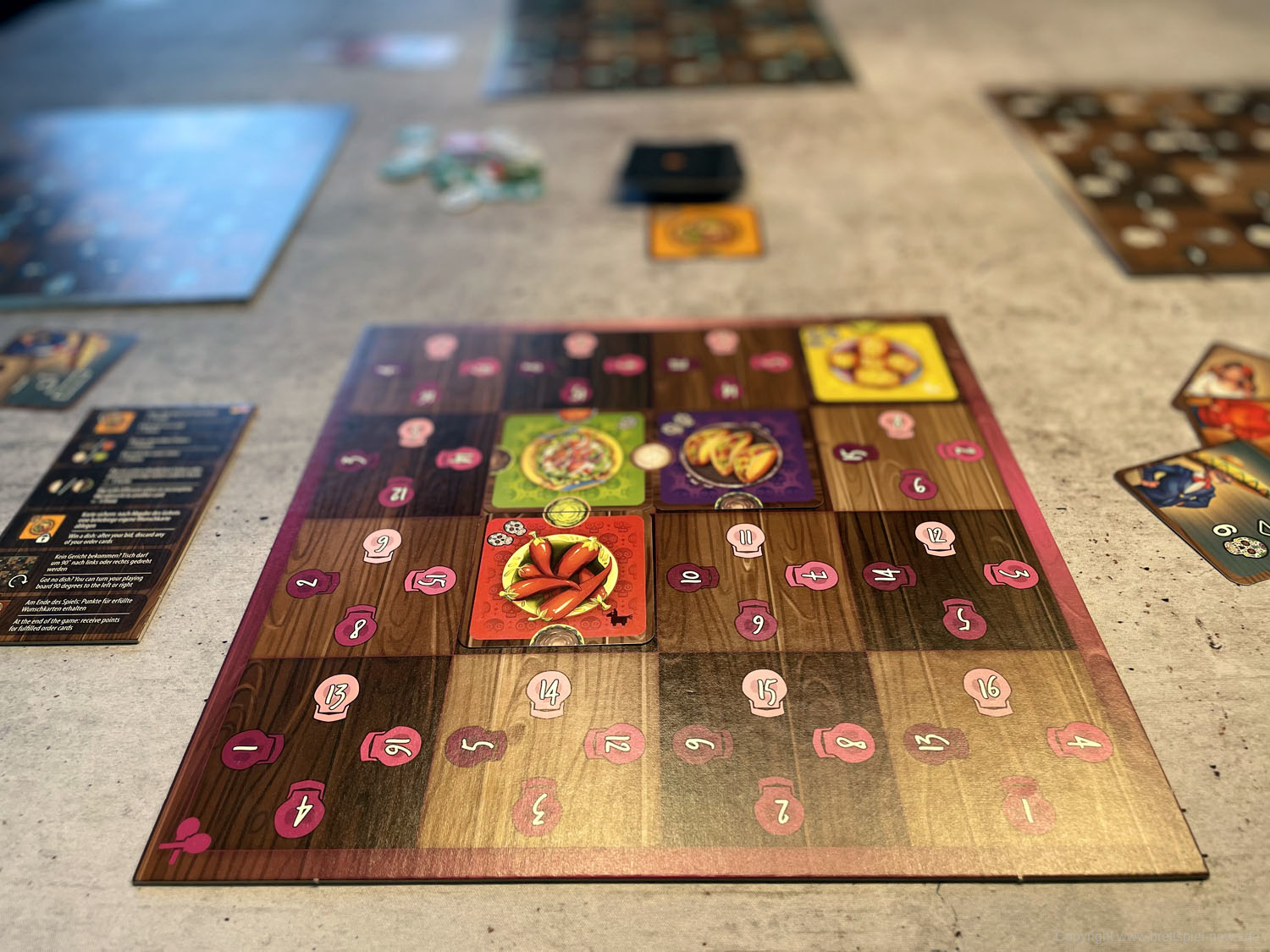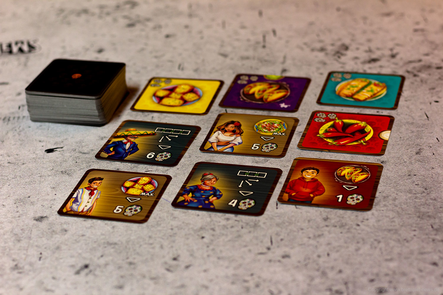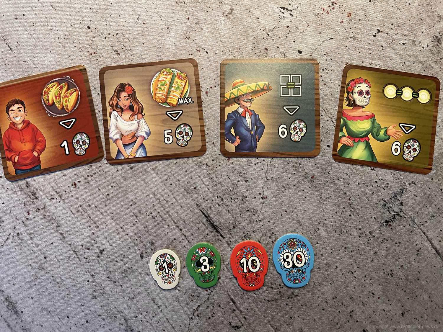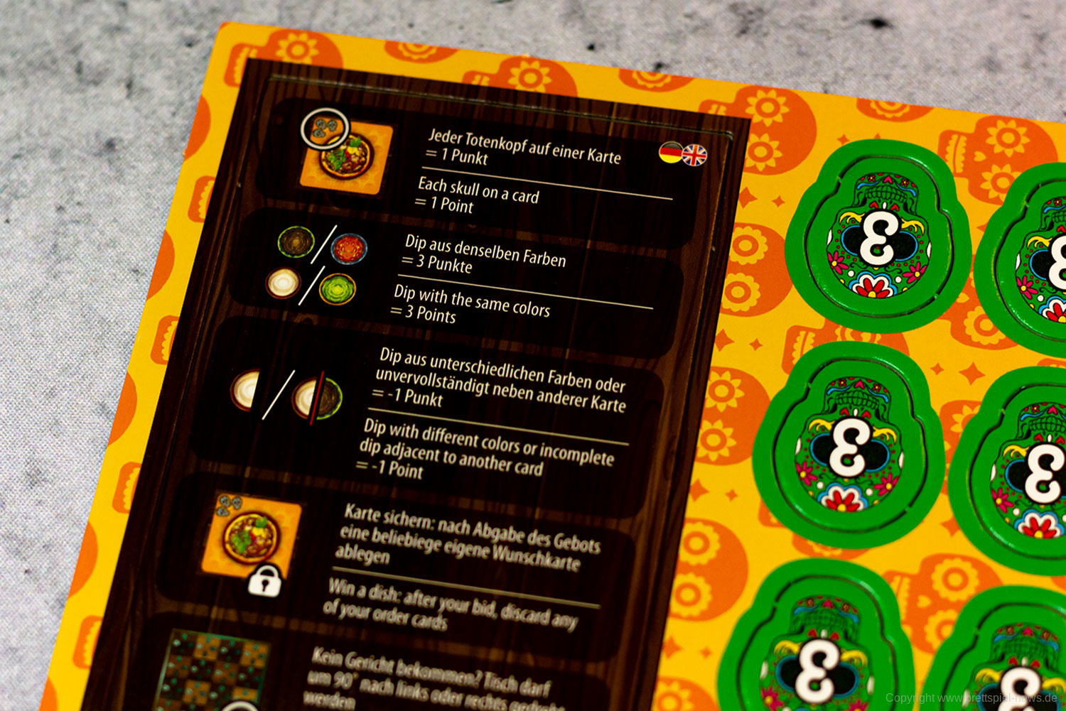 Isabella und Miguel feiern ein großes Familienfest zu Ehren der Toten und ihr wollt ihnen helfen. Doch die vielen Gäste und verschiedenen Gerichte fordern euch ganz schön heraus! Jeder von euch ist für einen Tisch zuständig und versucht, die Wünsche der Gäste zu erfüllen. Reihum bietet ihr für die Speisen - doch aufgepasst: Die freien Zahlen auf euren Tischen bestimmen gleichzeitig eure Gebote und die Plätze, auf die ihr die Gerichte legen könnt! Wer leer ausgeht, darf seinen Tisch um 90° drehen - und bekommt so wieder neue Zahlen zum Bieten!