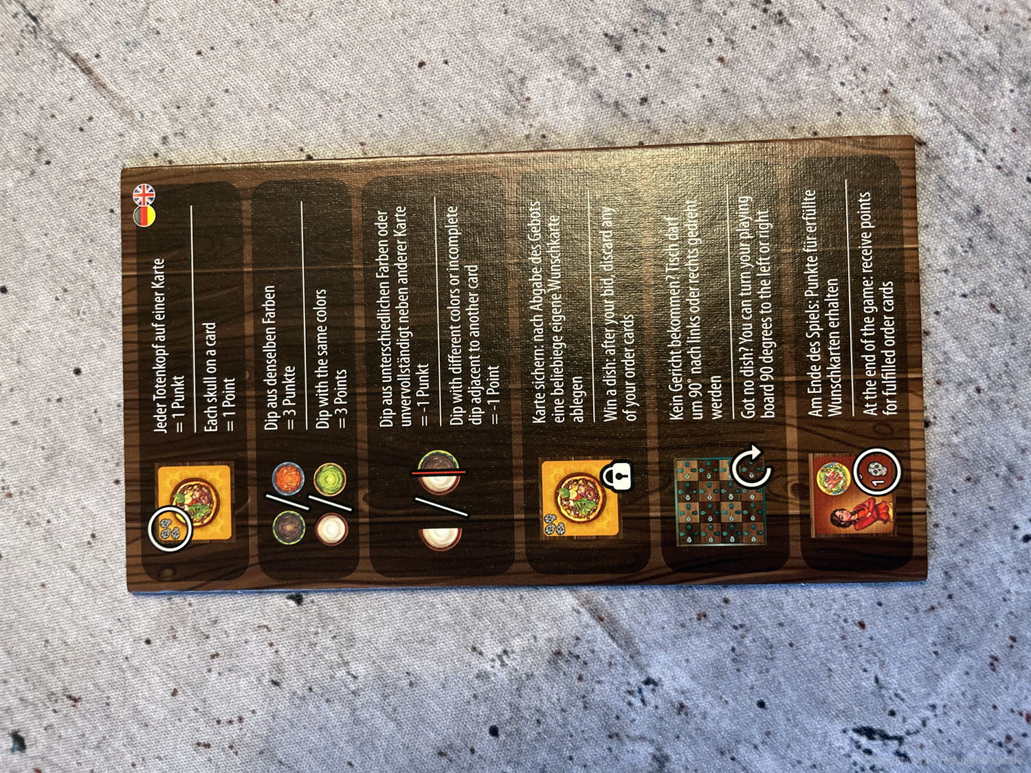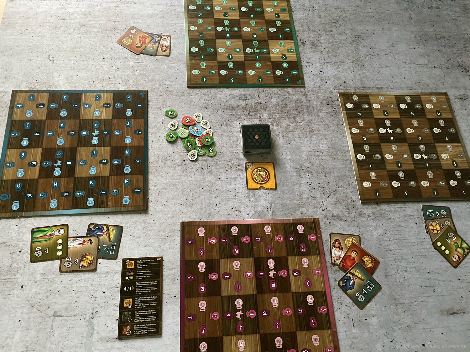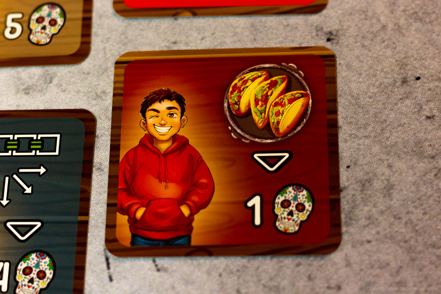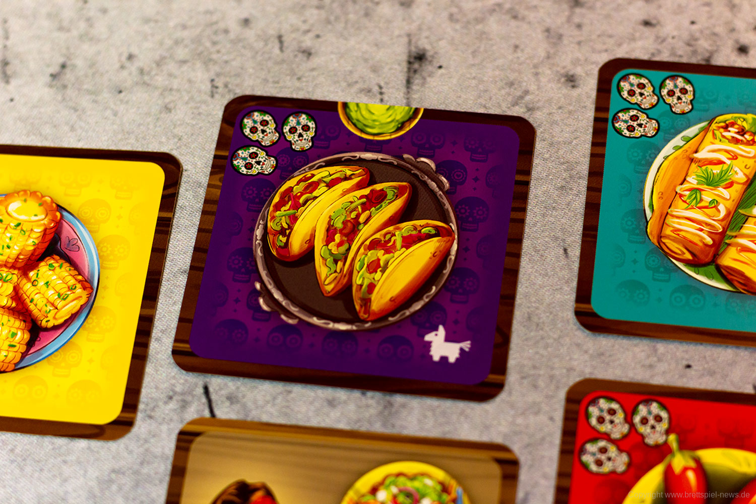 Isabella und Miguel feiern ein großes Familienfest zu Ehren der Toten und ihr wollt ihnen helfen. Doch die vielen Gäste und verschiedenen Gerichte fordern euch ganz schön heraus! Jeder von euch ist für einen Tisch zuständig und versucht, die Wünsche der Gäste zu erfüllen. Reihum bietet ihr für die Speisen - doch aufgepasst: Die freien Zahlen auf euren Tischen bestimmen gleichzeitig eure Gebote und die Plätze, auf die ihr die Gerichte legen könnt! Wer leer ausgeht, darf seinen Tisch um 90° drehen - und bekommt so wieder neue Zahlen zum Bieten!