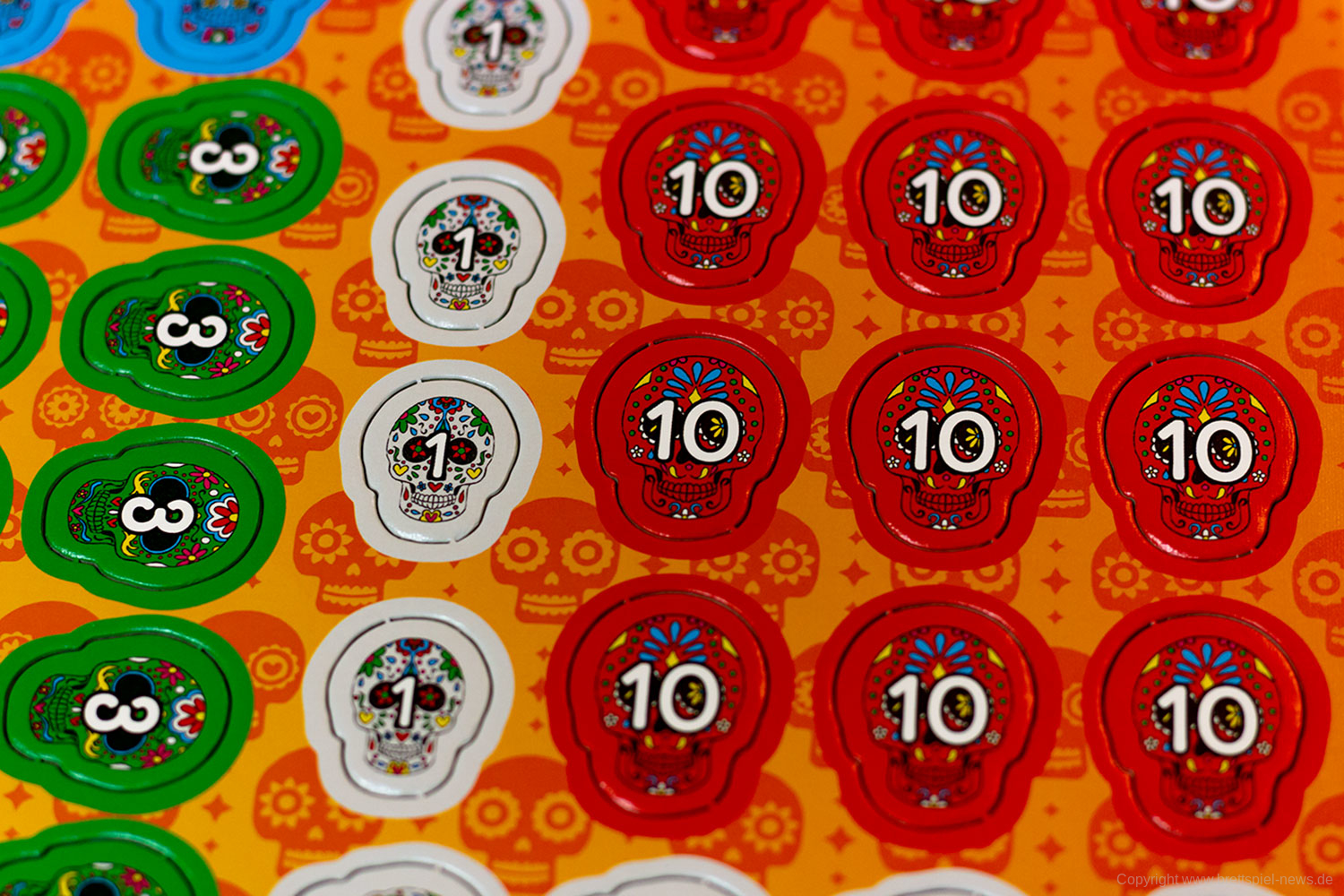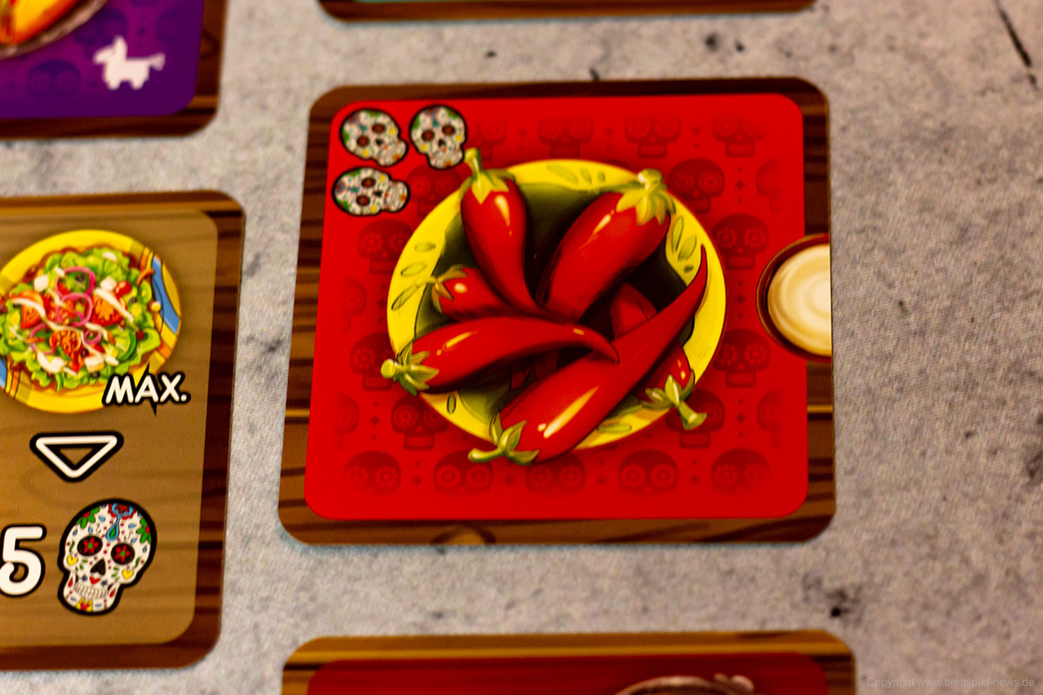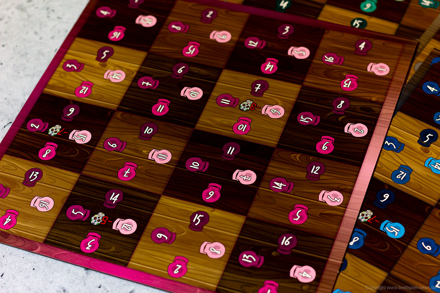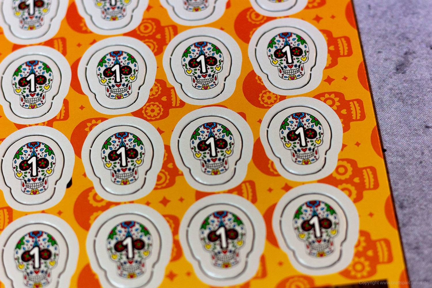 Isabella und Miguel feiern ein großes Familienfest zu Ehren der Toten und ihr wollt ihnen helfen. Doch die vielen Gäste und verschiedenen Gerichte fordern euch ganz schön heraus! Jeder von euch ist für einen Tisch zuständig und versucht, die Wünsche der Gäste zu erfüllen. Reihum bietet ihr für die Speisen - doch aufgepasst: Die freien Zahlen auf euren Tischen bestimmen gleichzeitig eure Gebote und die Plätze, auf die ihr die Gerichte legen könnt! Wer leer ausgeht, darf seinen Tisch um 90° drehen - und bekommt so wieder neue Zahlen zum Bieten!