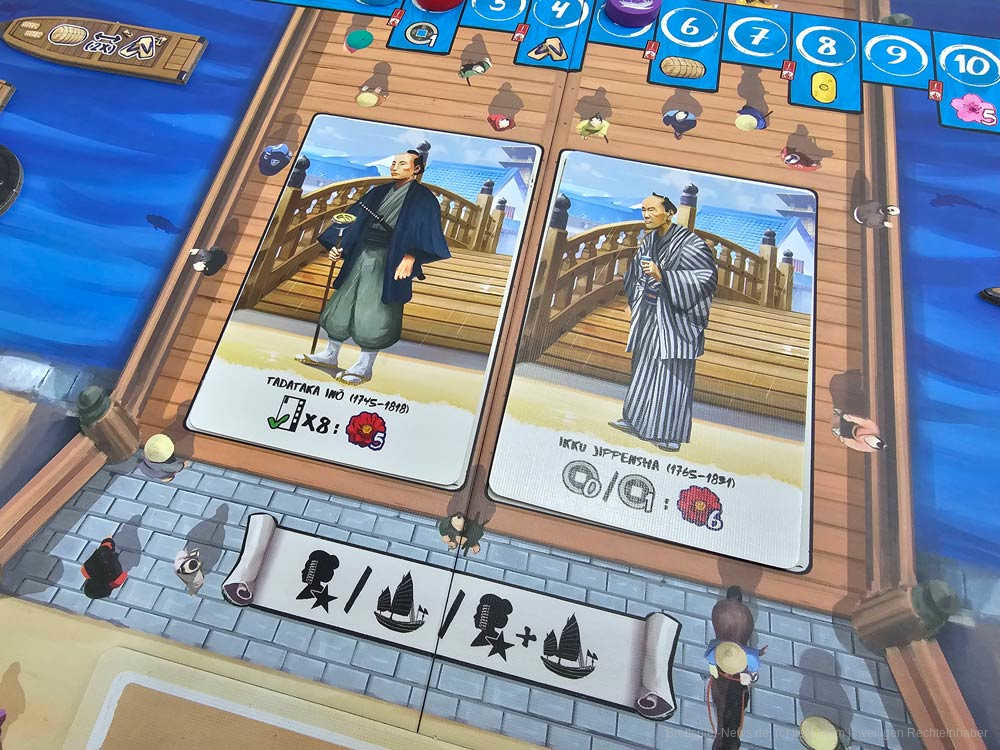 “Iki: Akebono“ führt einen neuen Ort ein, den es in Edo zu entdecken gibt: die Brücke von Nihonbashi, die die Hauptstraße erweitert und euch neue Möglichkeiten bietet. Ihr könnt an der Brücke anhalten, um berühmte Persönlichkeiten aus der Edo-Zeit (wie Hokusai Katsushika, Sanyo Rai oder Tokunai Mogami) zu treffen und mit den (von den Spielern und Spielerinnen gebauten) Schiffen im Fluss zu handeln.