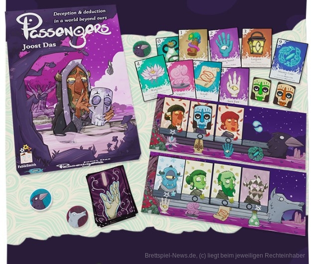 Das im Original bei Fablesmith 2022 erschienene Deduktionsspiel ist für Spielgruppen von 4 bis 8 Personen ab einem Alter von 12 Jahren. Die Überfahrt dauert etwa 45 Minuten. Wie bei seinen vorigen Titeln hat Autor Joost Das auch beim Design von „Passengers“ selbst Hand angelegt.