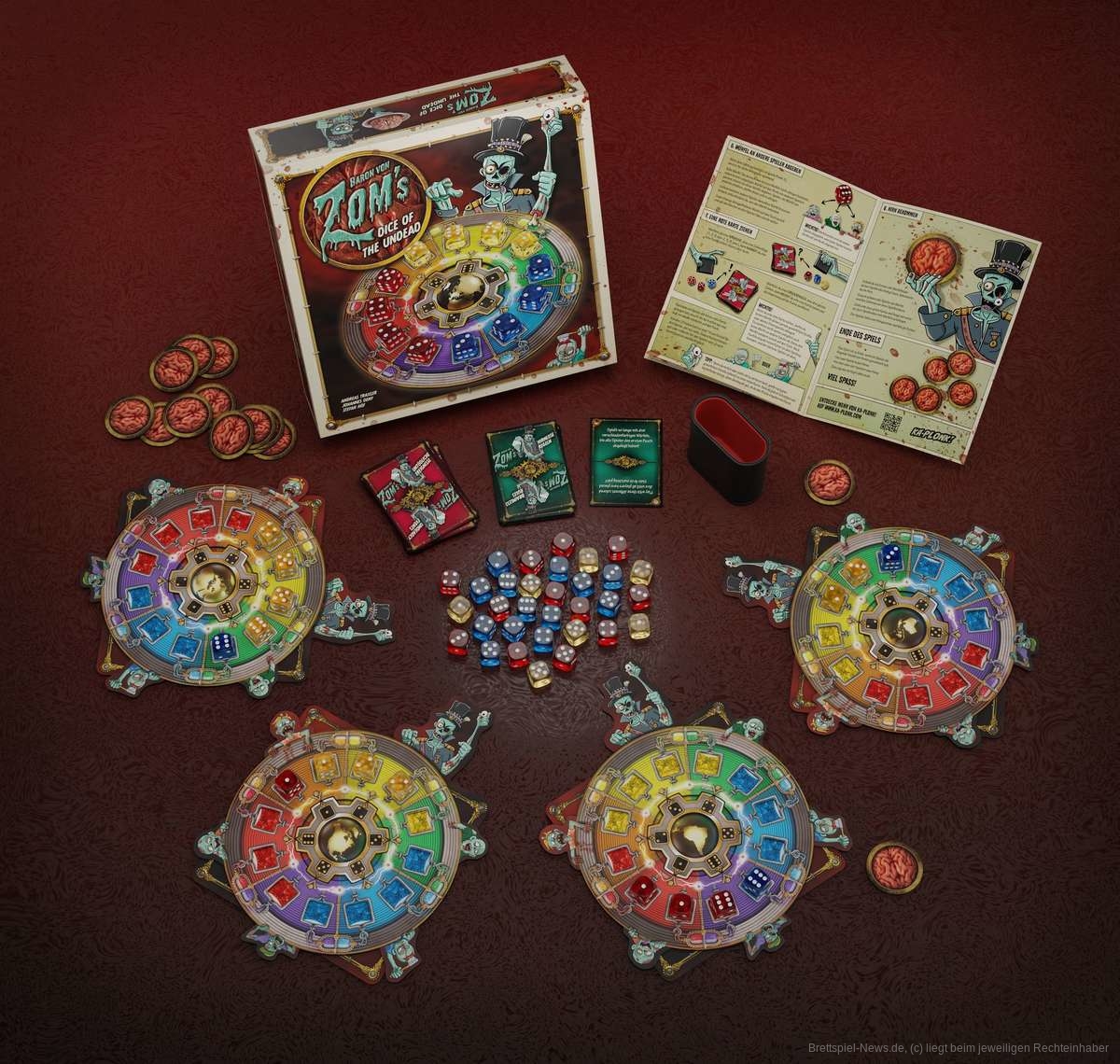 Baron von Zom und seine untoten Untertanen sind hungrig. Nur mit Hilfe fleißiger Würfelspieler und -spielerinnen können die Zombies das Portal zur Dimension der Lebenden durchqueren und sich endlich wieder richtig satt futtern. Wer zuerst zwölf Würfel mit der richtigen Zahl in der richtigen Farbe auf dem eigenen Spielbrett ablegen kann, öffnet das Portal. Als Belohnung winken frische Hirne!