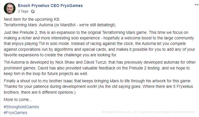 Enoch Fryxelius, CEO des Familienunternehmens FryxGames, zu dem auch seine Brüder Jacob, Isaac und Daniel gehören, verriet auf Facebook, dass sie zurzeit an einer speziellen Solo-Erweiterung für “Terraforming Mars” arbeiten. Hinter der Erweiterung steht diesmal nicht der Autor des Originalspiels Jacob Fryxelius, sondern Nick Shaw und Dávid Turczi, die bereits gemeinsam an den Solomodi für “Caesar!”, “Cerebria” und “Mythic Mischief” gearbeitet haben. Shaw hat außerdem letzten Sommer einen Solo-Bot für Terraforming Mars unter dem Namen MarsBot entwickelt, der als kostenloses Print-and-Play-Add-on veröffentlicht wurde.