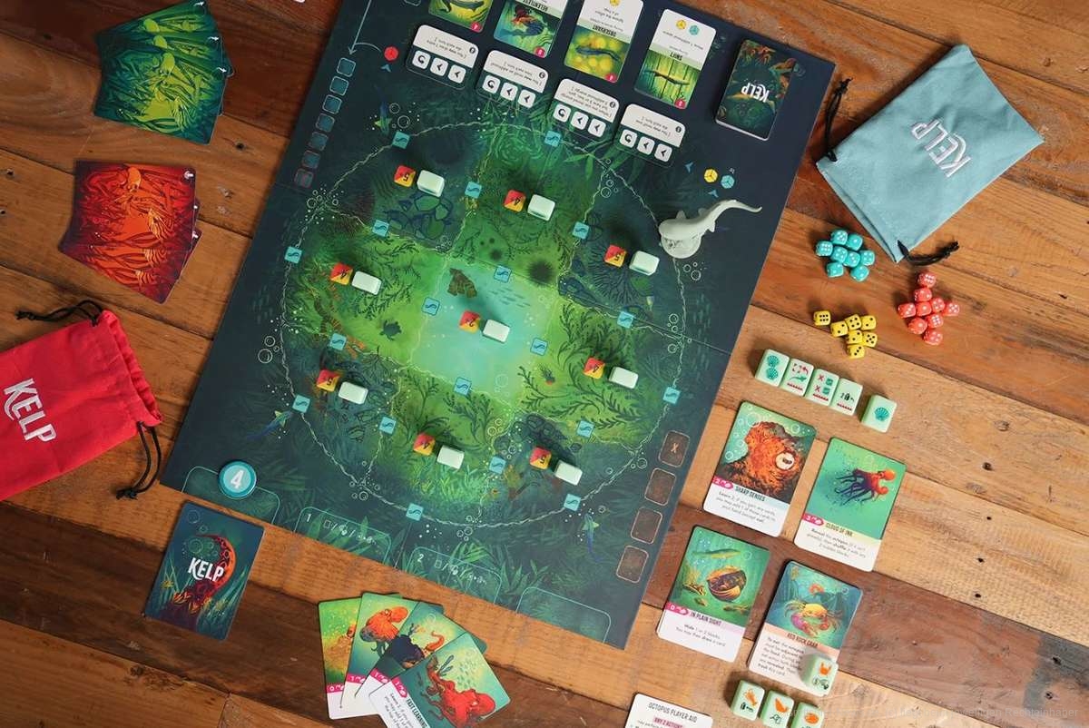 Kelp ist ein asymmetrisches Zwei-Personen-Spiel, in dem ihr jeweils in die Rolle eines Pyjamahaies oder eines Kraken schlüpft und um das Überleben in den Tiefen eines südafrikanischen Kelpwaldes (Tangwald) kämpft. Kelp dauert zwischen 45 – 60 Minuten und ist das Erstlingswerk von Autor Carl Robinson. Das herausstechende Artwork stammt von Illustrator Weberson Santiago (Coup, Heiße Hexenkessel, Fuji, La Famiglia).