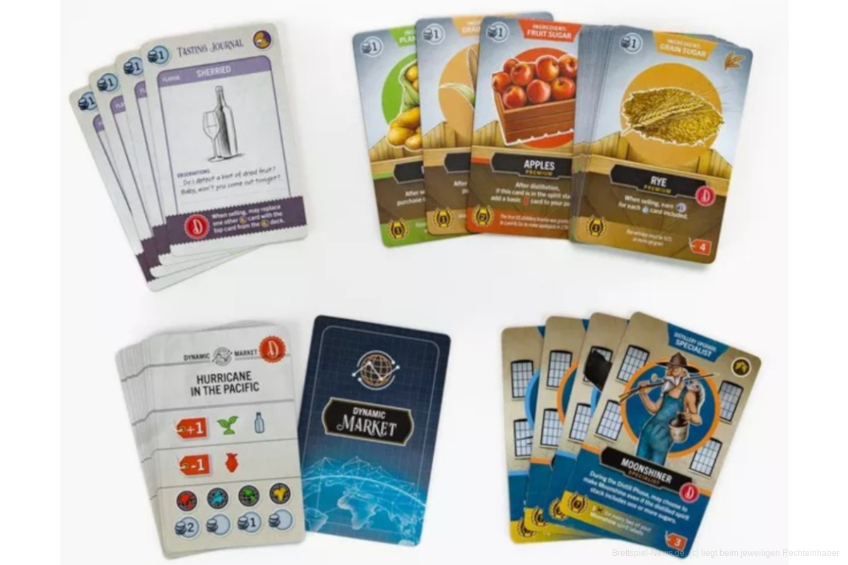 „Distilled“ ist ein thematisches, mittleres Eurogame für 1-5 Personen ab 14 Jahren, die ihre Destillerie und Spirituosen herstellen mit dem Ziel, das Familienunternehmen wieder aufzubauen. Zu Beginn habt ihr noch nicht viele Materialen. Auf dem Markt kauft ihr die Zutaten und das nötige Zubehör. Dabei gilt, je hochwertiger die Materialen desto besser das Produkt. Qualität hat aber natürlich ihren Preis und so müsst ihr sowohl euer Einkommen wie auch euren Ruf im Auge behalten, denn die Konkurrenz schläft nicht.