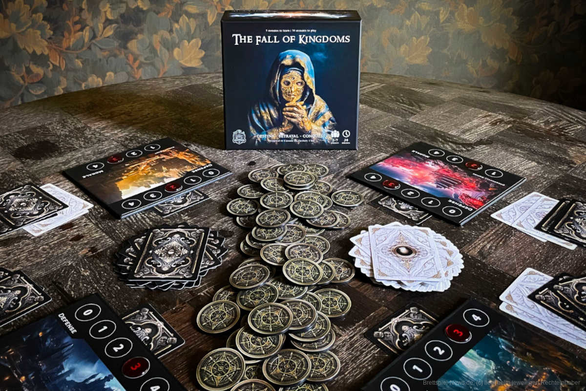 Der hohe Rat wurde ausgelöscht, das Vertrauen zwischen den Ländern ist zunichte gemacht, nun ist sich jeder selbst der nächste. „The Fall of Kingdoms” transportiert die Spieler in eine Fantasiewelt, in welcher sie als Herrscher über eines von sieben Ländern nach absoluter Macht streben. Eine Runde dauert ca. 20-40 Minuten. Ziel ist es, die anderen Länder zu vernichten und als letzter zu triumphieren. Hierzu verwaltet man die eigene Verteidigung und Moral, nutzt die Fähigkeiten von Charakterkarten, Schicksalskarten und Taktikaktionen.