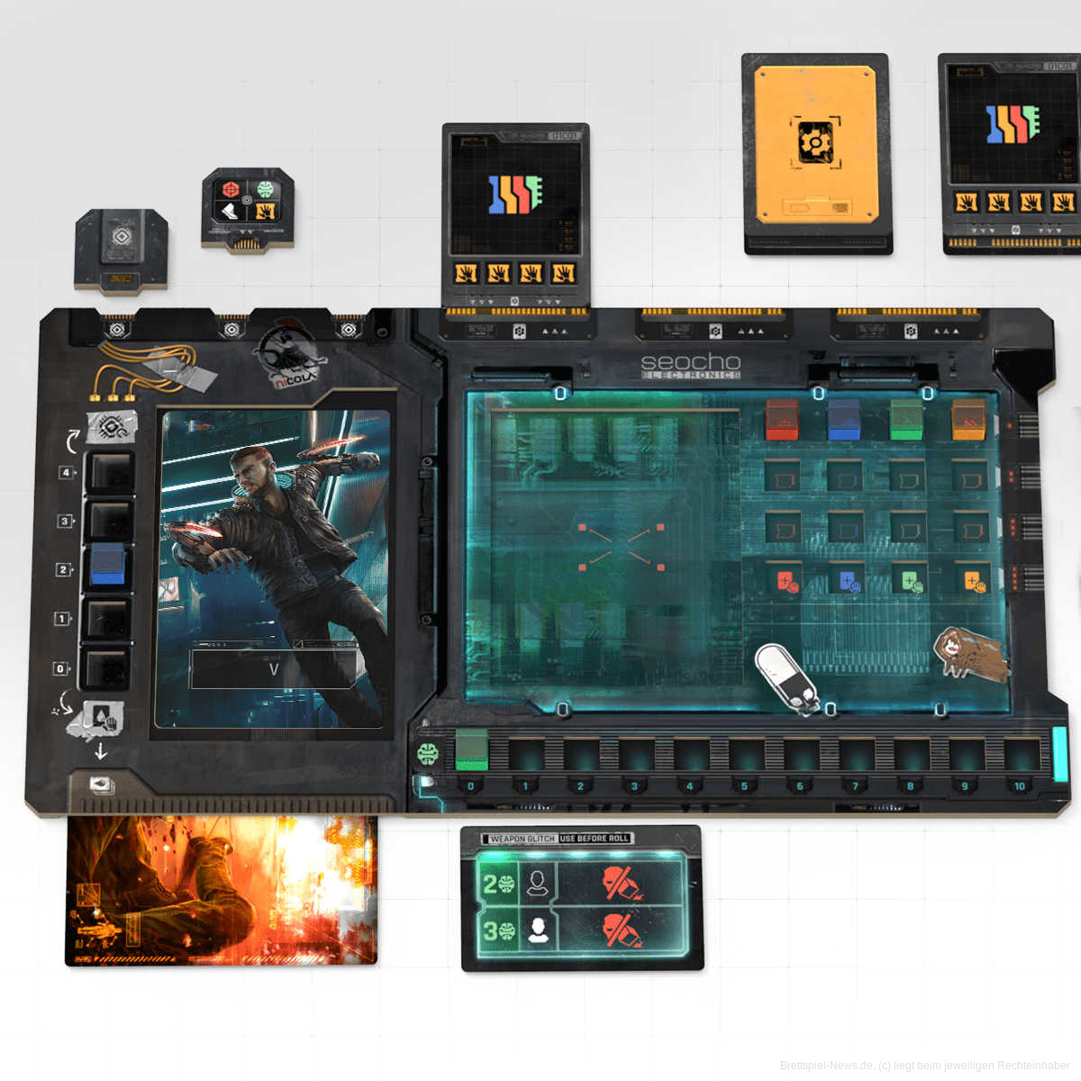 Ein Kernelement des Spiels ist die Charakterentwicklung. Mit Hilfe eures „Cyberdecks“ rüstet ihr euch mit Waffen oder Cyberimplantaten aus. Die Symbole auf den Karten triggern unterschiedliche Aktionsmöglichkeiten, wie Bewegung oder Interaktion.