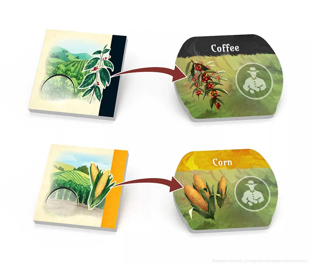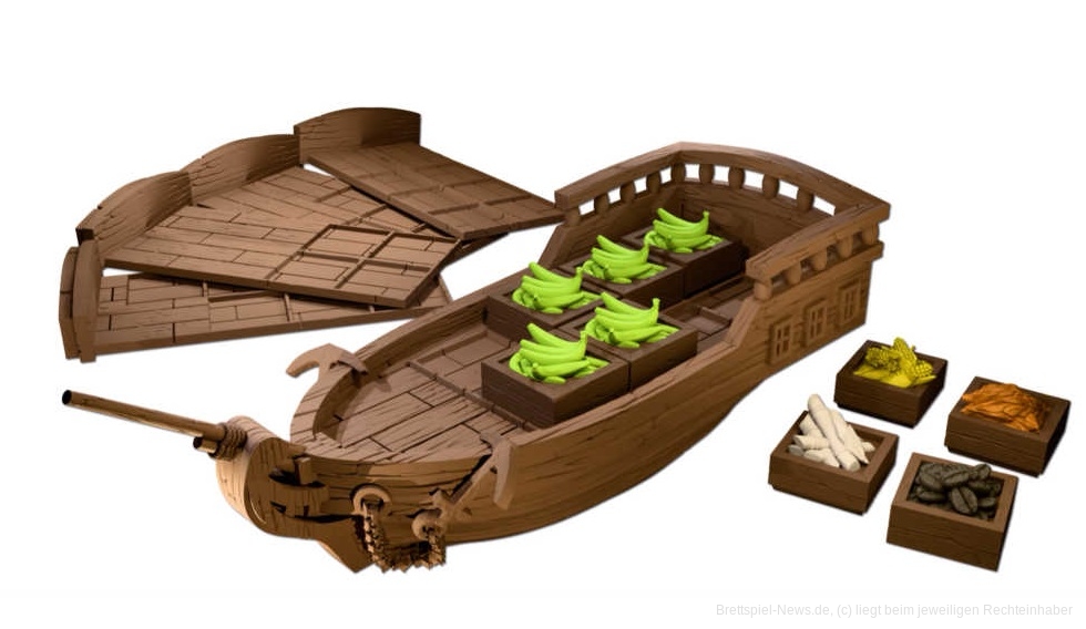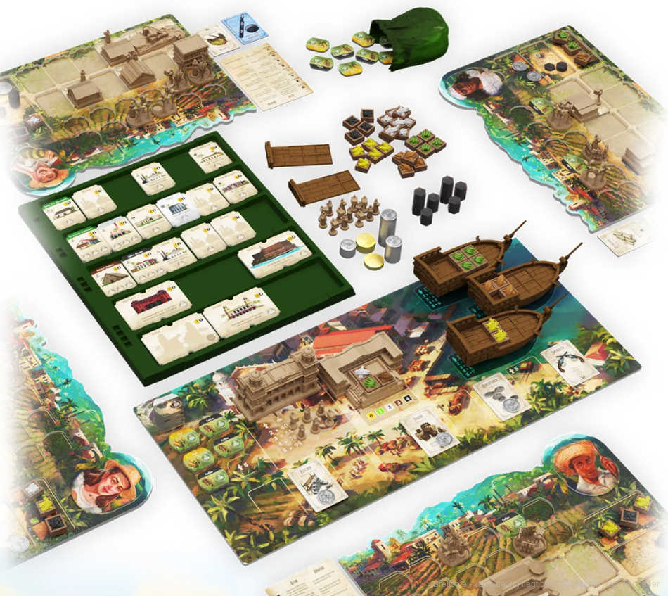Jeder Spieler verwendet ein eigenes kleines Spielbrett, auf dem Plätze für Stadtgebäude, Plantagen und Ressourcen vorgesehen sind. Gemeinsame Elemente sind drei Schiffe, ein Handelsplatz und eine Ressourcenvorrat.