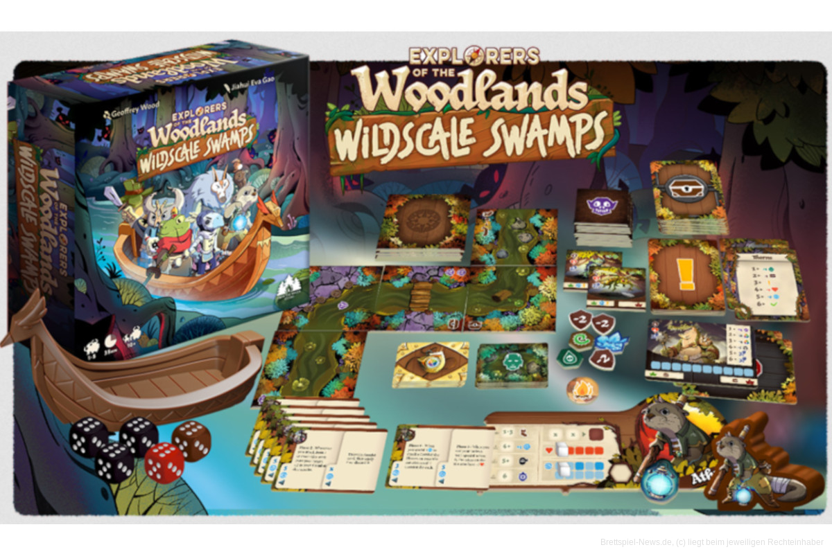 Die Erweiterung „Die Waldlande: Wildscale Swamps“ liefert euch nun einen neuen Helden, damit ihr zu fünft spielen könnt, neue Szenarien, Spielmodi und einen Fluss. Passend dazu darf ein Boot nicht fehlen. Außerdem ist eine überarbeitete Anleitung des Grundspiels mit im Paket.